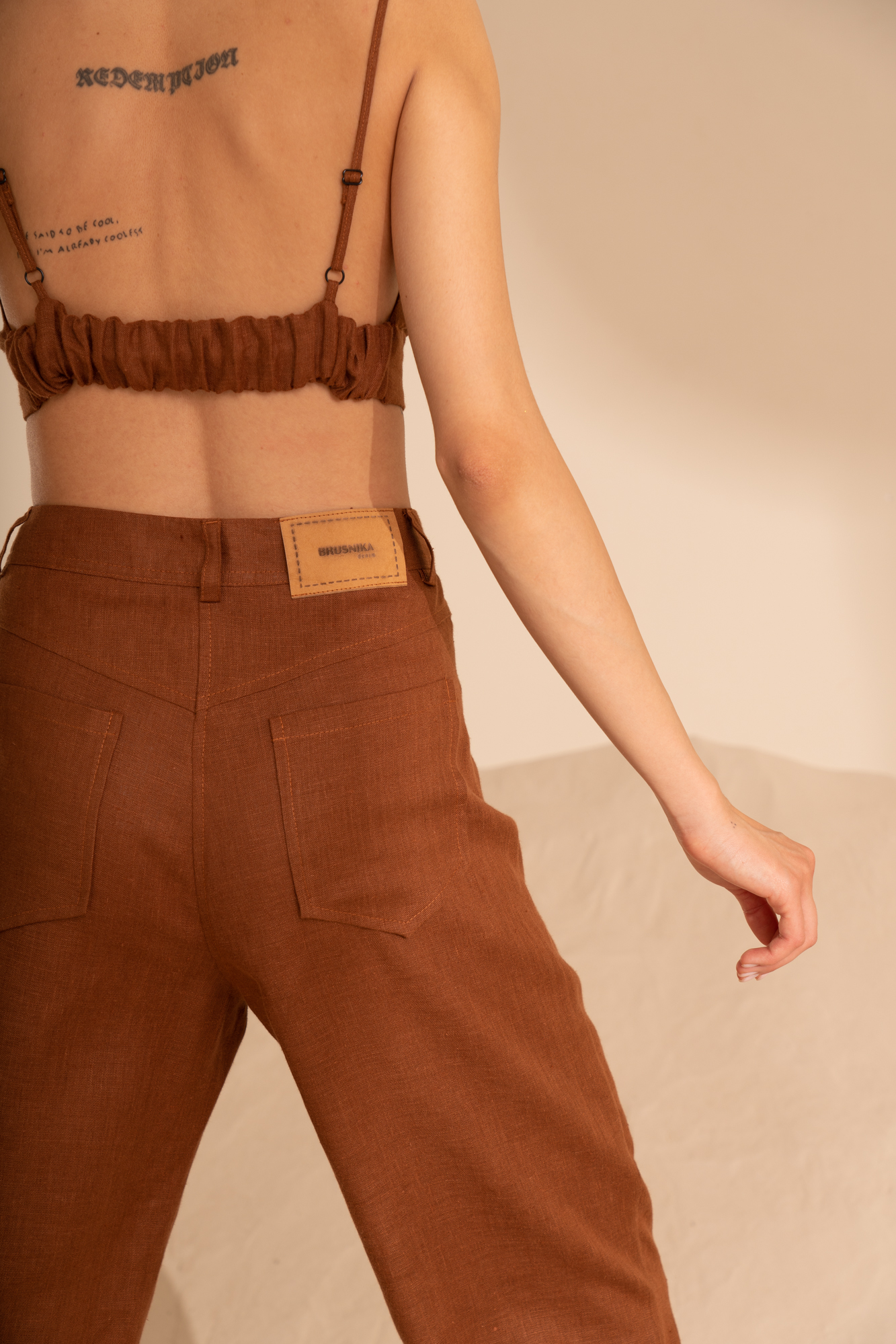 Льняной кроп-топ с регулируемыми лямками, на спине эластичная резинка.