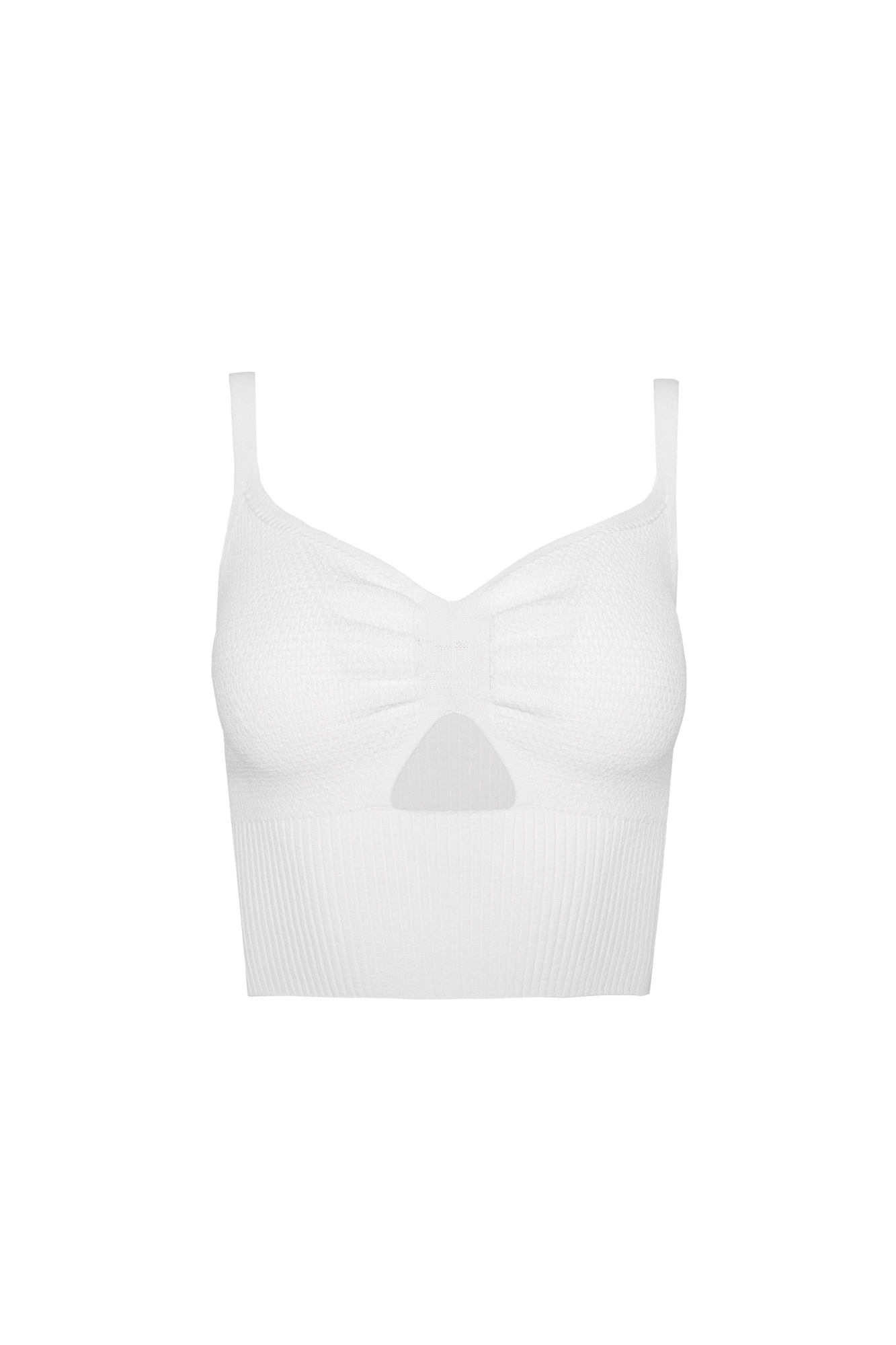 Укороченный трикотажный топ на лямках из вискозы. Вырез треугольником спереди.