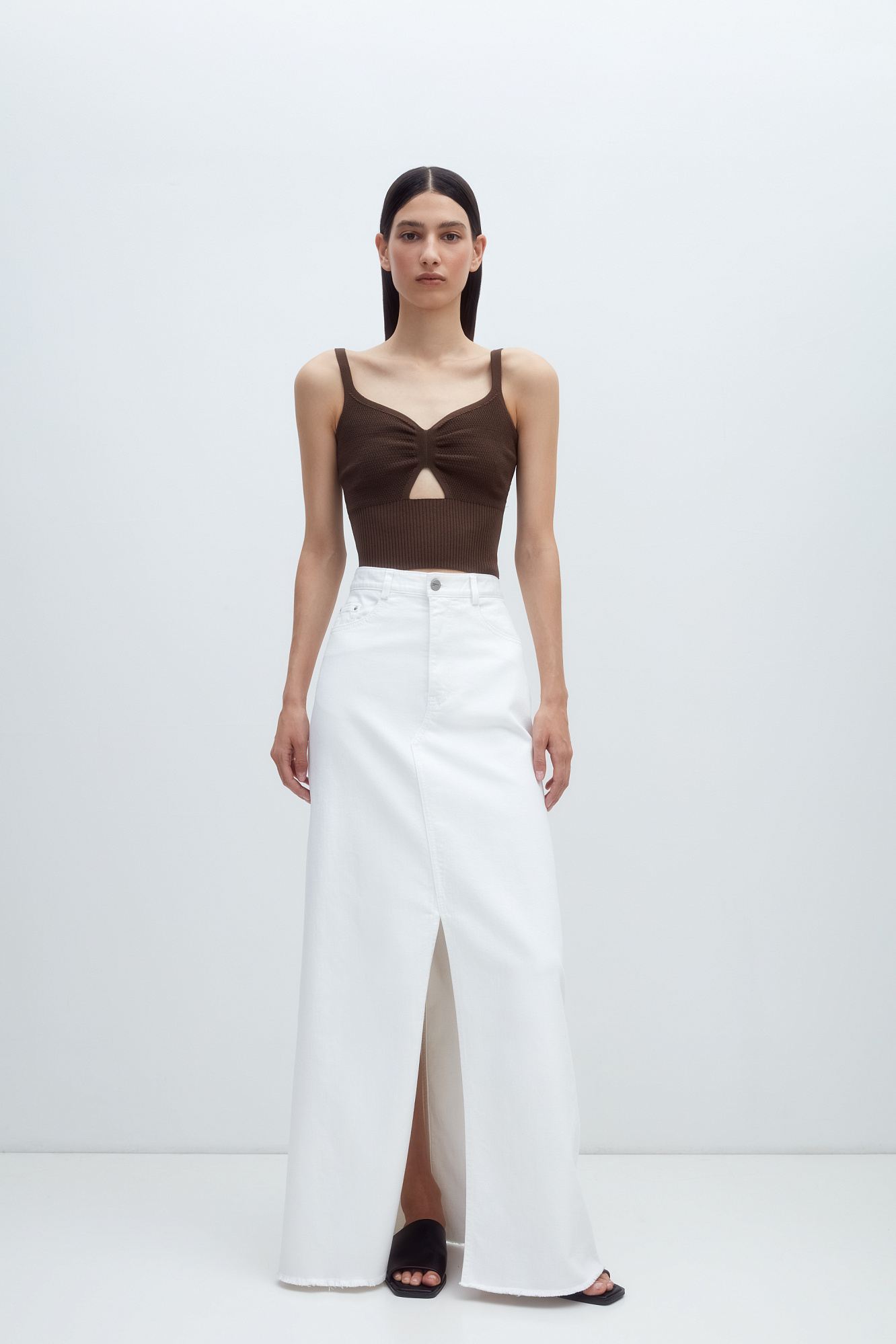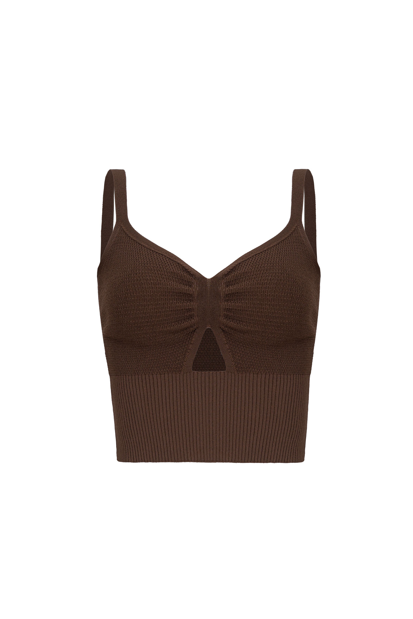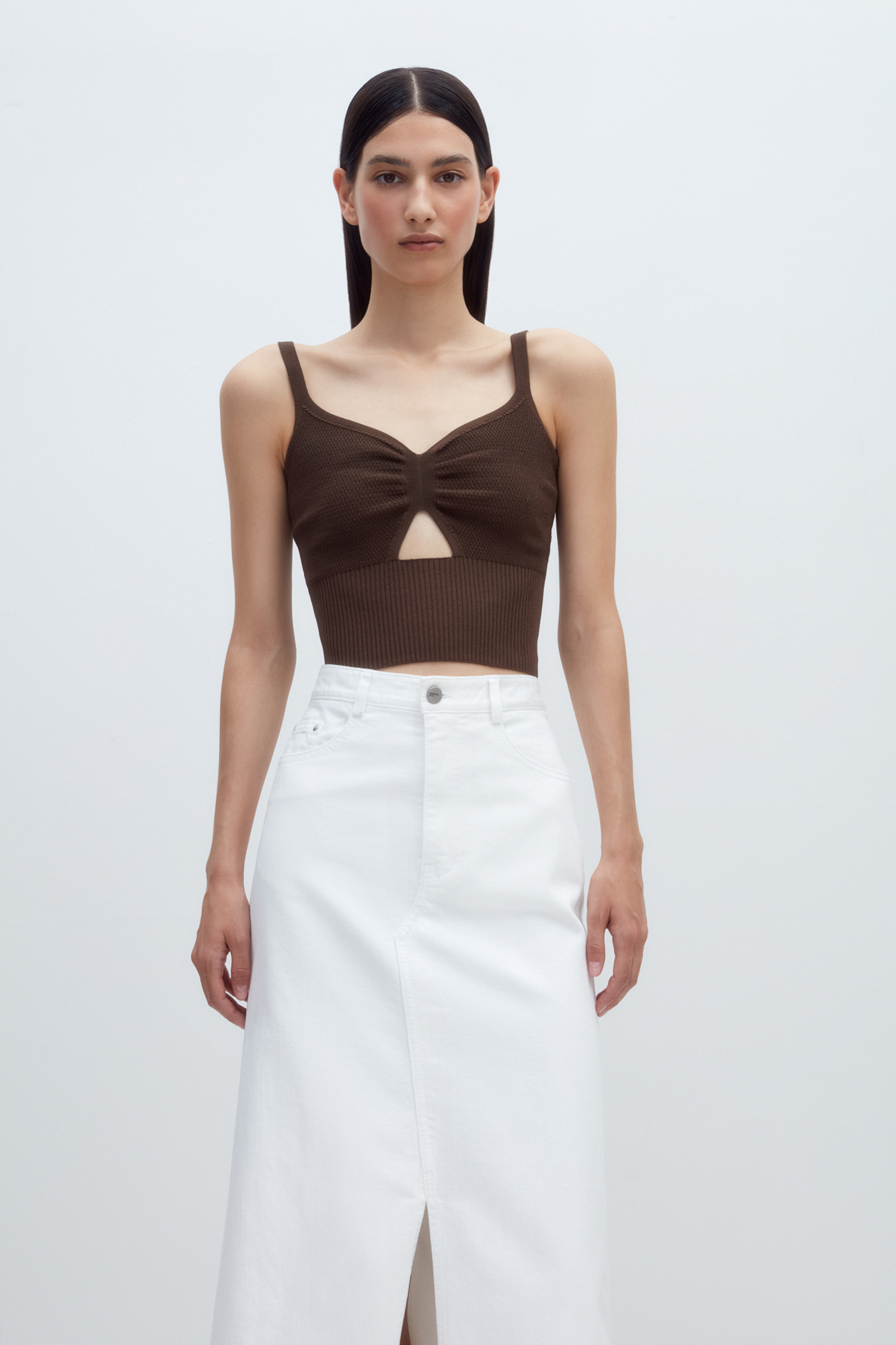 Укороченный трикотажный топ на лямках из вискозы. Вырез треугольником спереди.