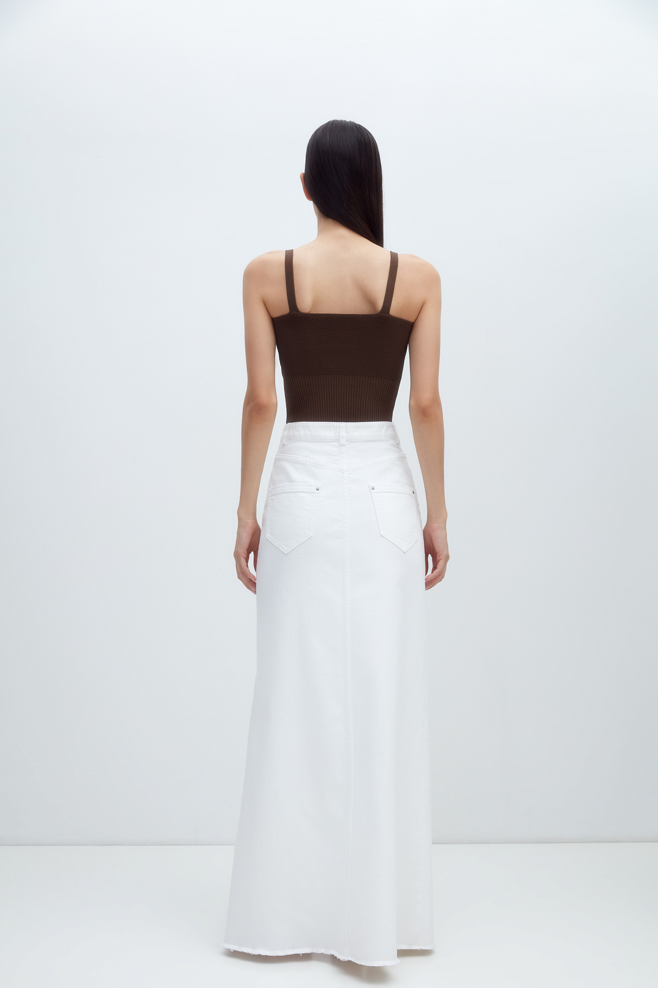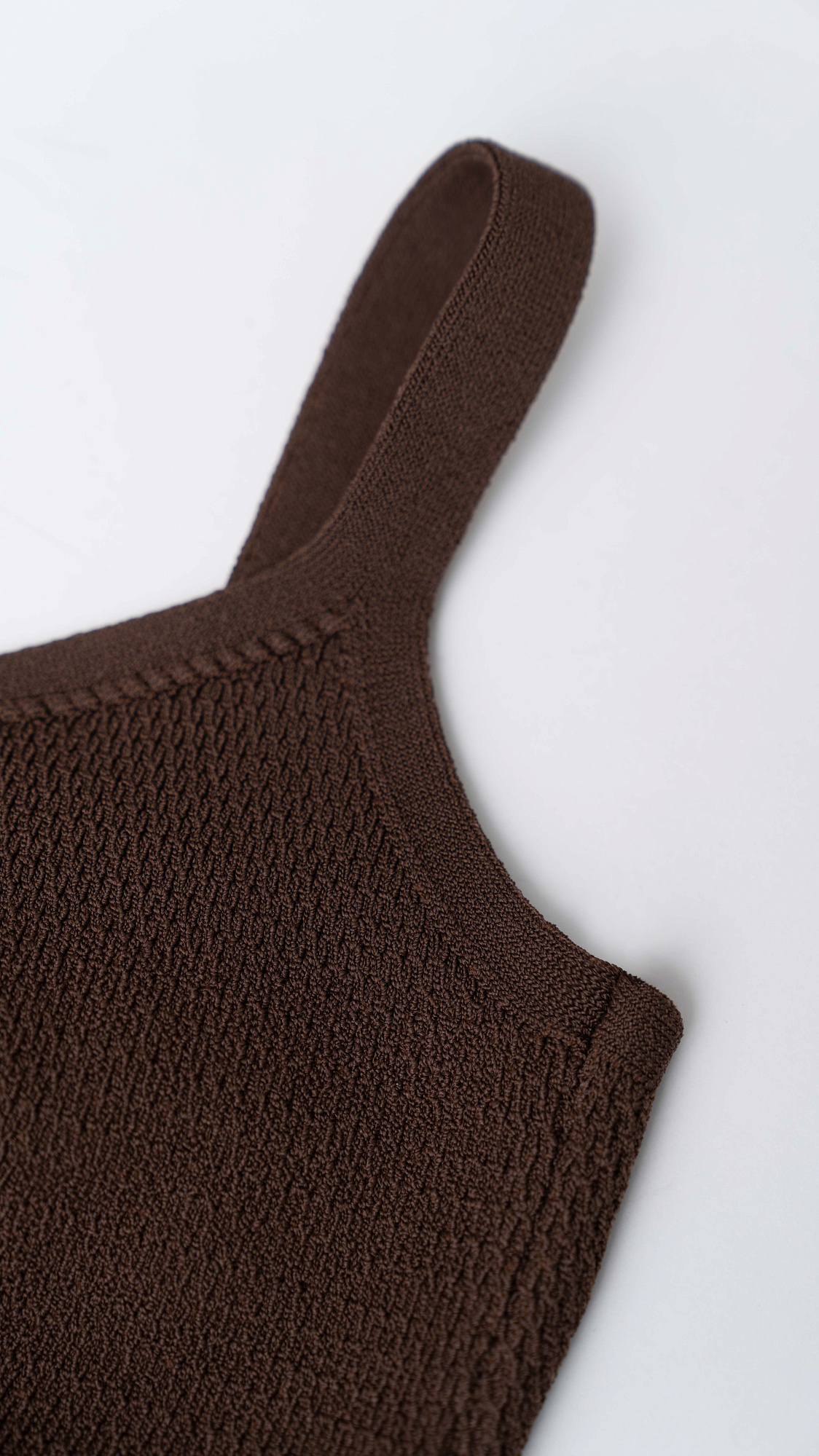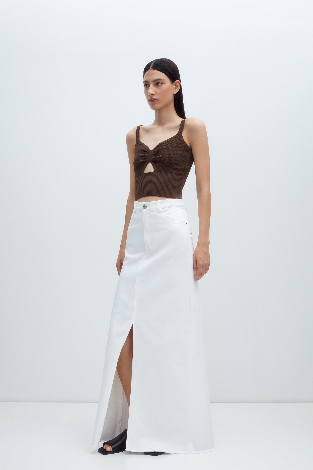 Укороченный трикотажный топ на лямках из вискозы. Вырез треугольником спереди.