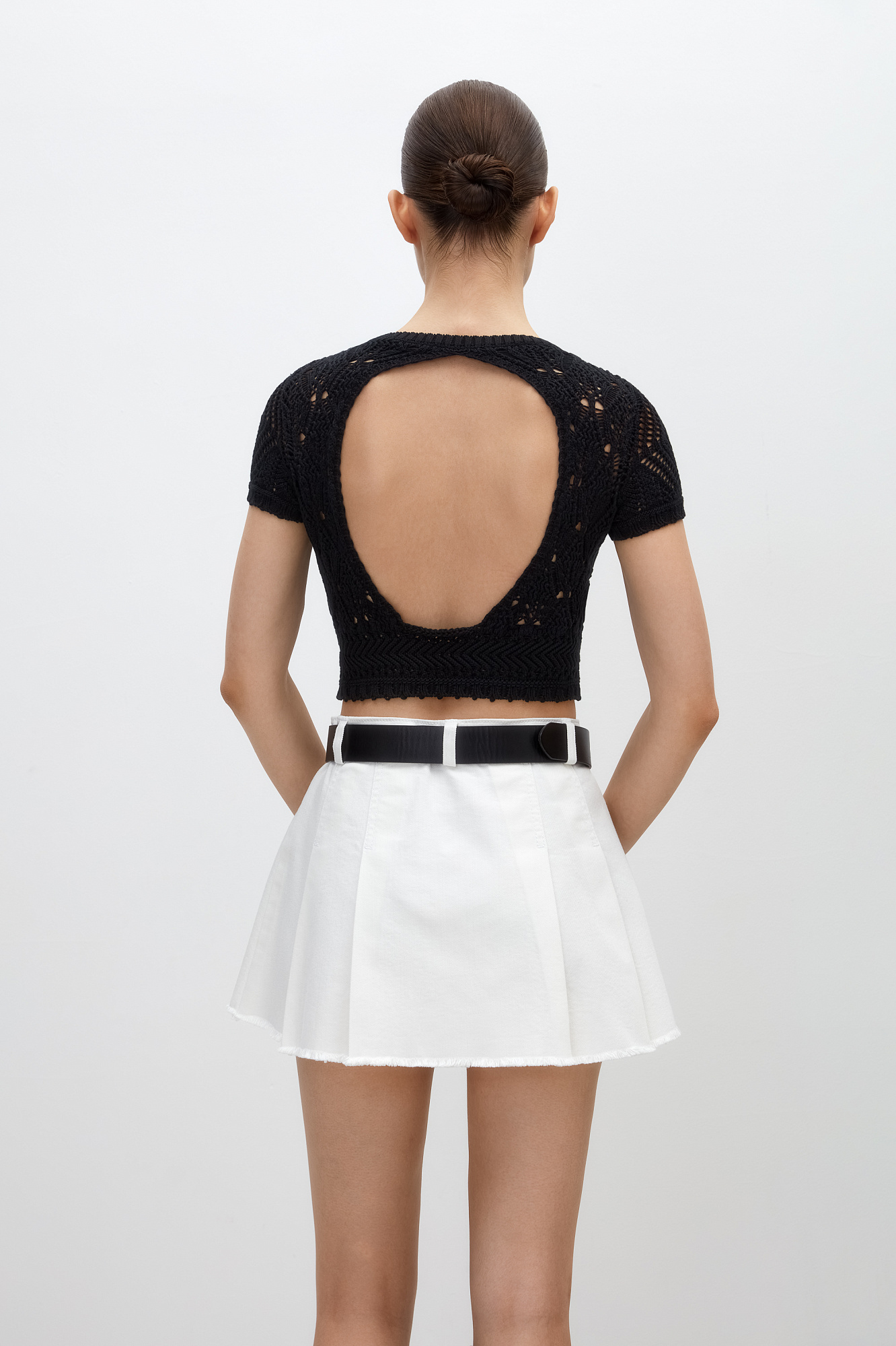 Трикотажный ажурный топ из хлопка с добавлением эластана. Модель с короткими рукавами и открытой спиной.