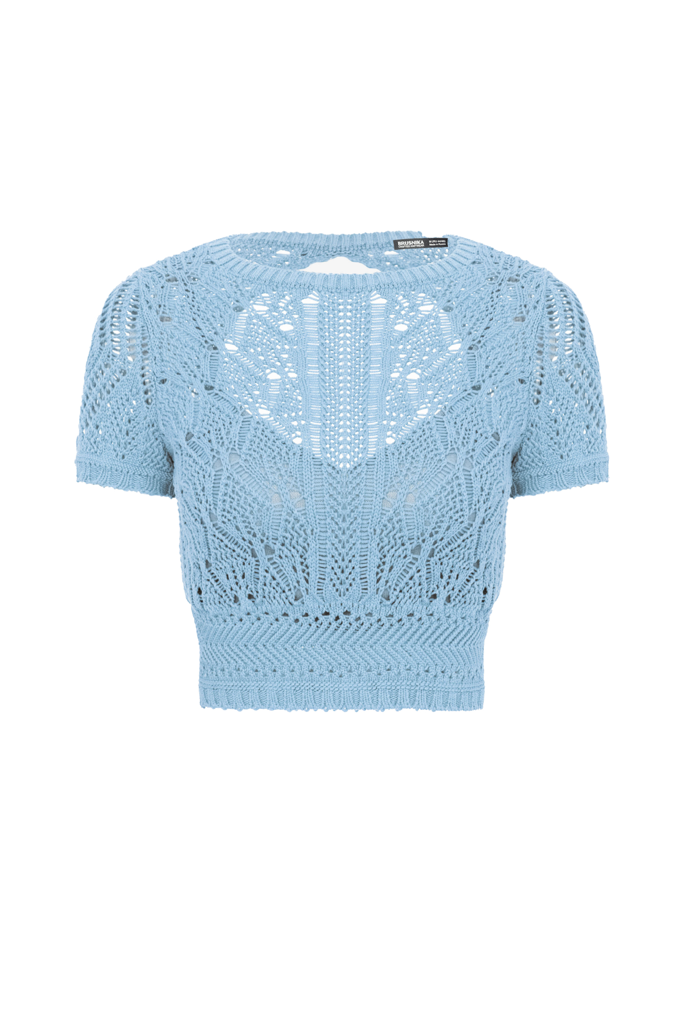 Трикотажный ажурный топ из хлопка с добавлением эластана. Модель с короткими рукавами и открытой спиной.