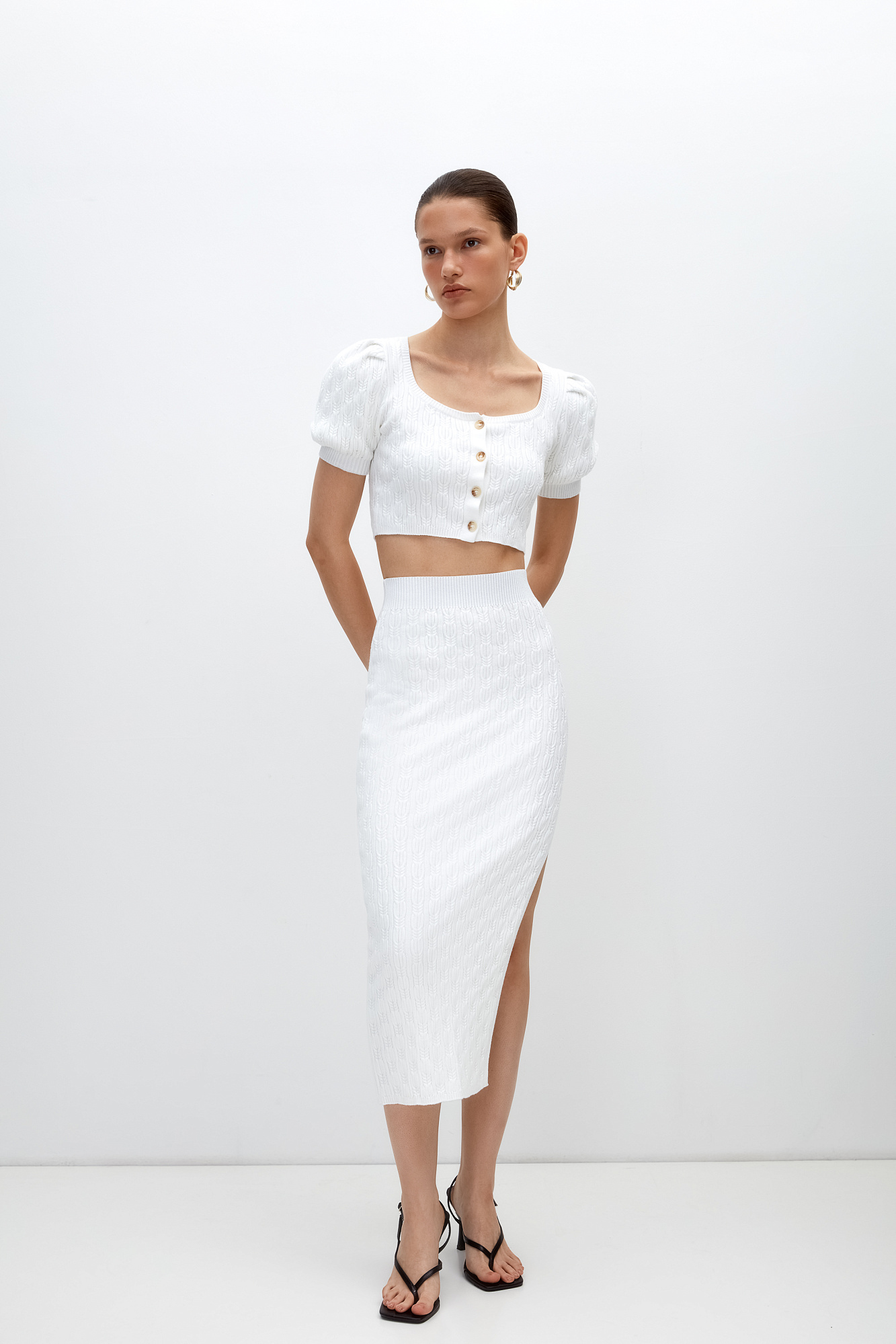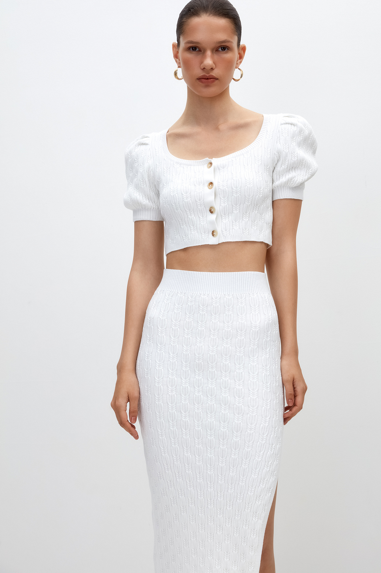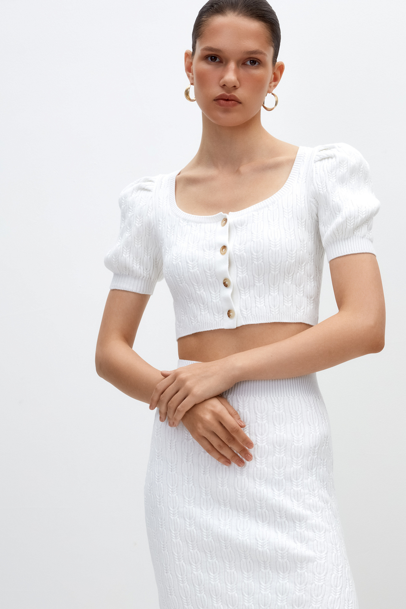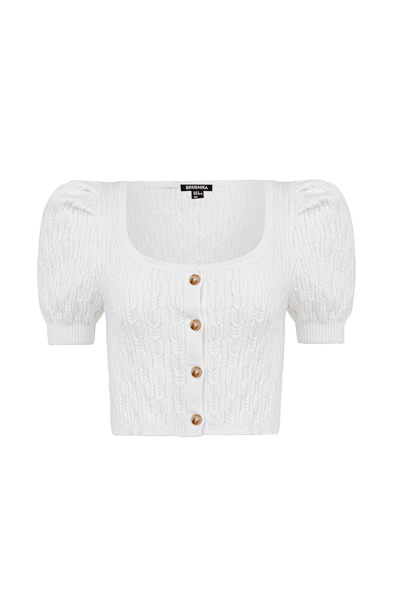 Трикотажный топ из хлопка с добавлением вискозы. Короткие рукава-фонарики и застежка на пуговицах.
