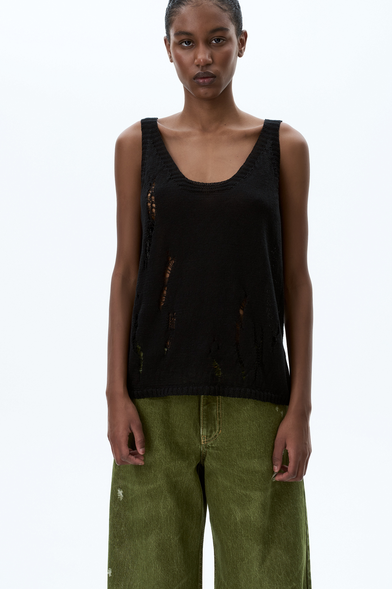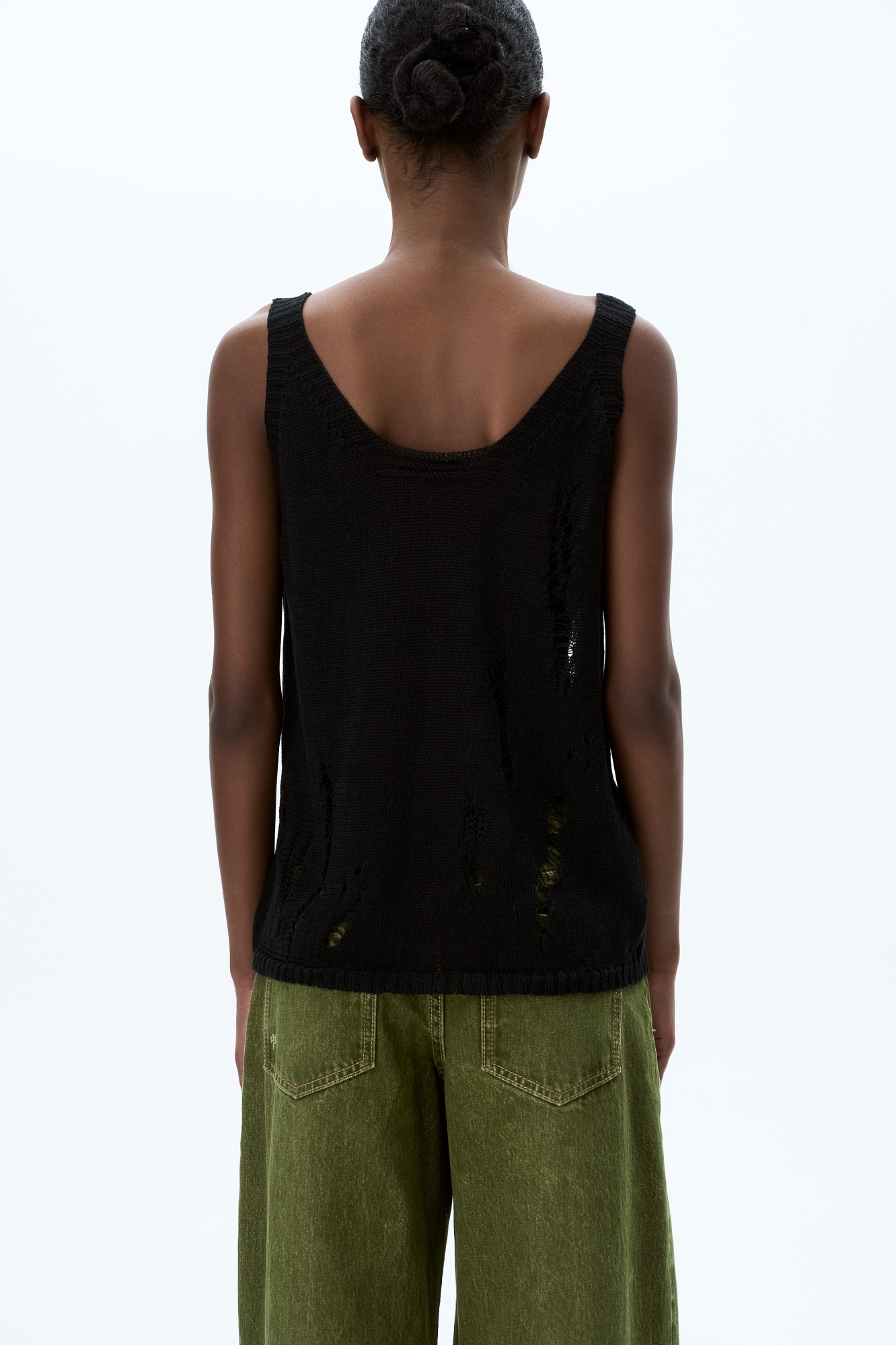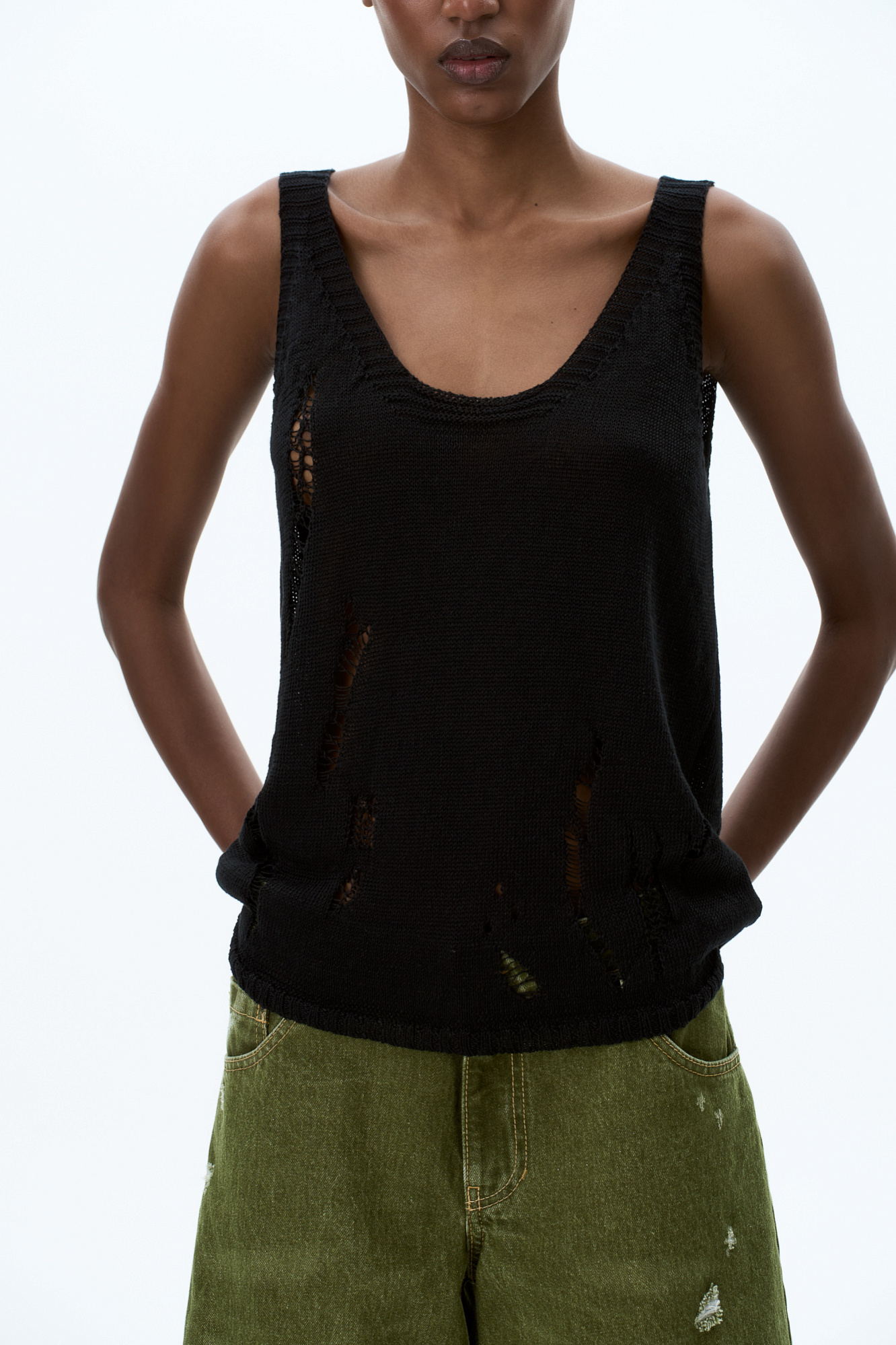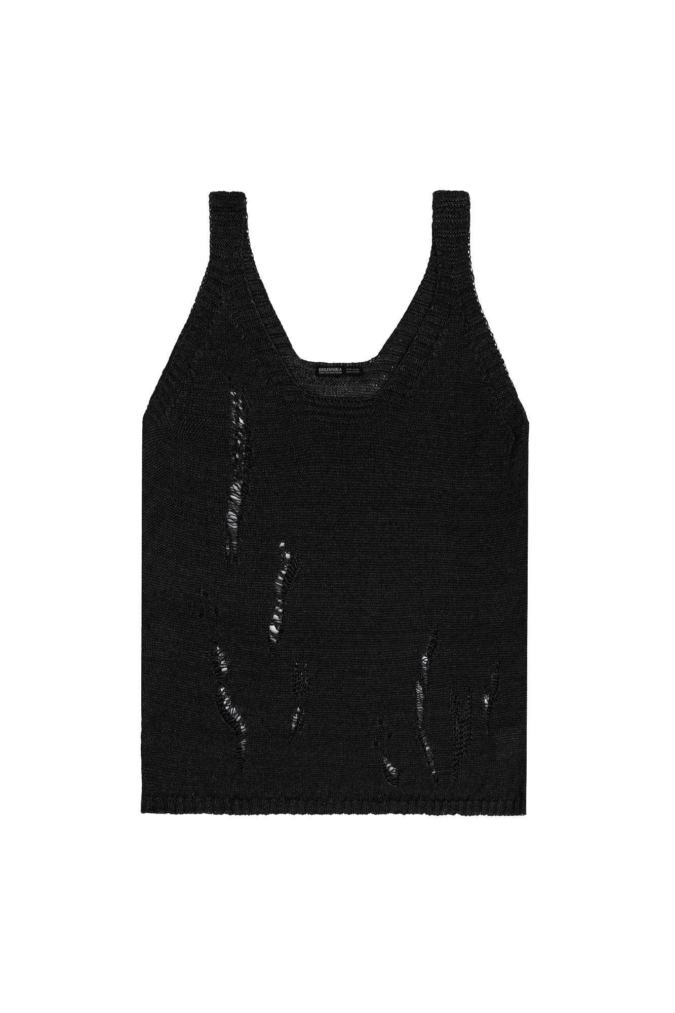 Трикотажный топ из 100% льна. Модель свободного силуэта, с глубокой проймой и U-вырезом горловины. Изделие выполнено с эффектом рвани.