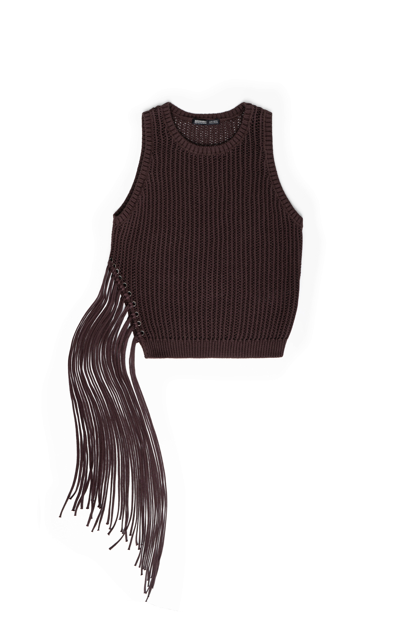 Трикотажный ажурный топ из 100% хлопка. Модель прямого силуэта, без рукавов, с круглым вырезом горловины. Изделие декорировано длинной бахромой и люверсами.