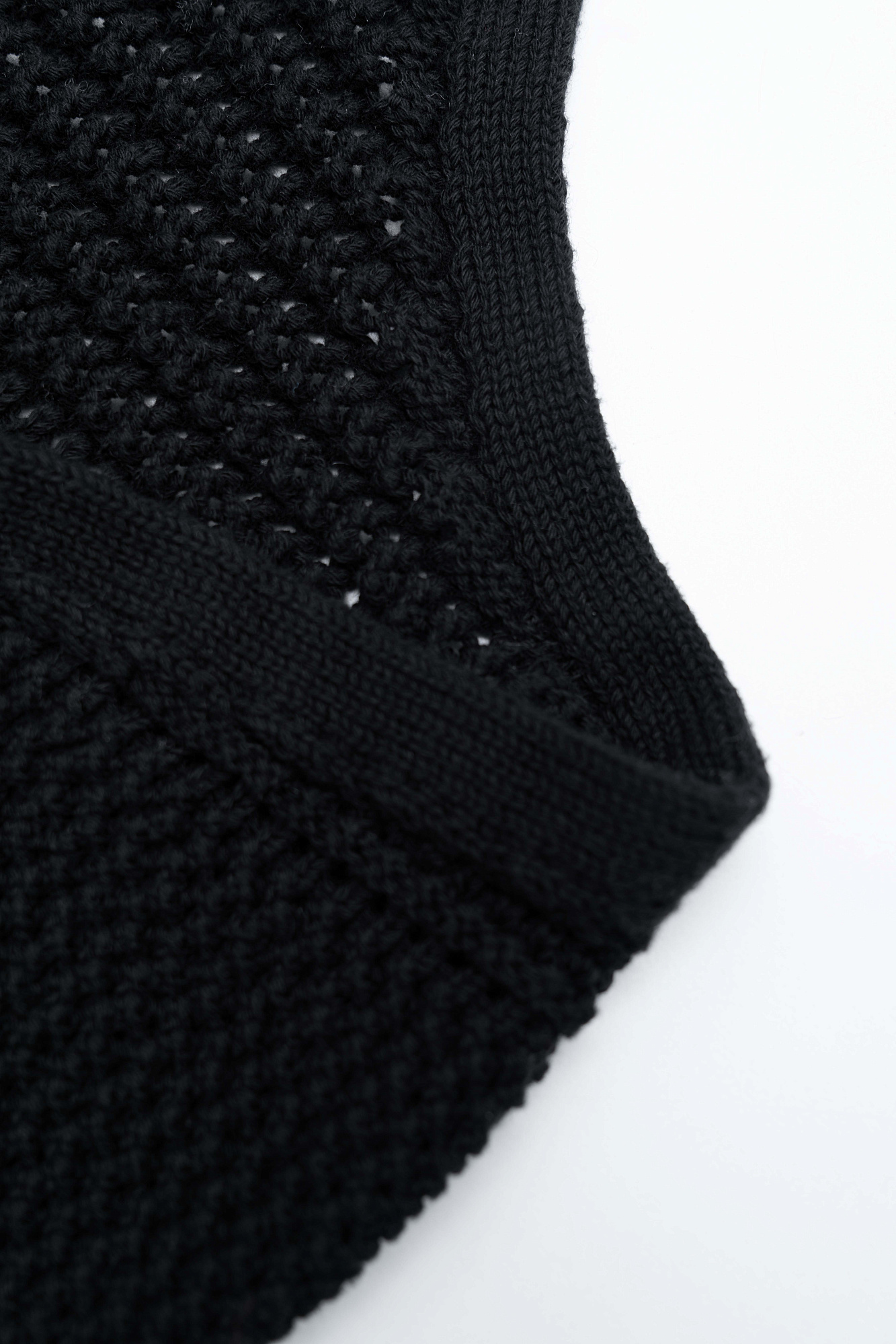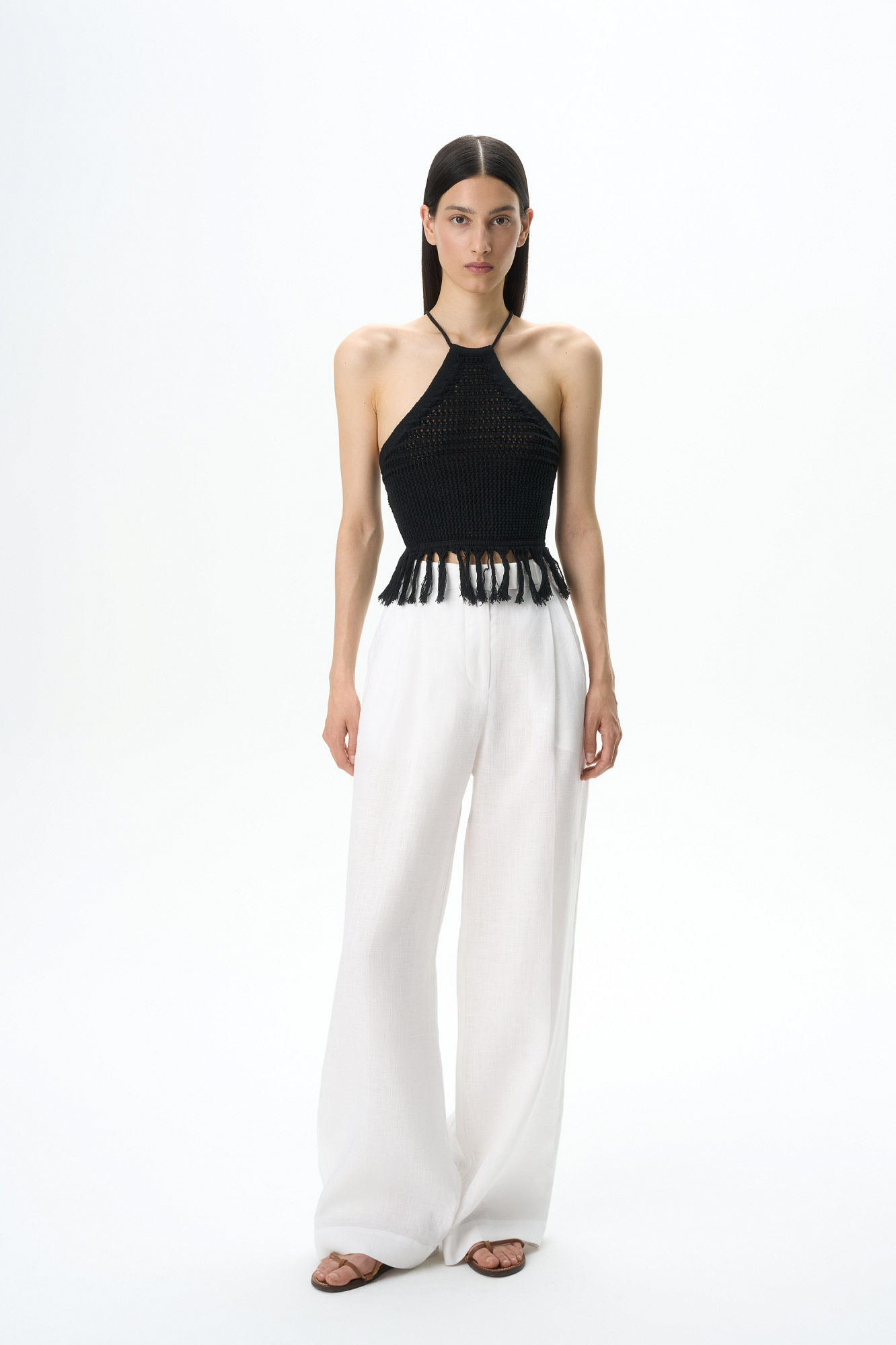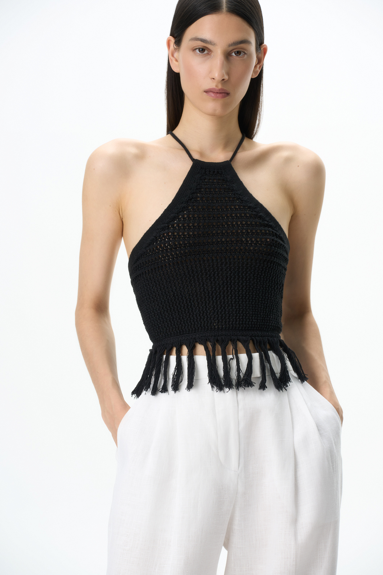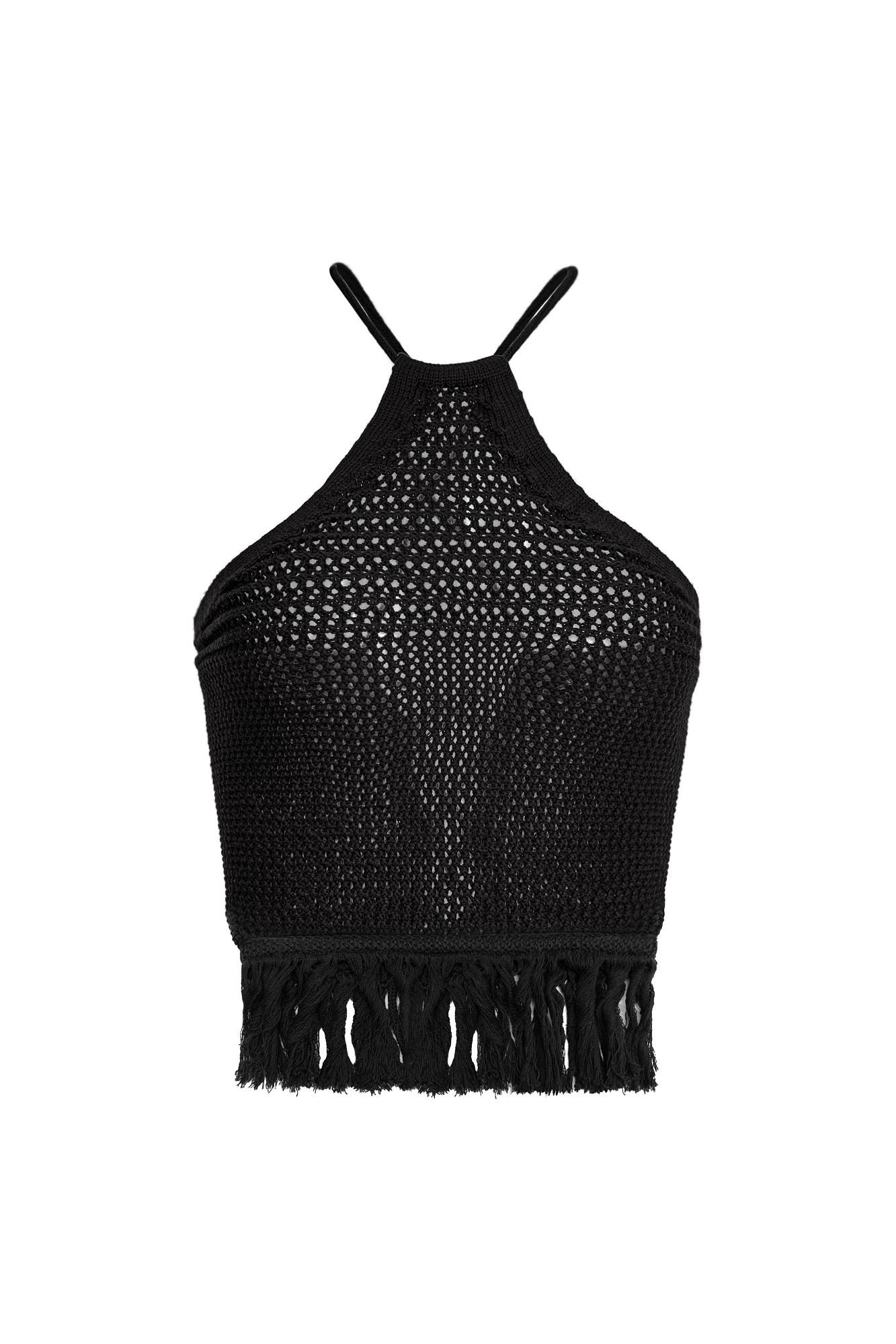 Трикотажный ажурный топ из 100% хлопка. Модель без рукавов, с открытой линией плеч, на тонких бретелях и шнуровкой на спине. Изделие декорировано бахромой по нижнему краю.