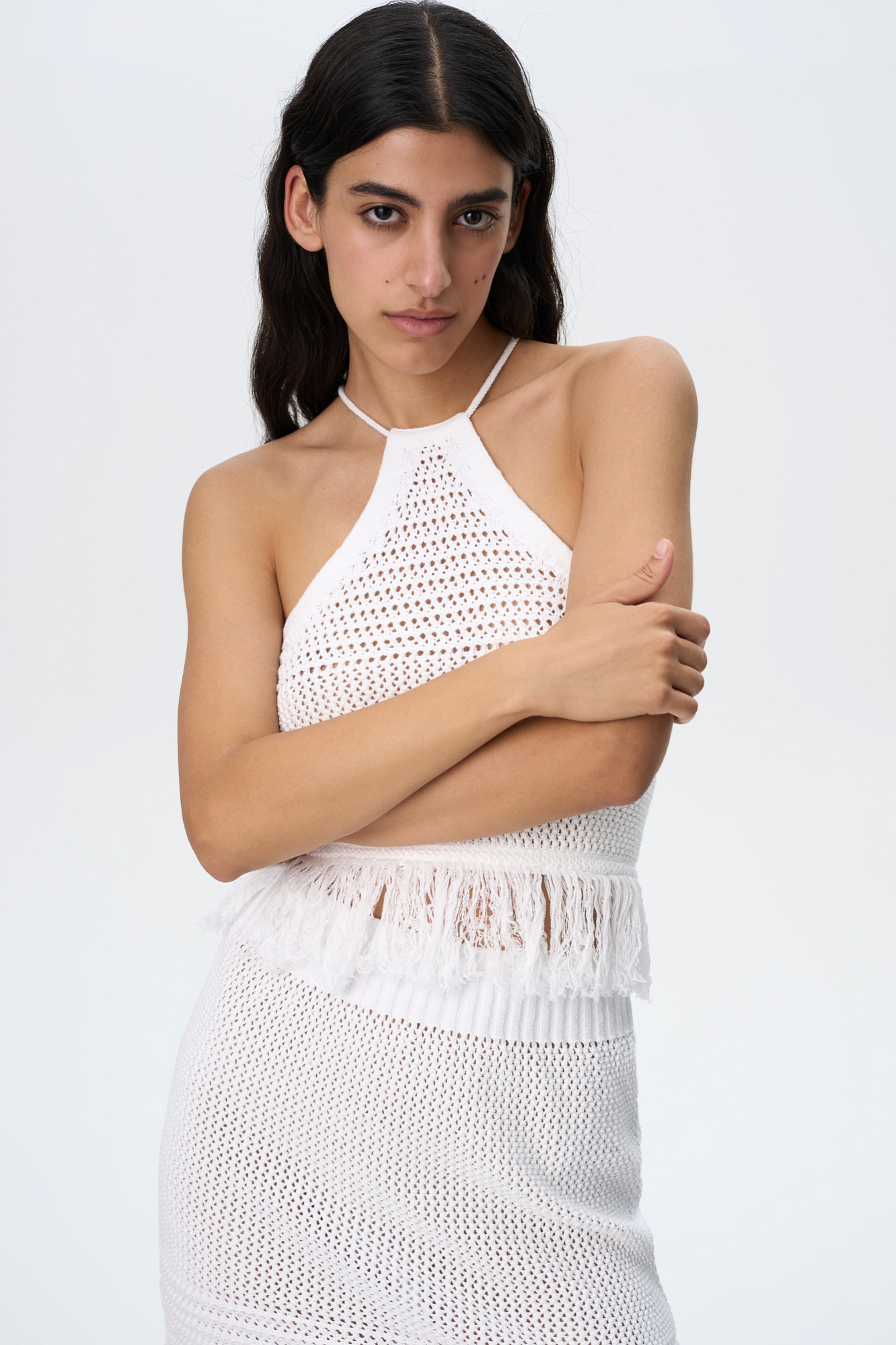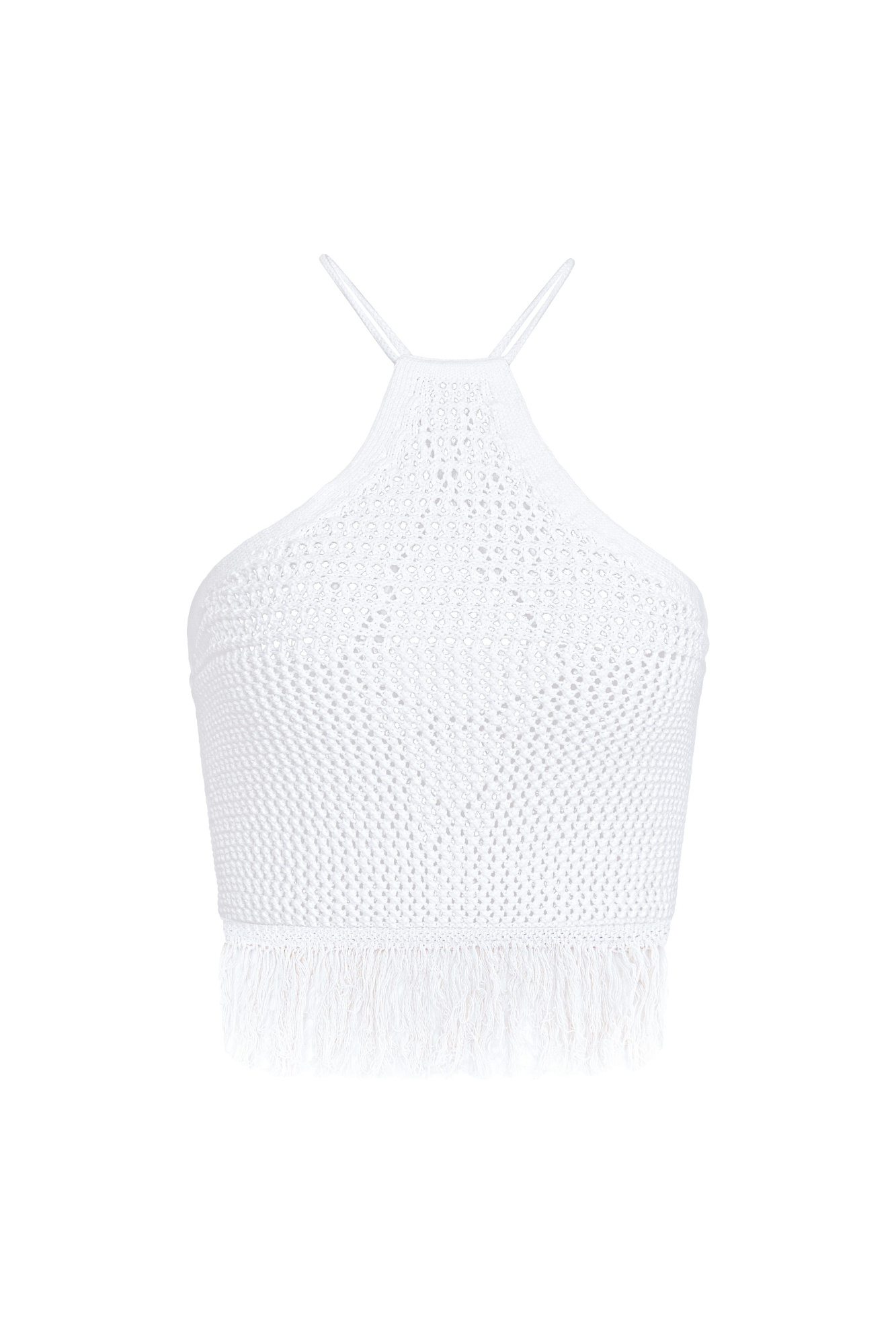 Трикотажный ажурный топ из 100% хлопка. Модель без рукавов, с открытой линией плеч, на тонких бретелях и шнуровкой на спине. Изделие декорировано бахромой по нижнему краю.
