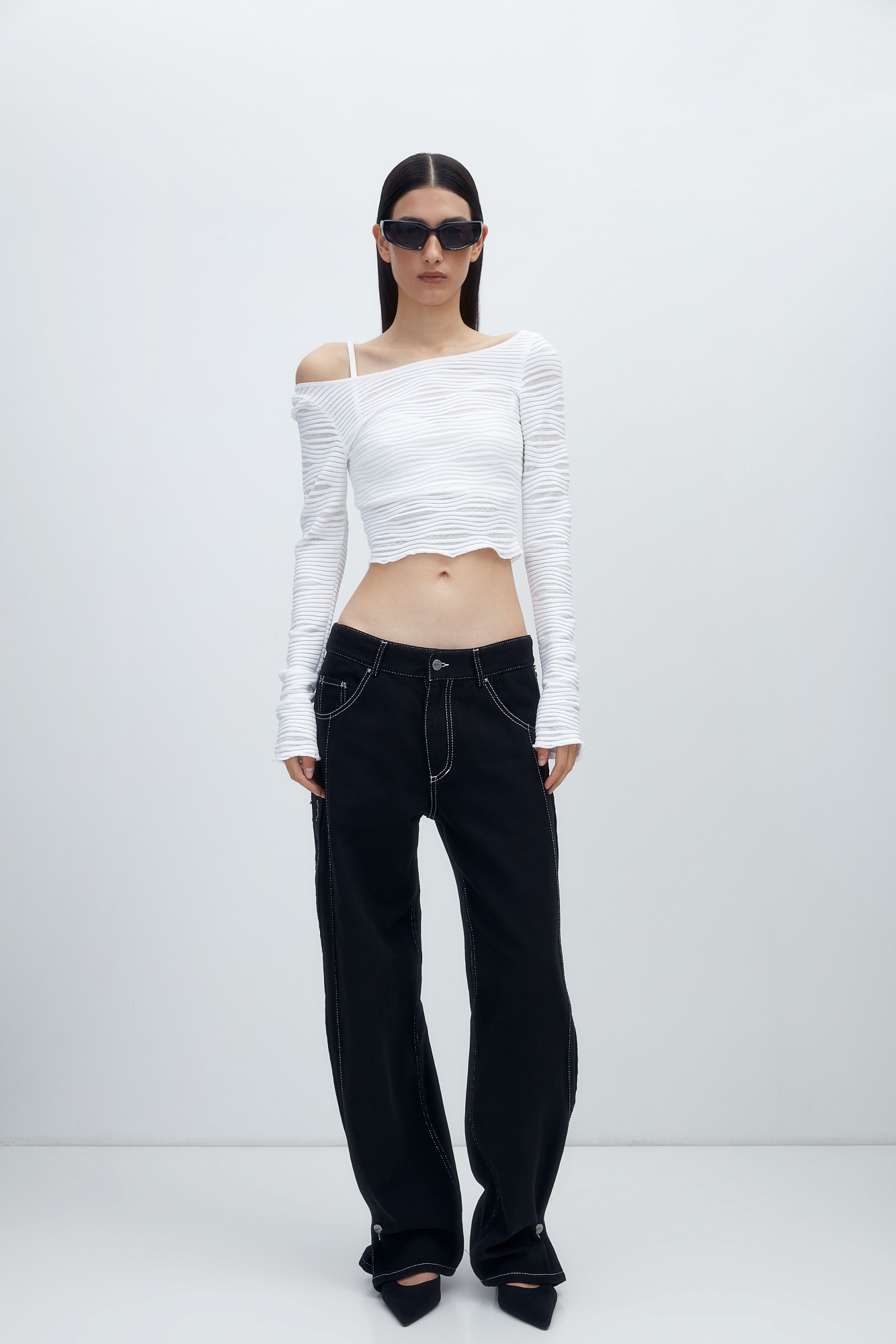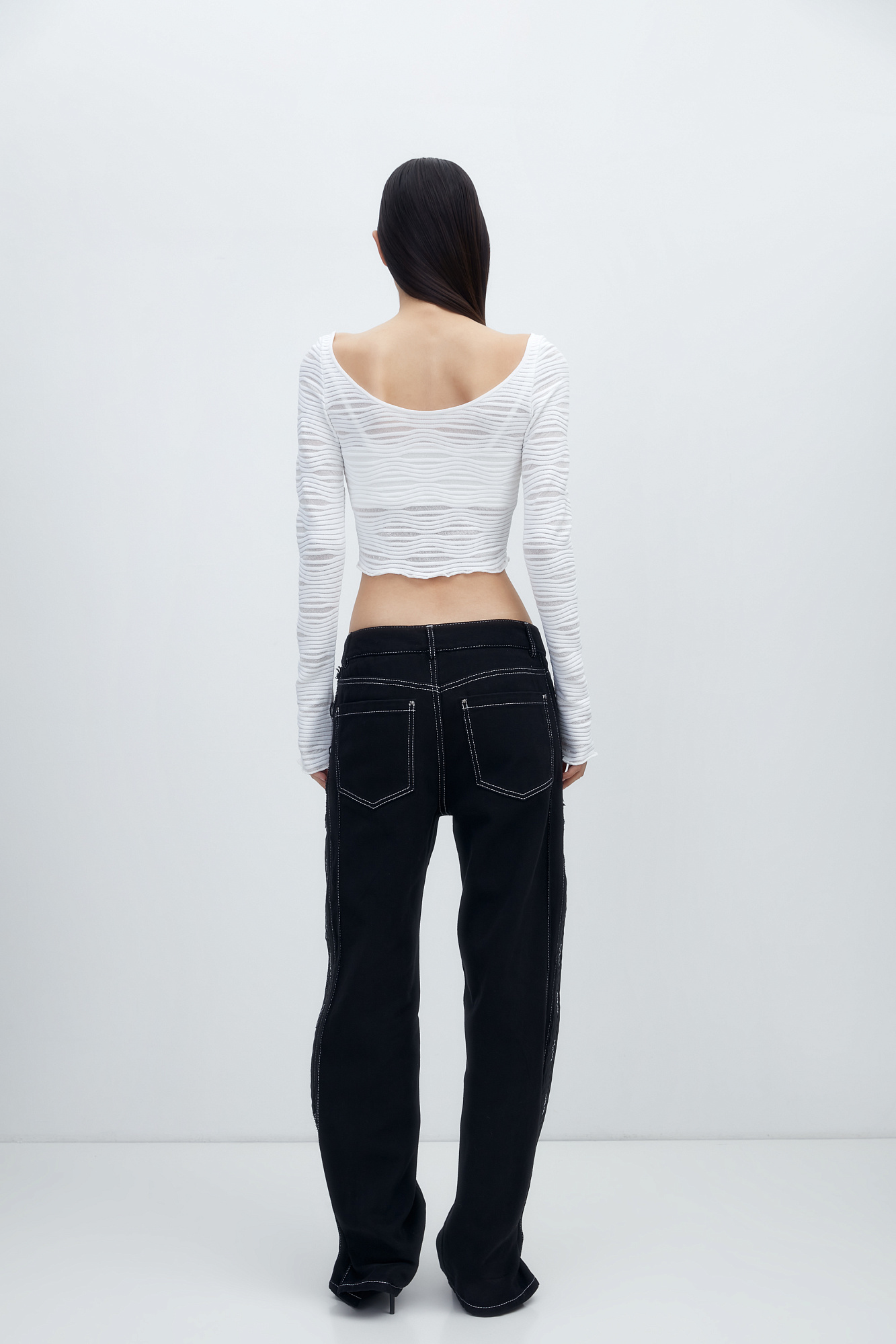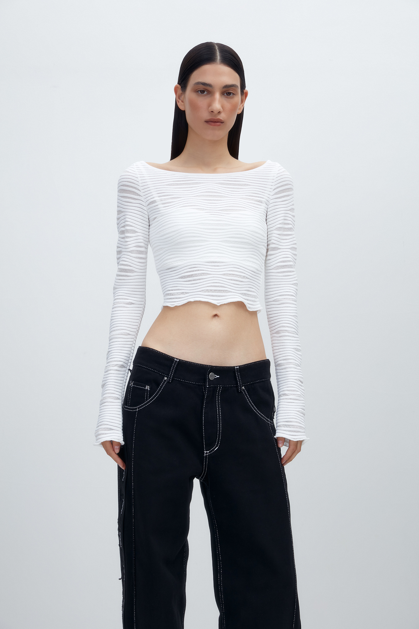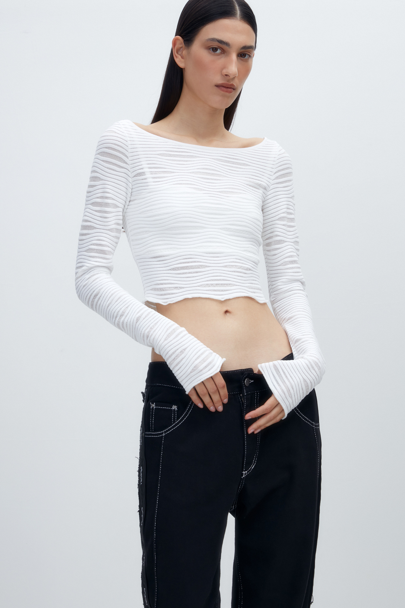 Трикотажный топ из вискозы с вырезом на спине и длинным рукавом.