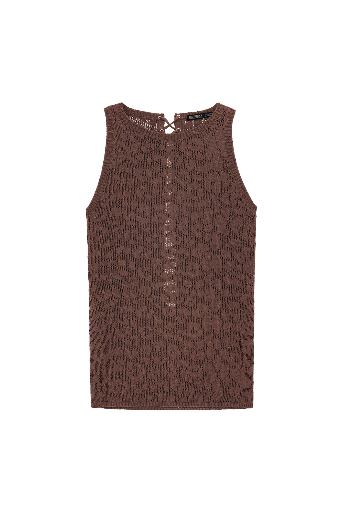 Трикотажный топ из органического хлопка. Модель без рукавов, с круглым вырезом горловины и шнуровкой на спине. Жаккард изделия имитирует пятна леопарда. Края изделия выполнены в рубчик.
