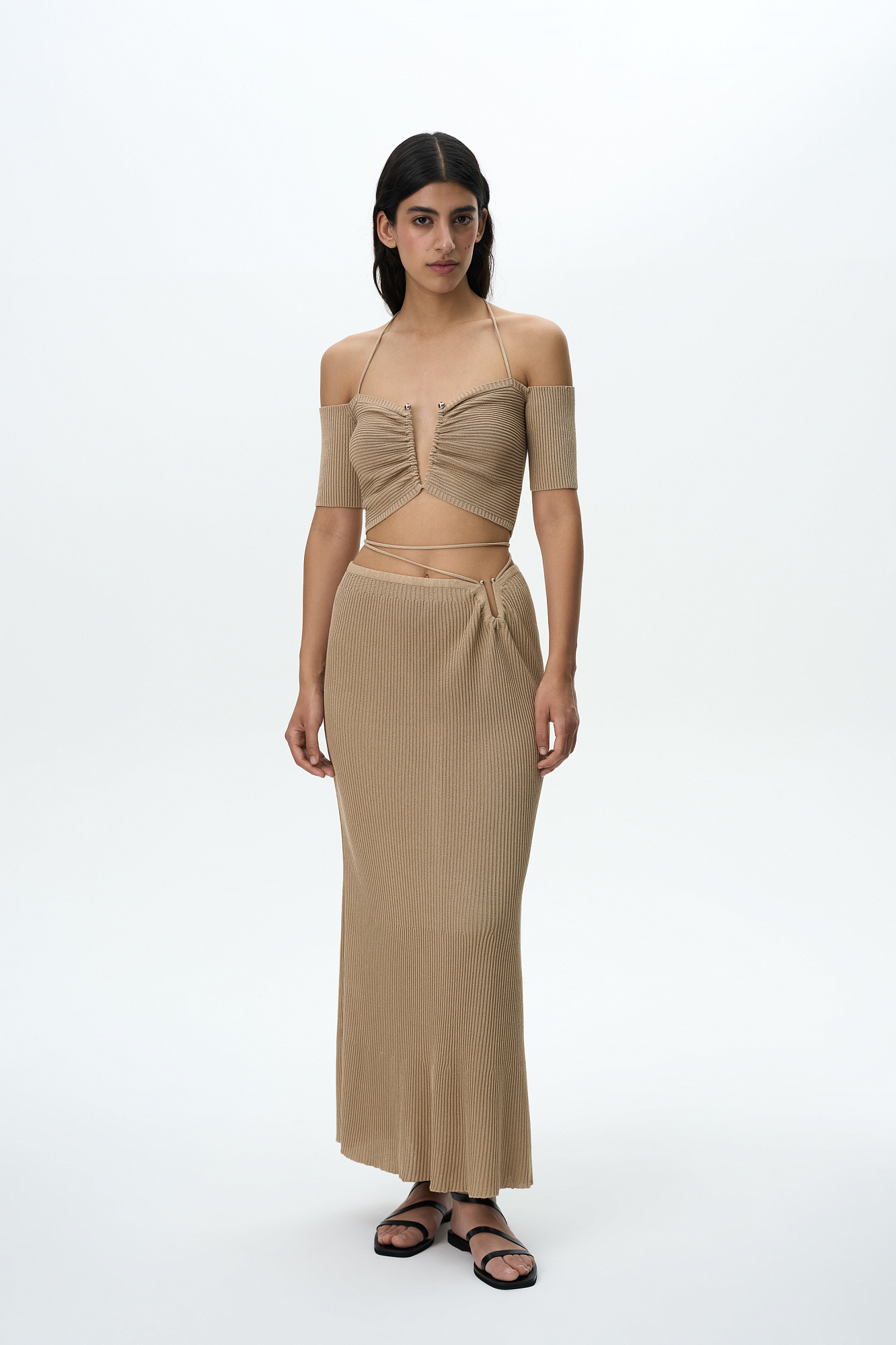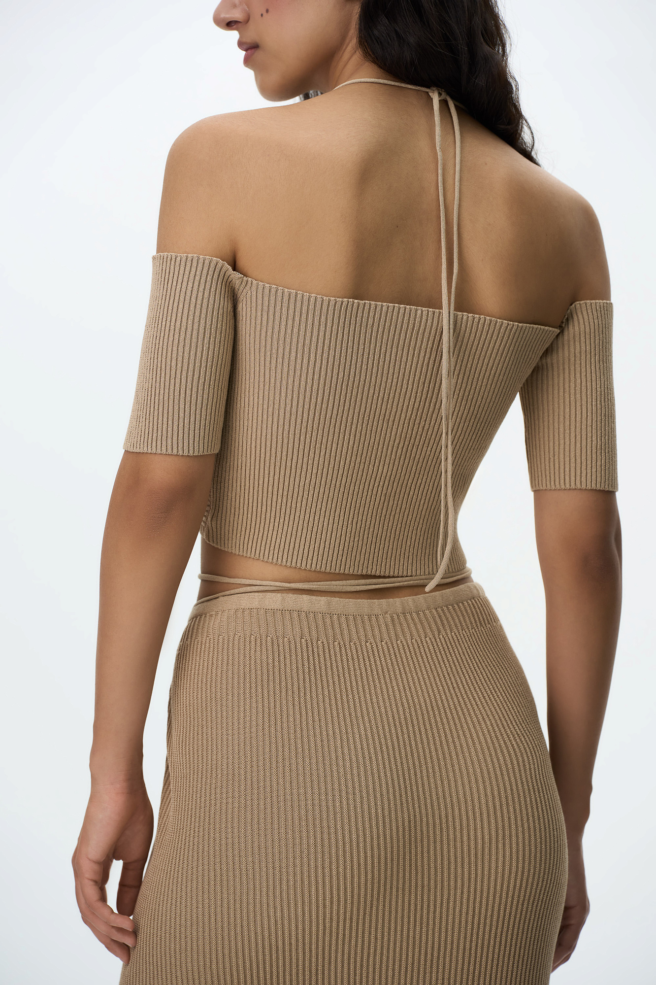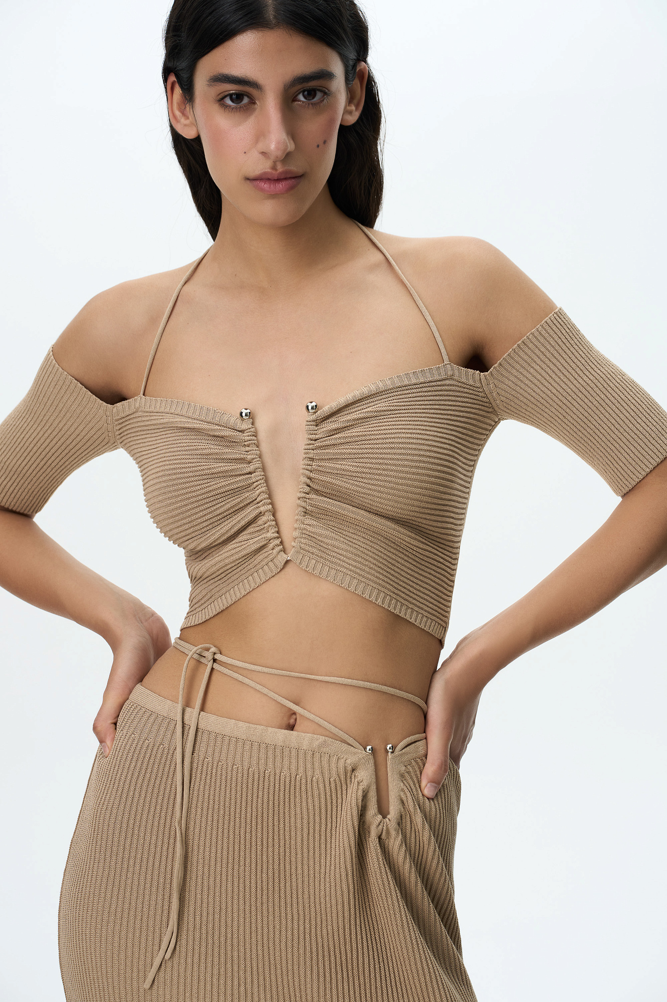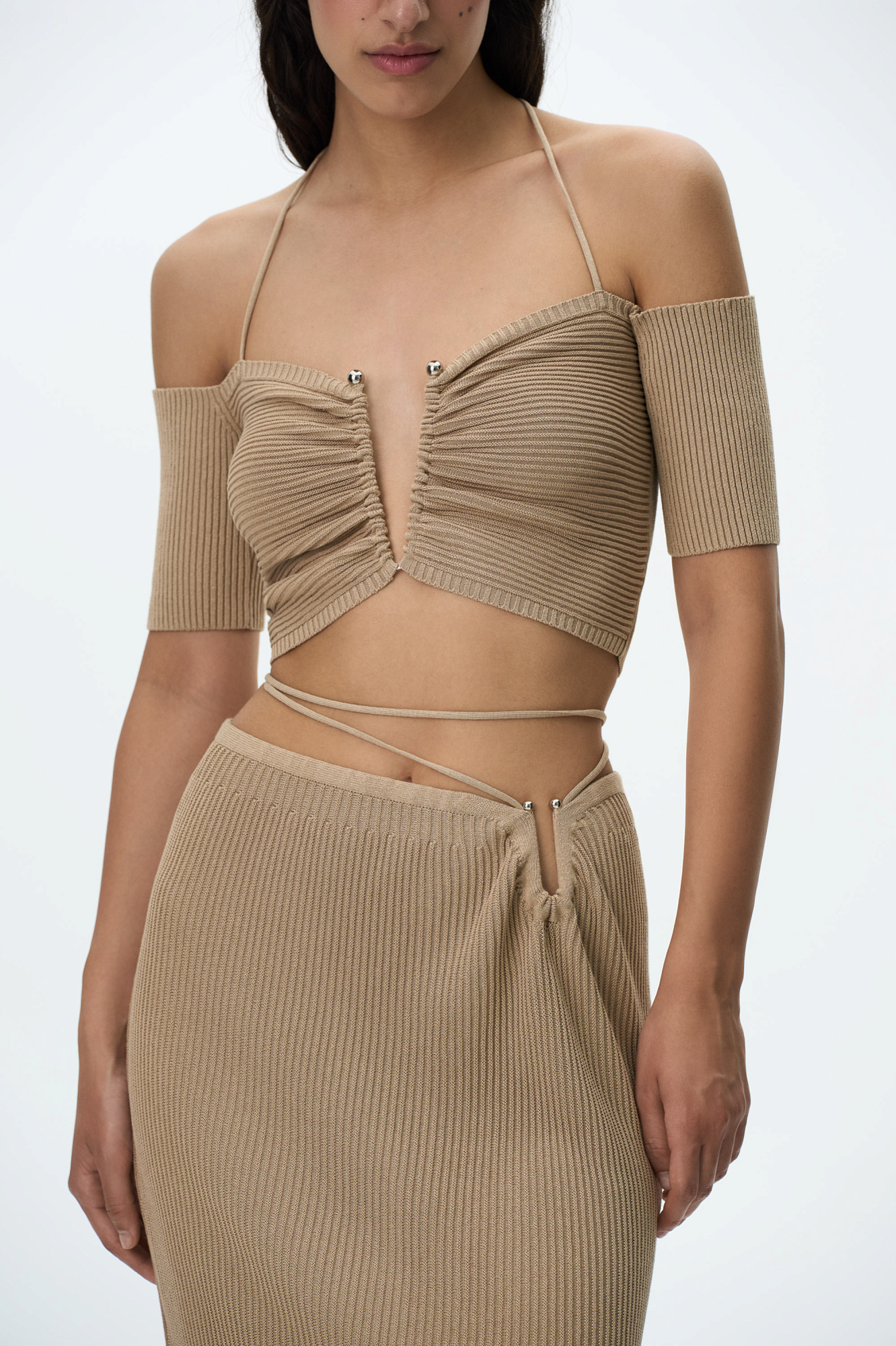 Трикотажный укороченный топ, декорированный металлической перемычкой на груди. Модель с открытыми плечами, короткими рукавами и тонкими бретелями, завязывающимися на шее.