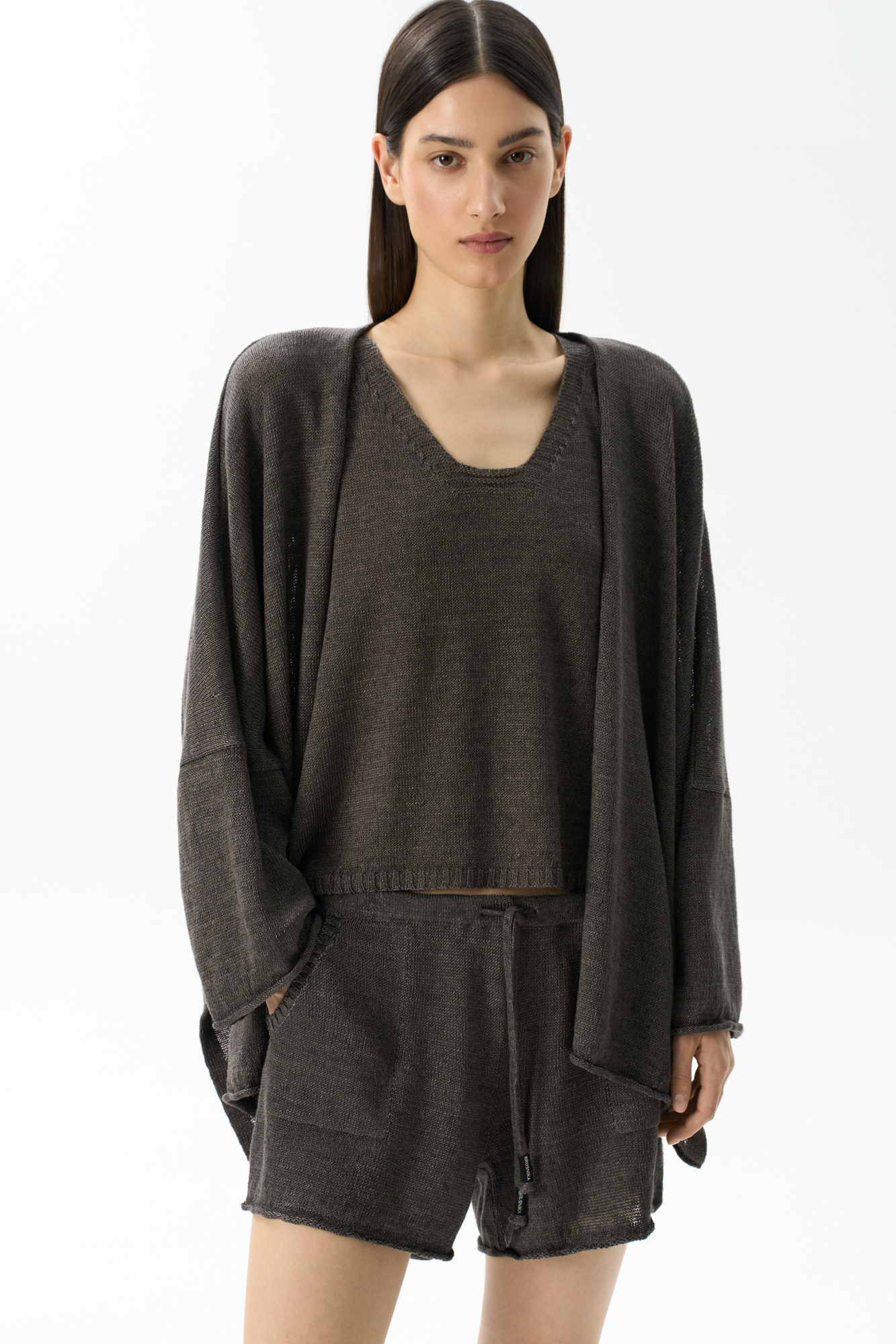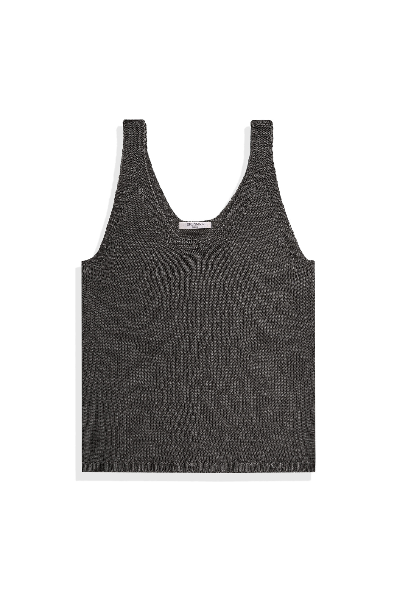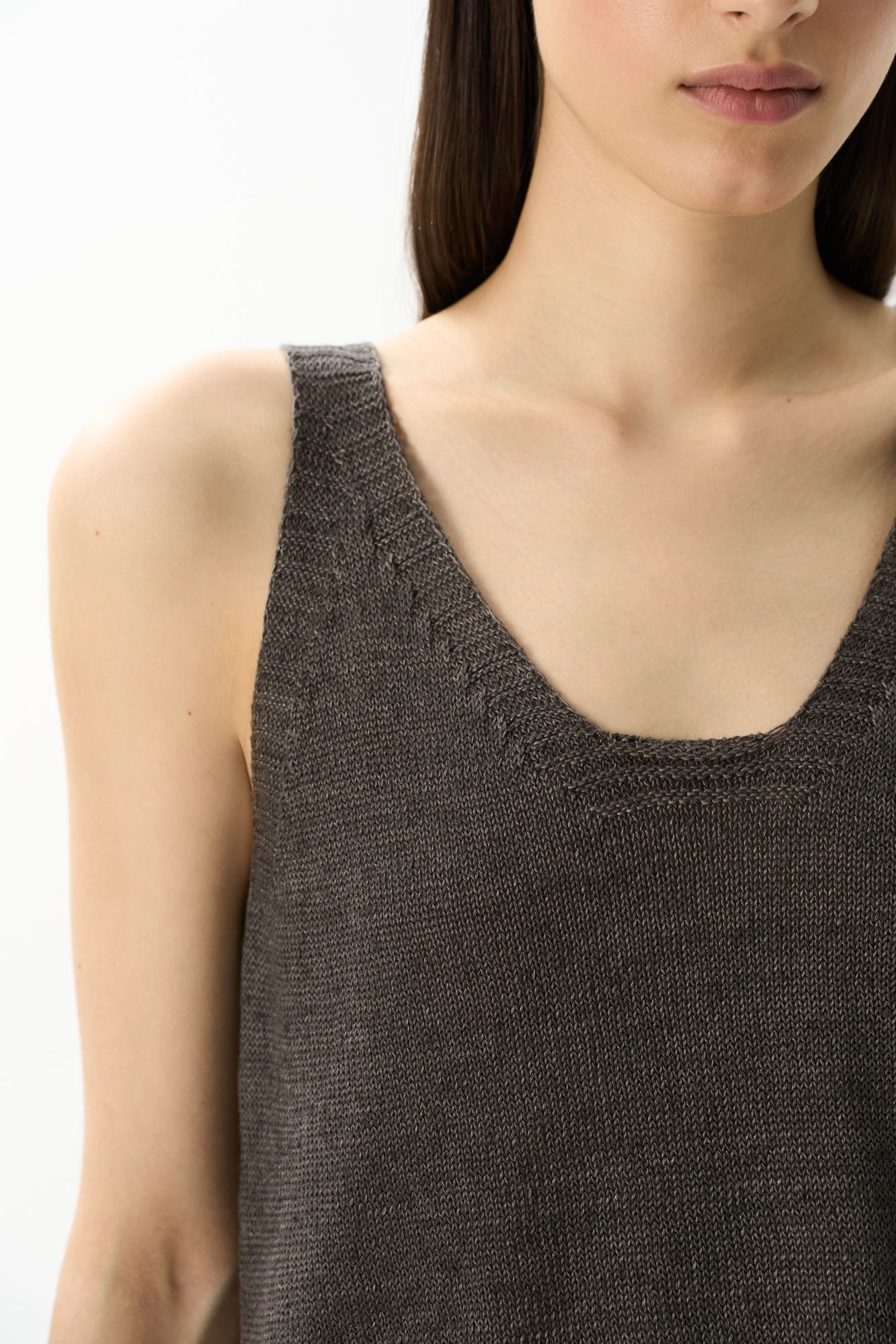 Трикотажный топ из 100% льна. Модель прямого кроя, на широких бретелях, с глубокой проймой и U-образным вырезом горловины. Края изделия выполнены в рубчик.