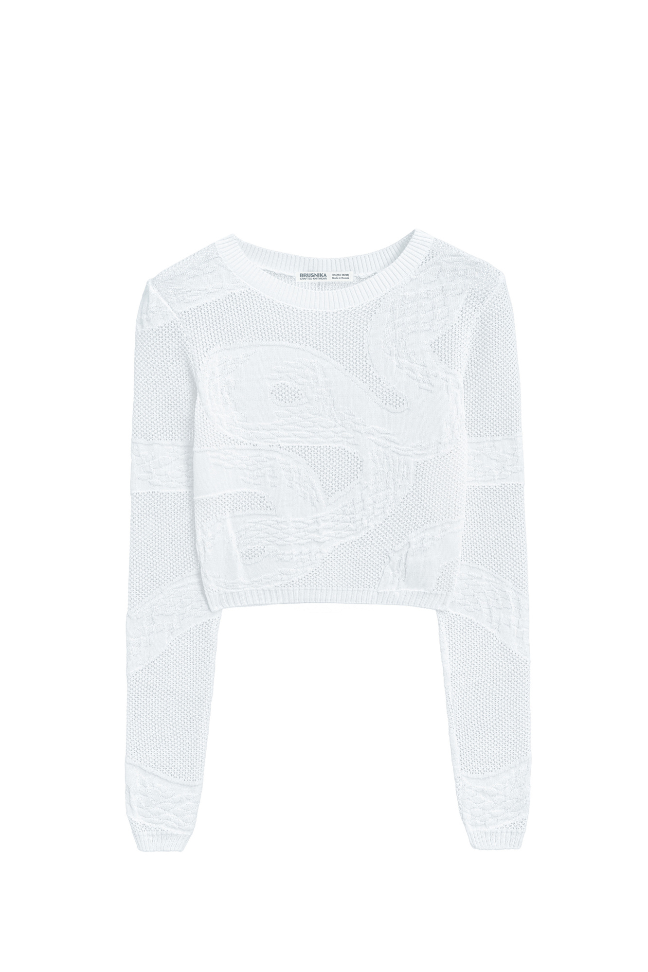 Трикотажный топ из органического хлопка. Молель укороченного силуэта, с длинными рукавами и круглым вырезом горловины. Изделие декорировано жаккардовым узором в виде змеи. Без подкладки.