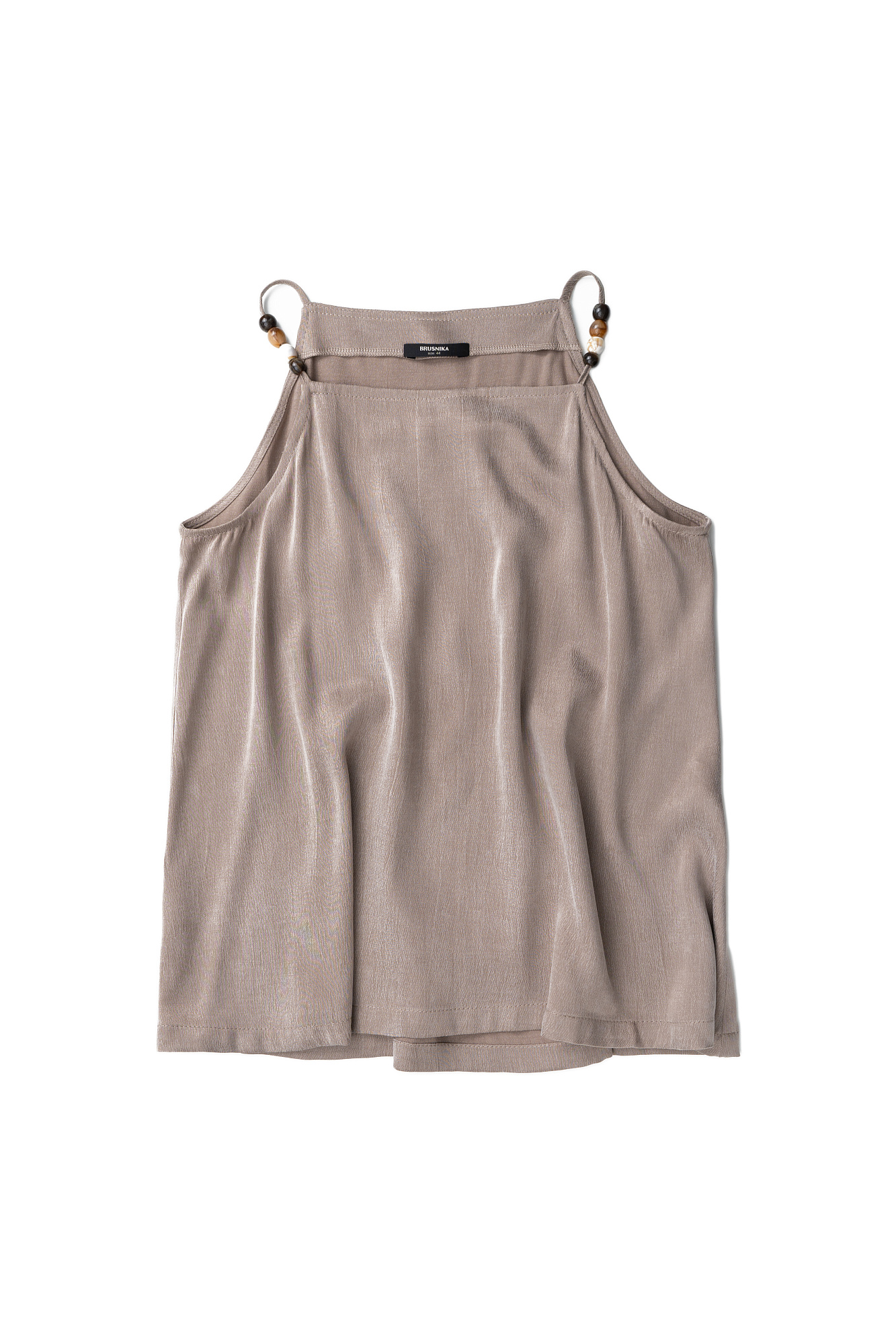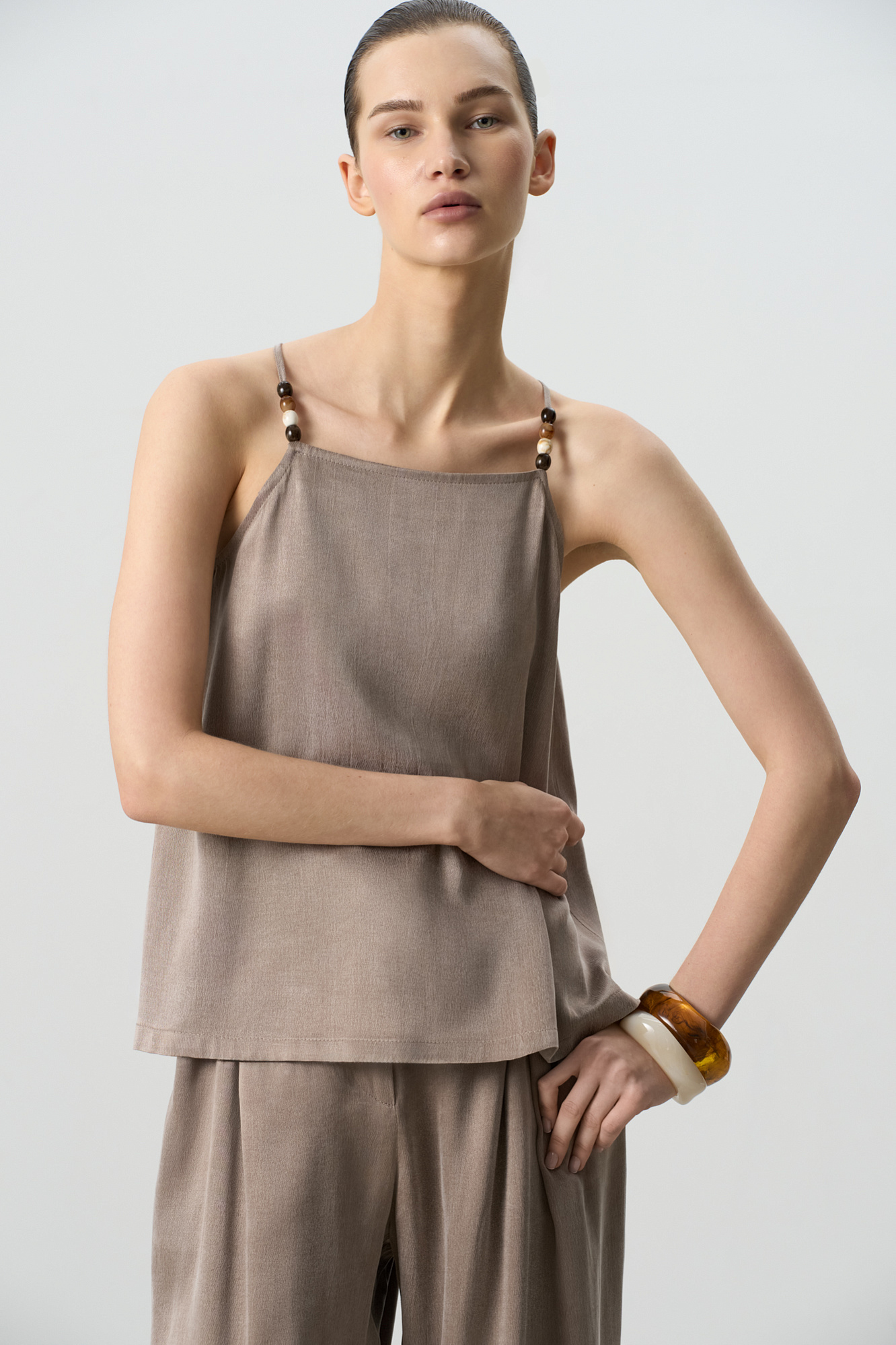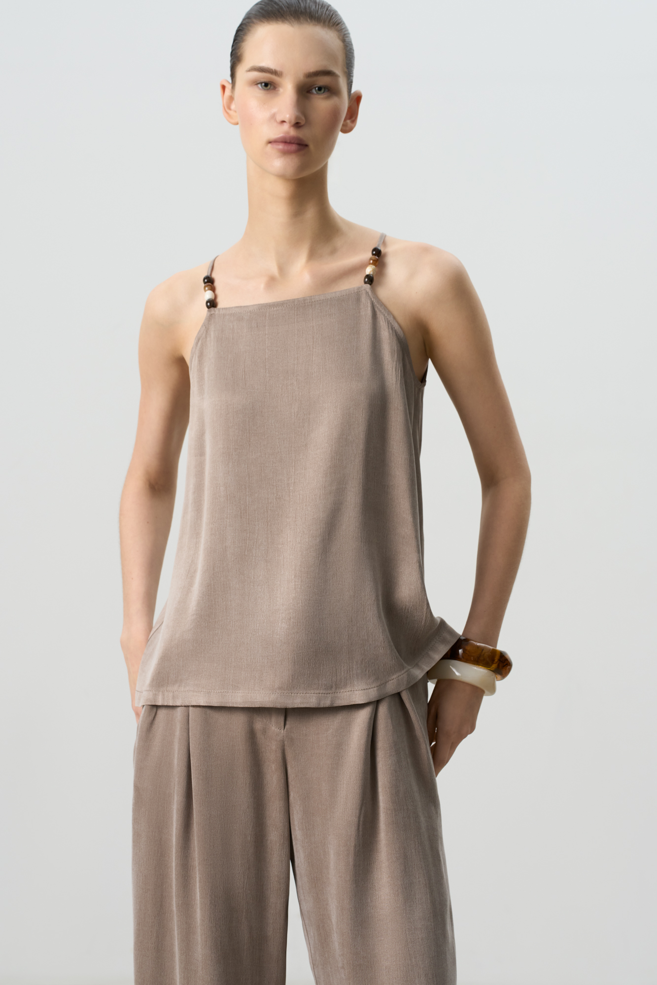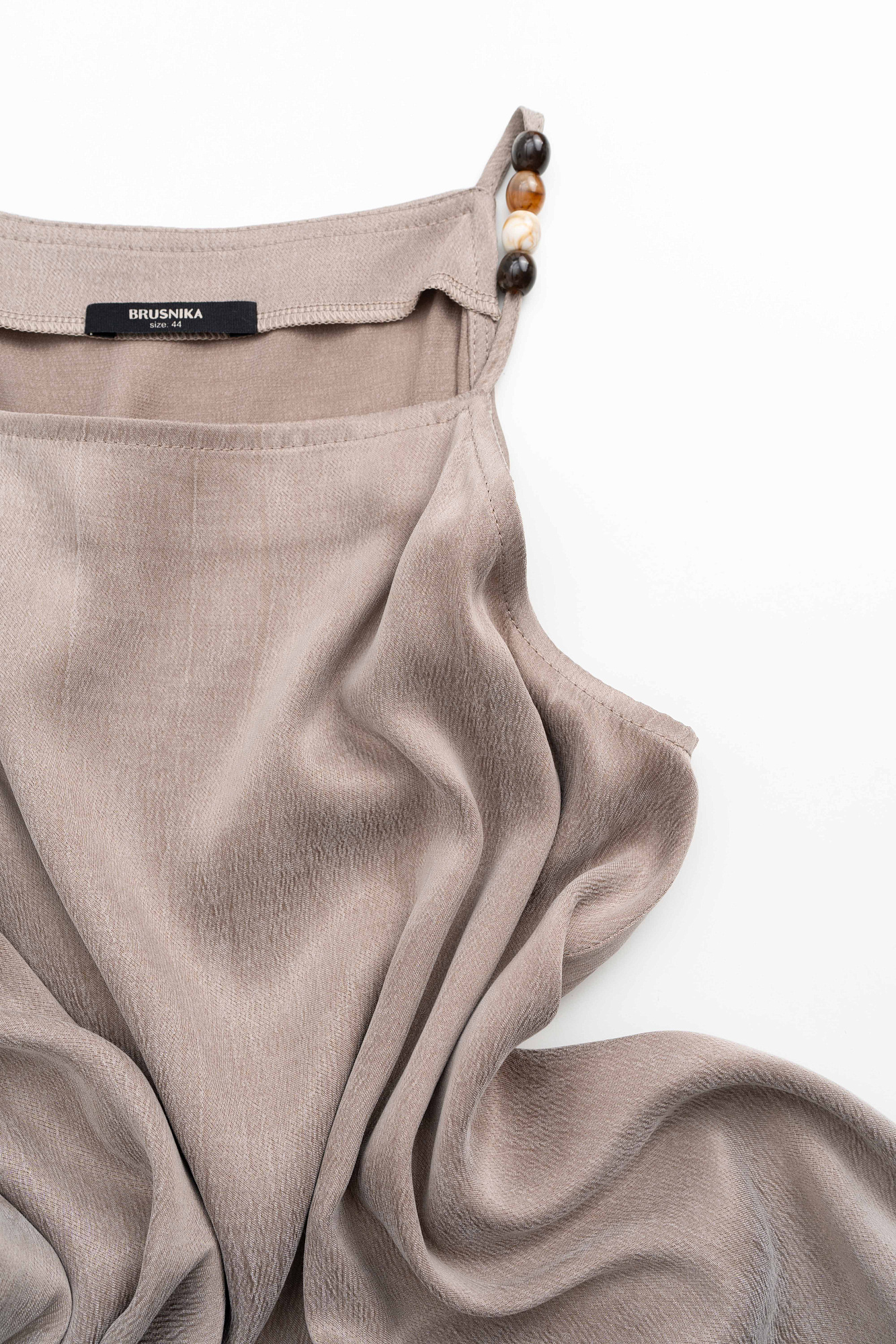 Топ из купры. Модель свободного силуэта, с прямым неглубоким вырезом, на тонких бретельках, декорированных бусинами.
