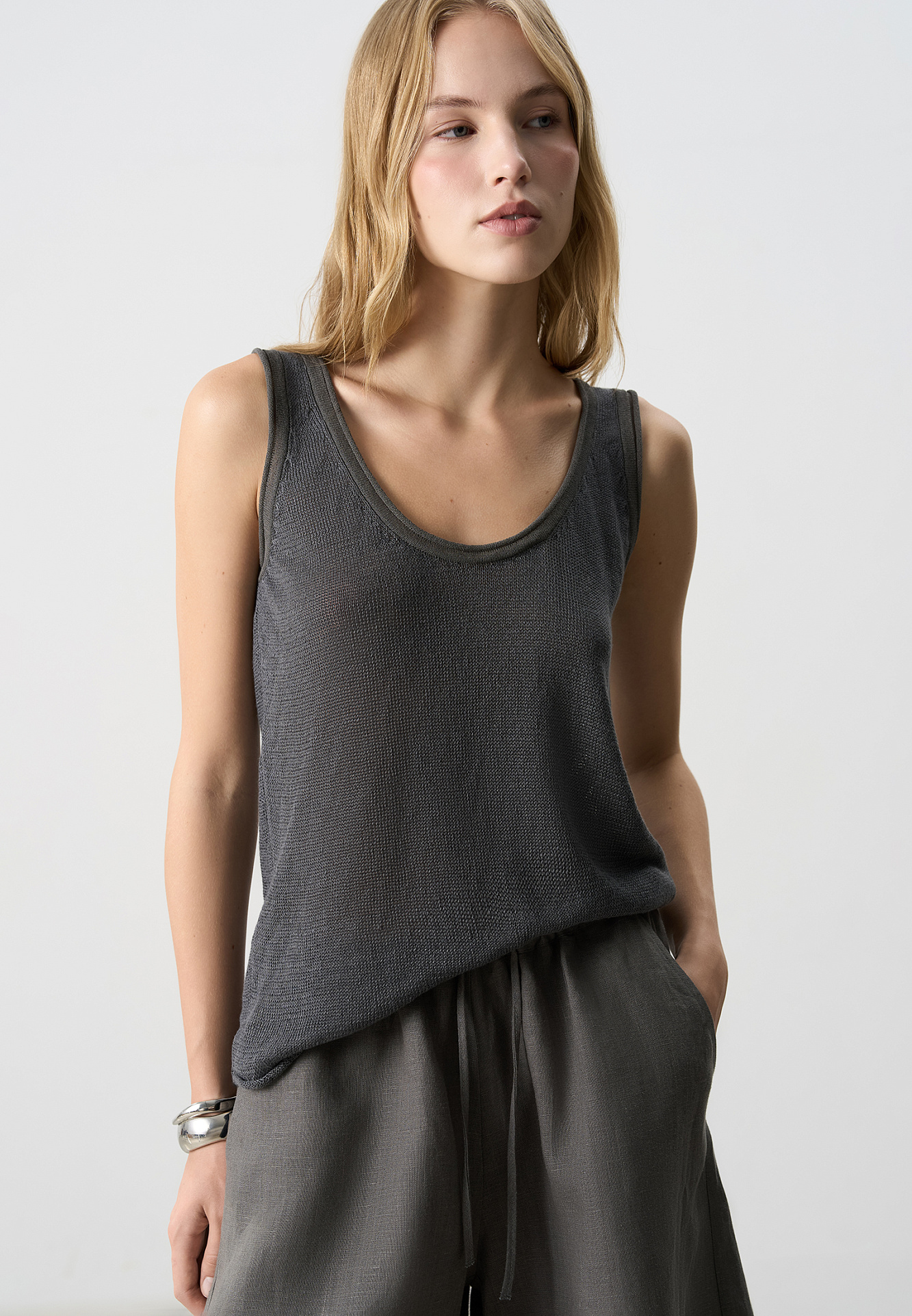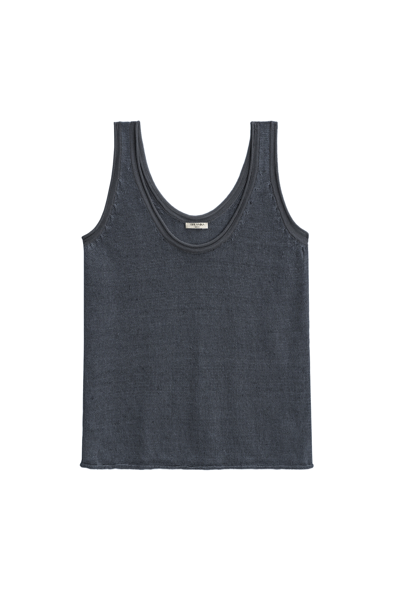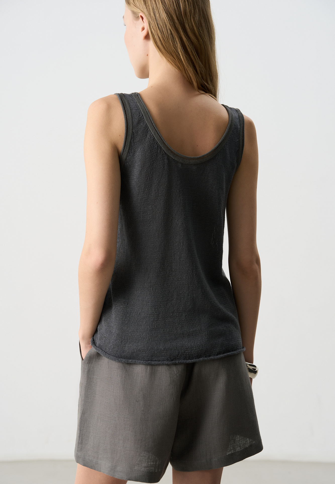 Трикотажный топ из 100% льна. Модель прямого кроя, на широких бретелях, с глубокой проймой и U-образным вырезом горловины. Края изделия выполнены в рубчик.
