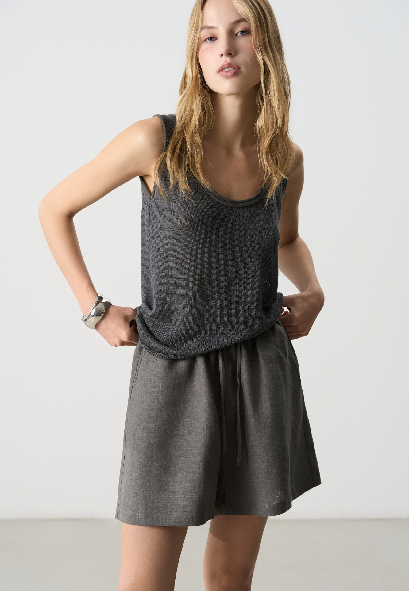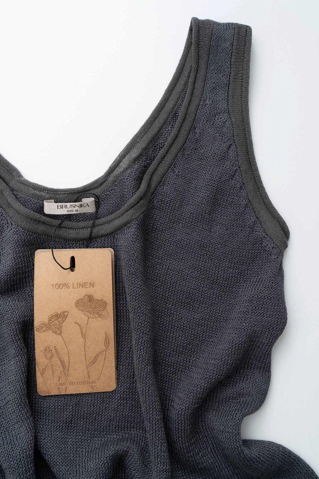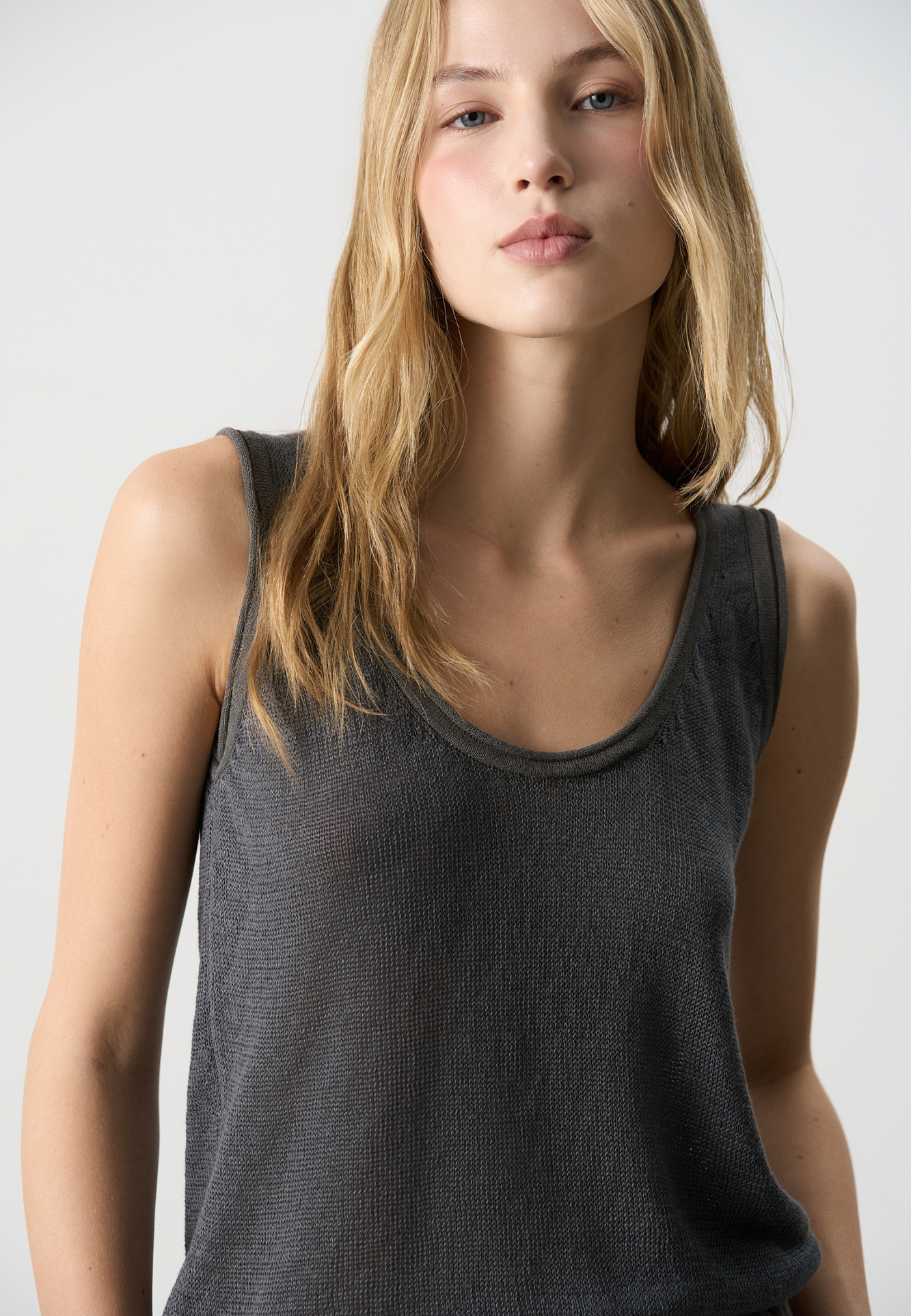 Трикотажный топ из 100% льна. Модель прямого кроя, на широких бретелях, с глубокой проймой и U-образным вырезом горловины. Края изделия выполнены в рубчик.