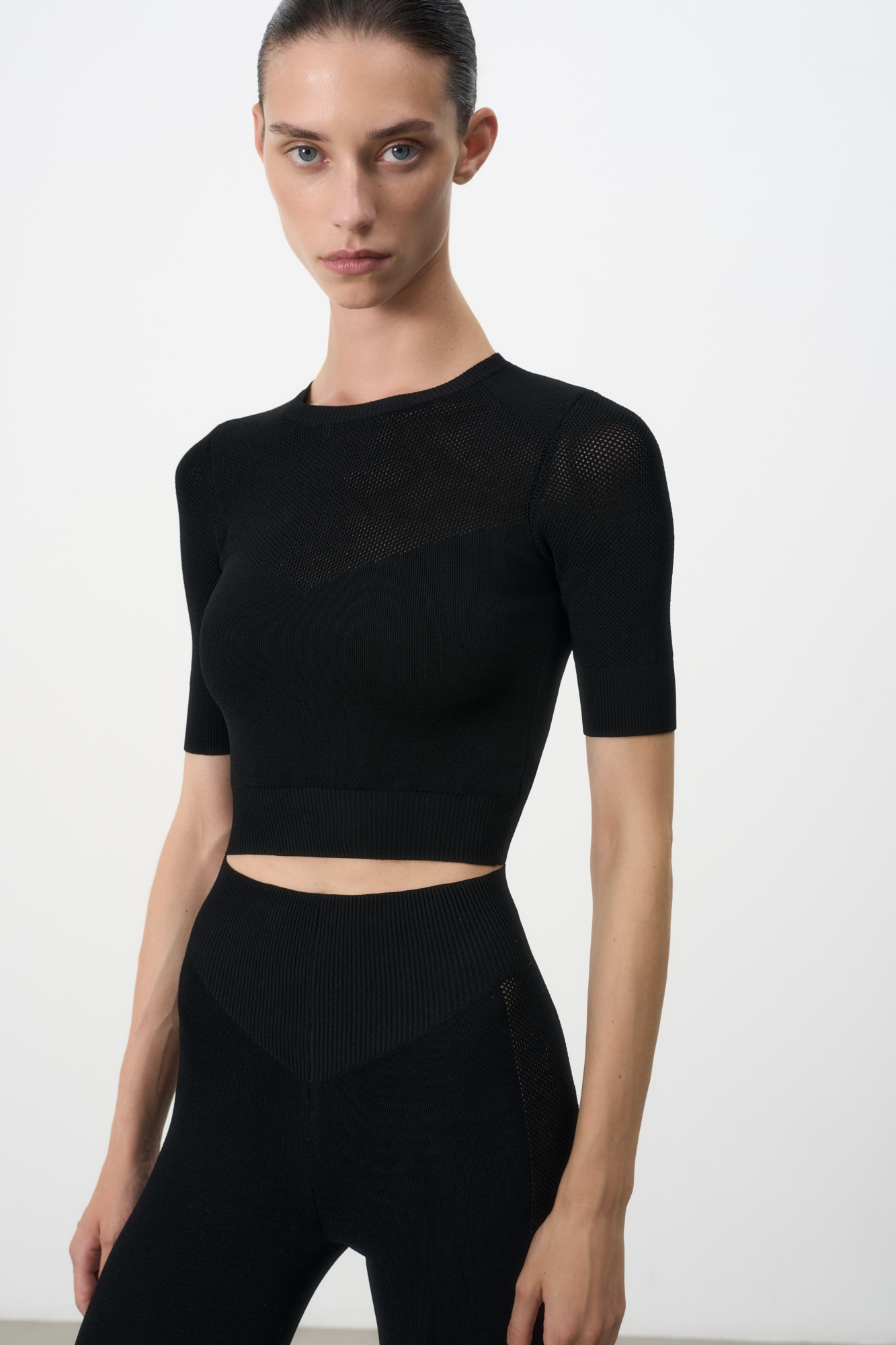 Трикотажный топ из вискозы с короткими рукавами и элементами из сетки.