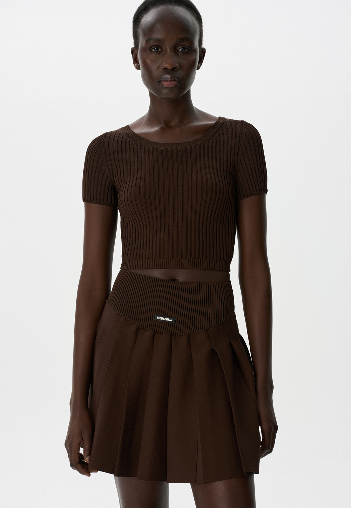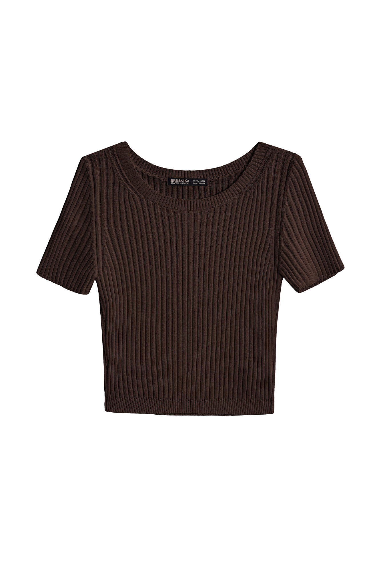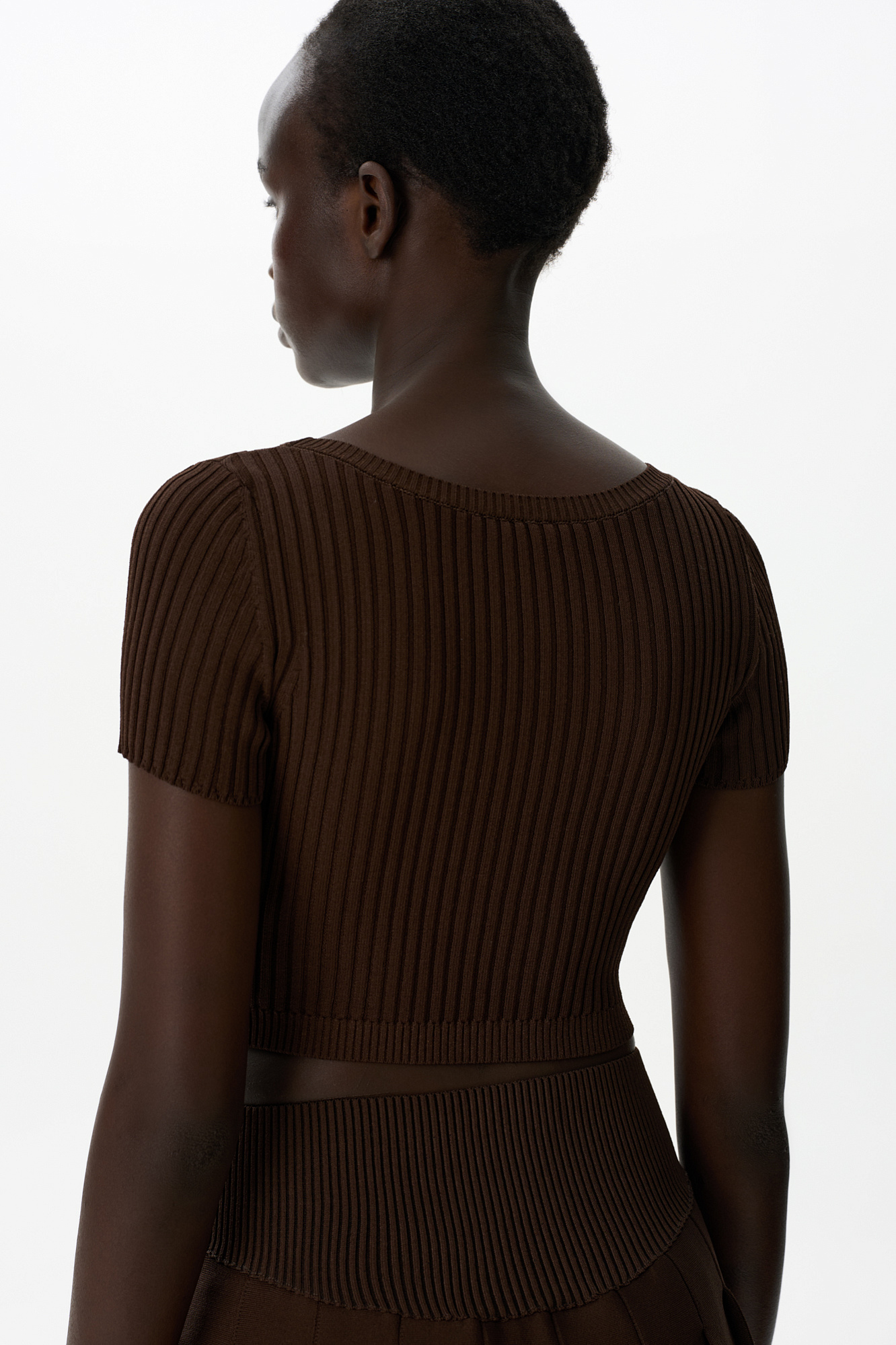 Короткий трикотажный топ из вискозы в рубчик. Модель приталенного силуэта с короткими рукавами и круглым вырезом горловины. Дополнить образ можно юбкой плиссе.