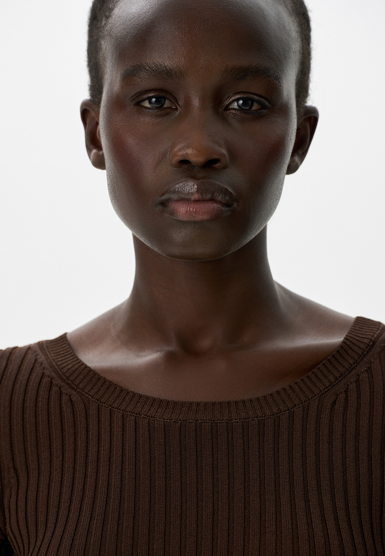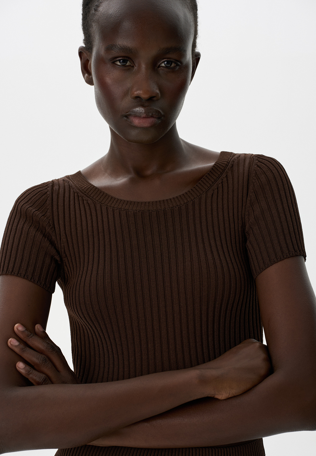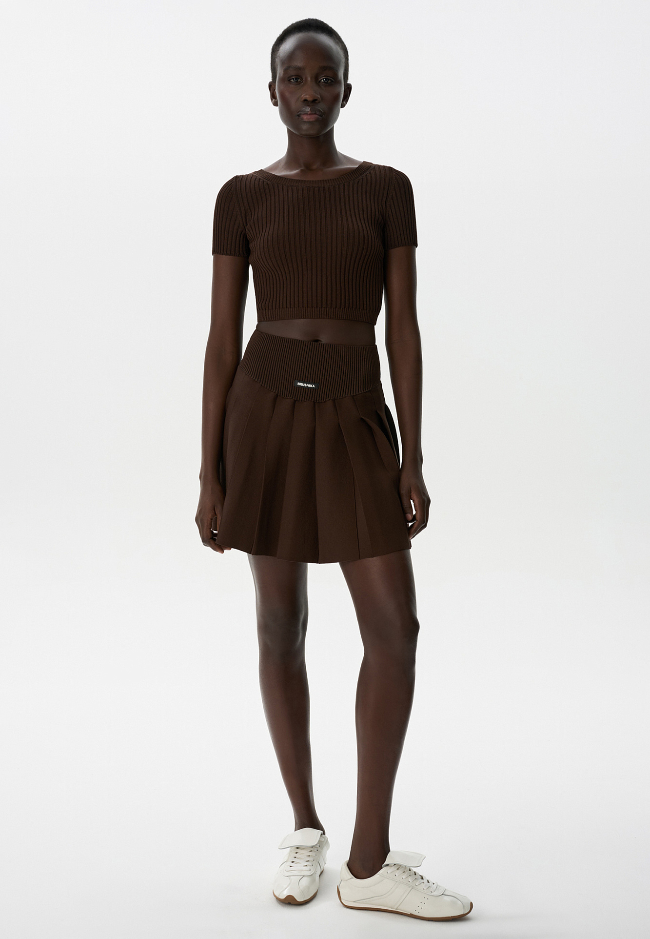 Короткий трикотажный топ из вискозы в рубчик. Модель приталенного силуэта с короткими рукавами и круглым вырезом горловины. Дополнить образ можно юбкой плиссе.