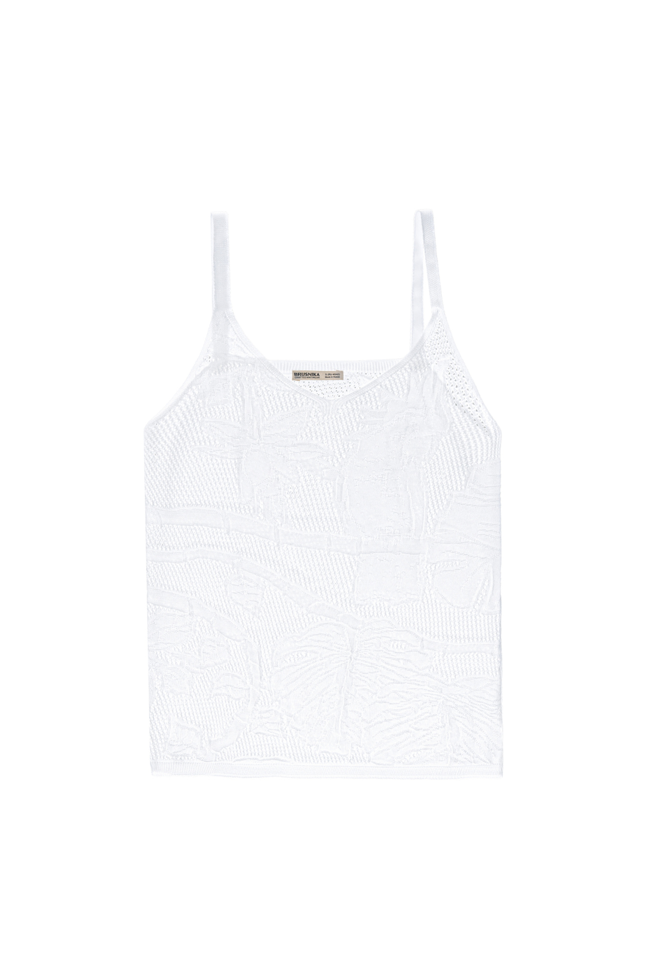 Трикотажный ажурный топ из вискозы. Модель прямого кроя, на тонких лямках. Изделие декорировано объемным растительным орнаментом.