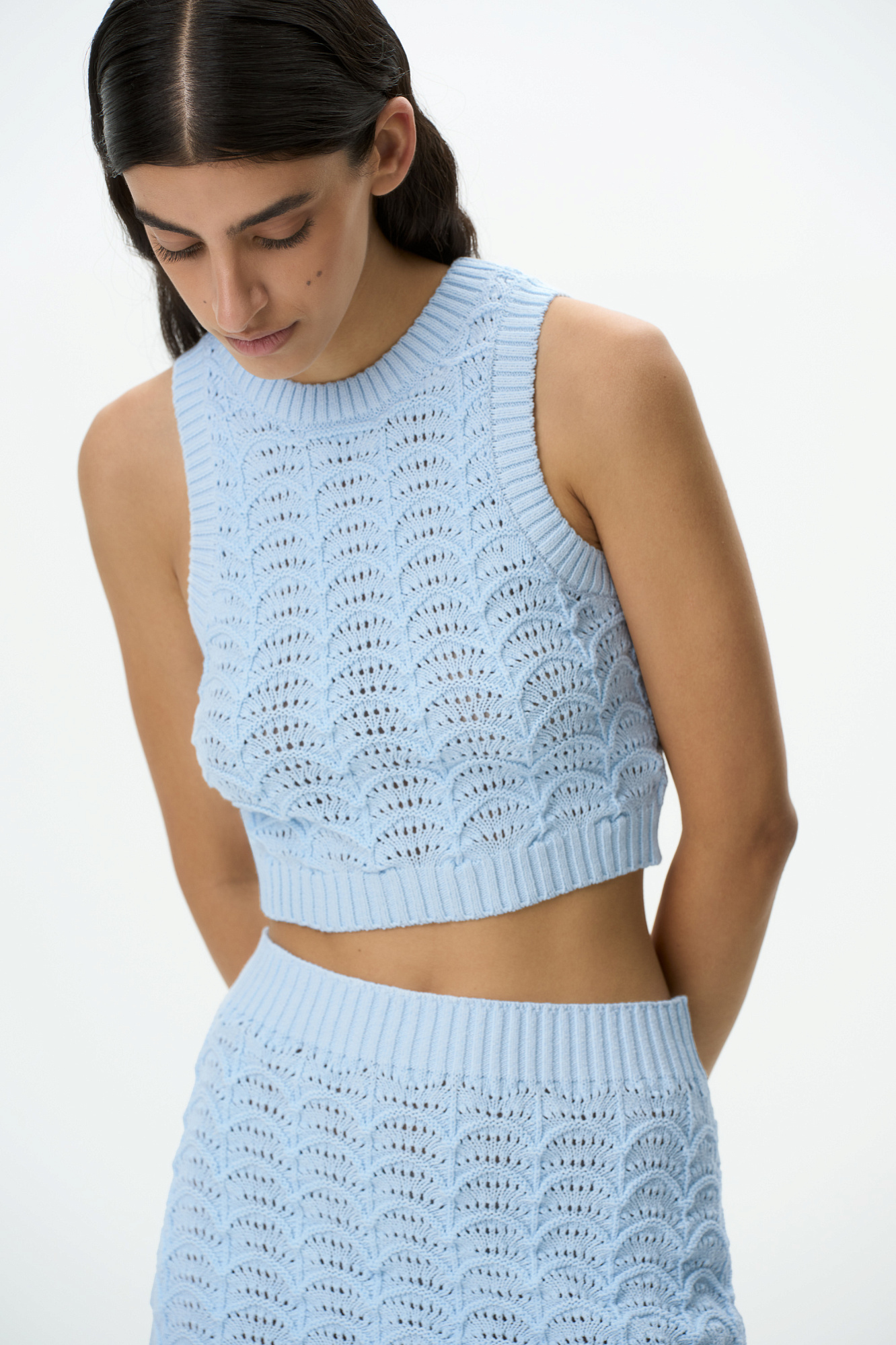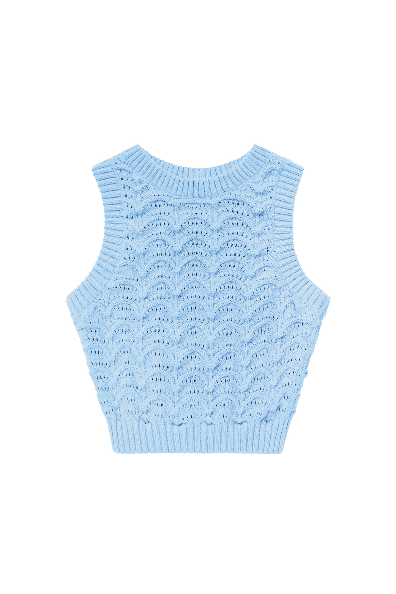 Трикотажный ажурный топ из хлопка с добавлением эластана. Модель приталенного силуэта, без рукавов, с неглубоким круглым вырезом горловины. Изделие выполнено объемным вязанием с волнистым узором и краями в рубчик.