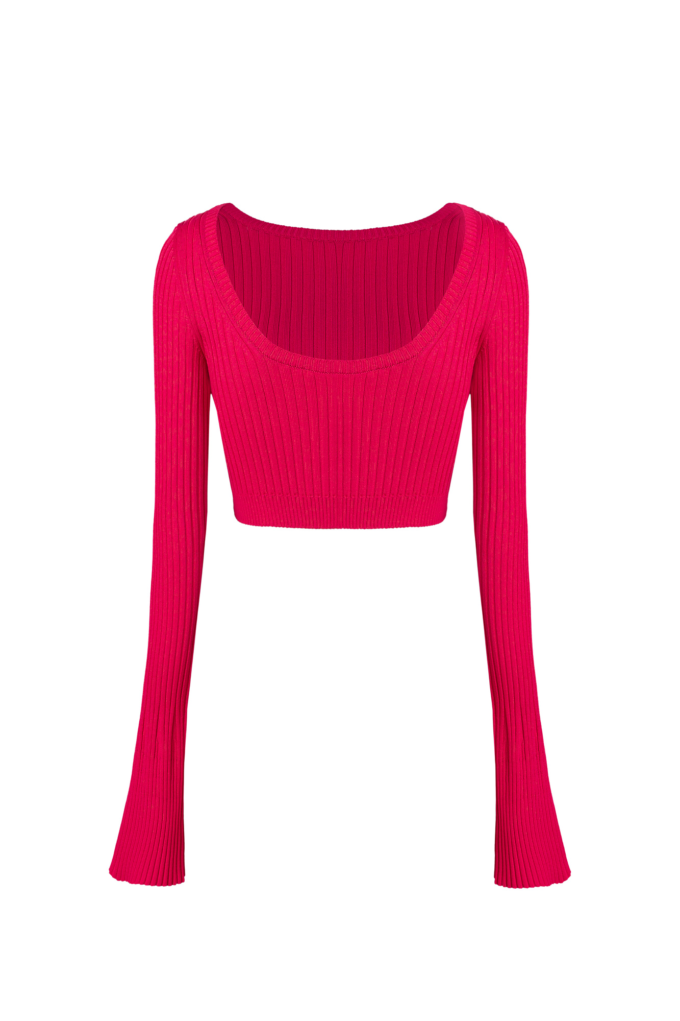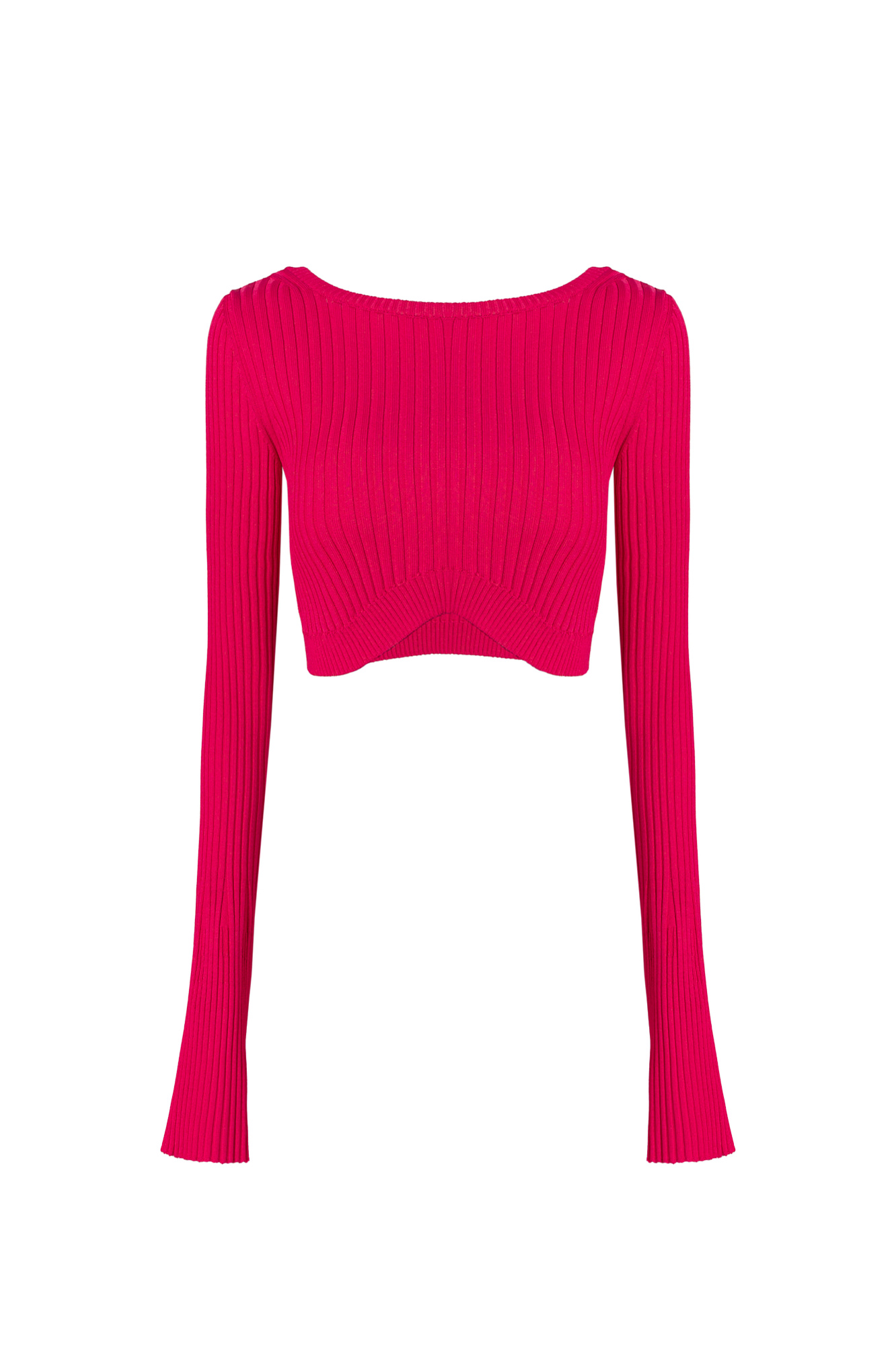 Укороченный трикотажный топ из вискозы в рубчик. Обтягивающая модель с открытой спиной. Дополнить образ можно юбкой в таком же стиле.