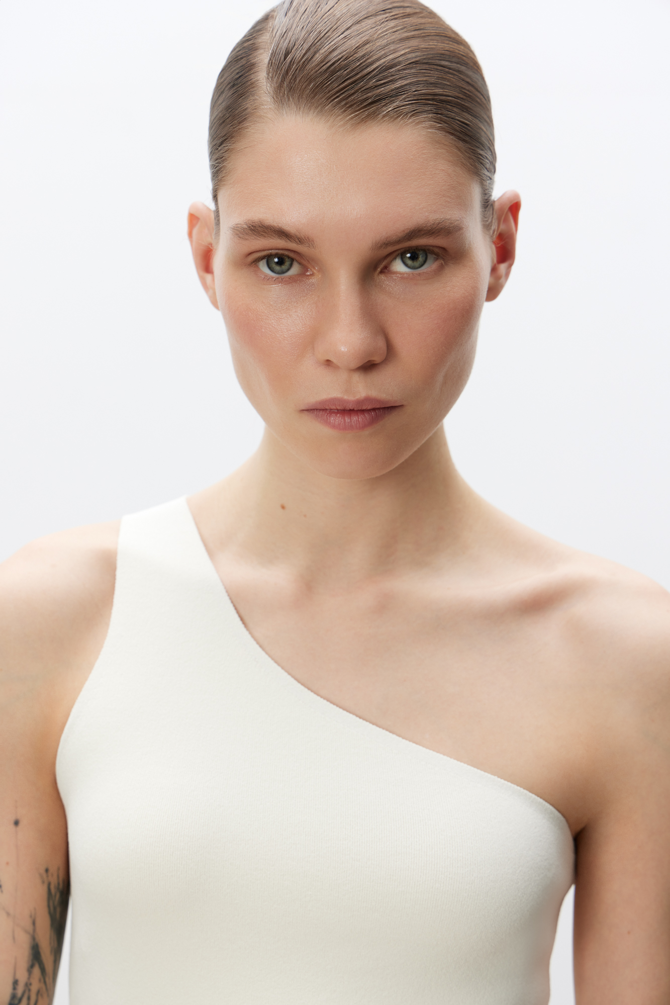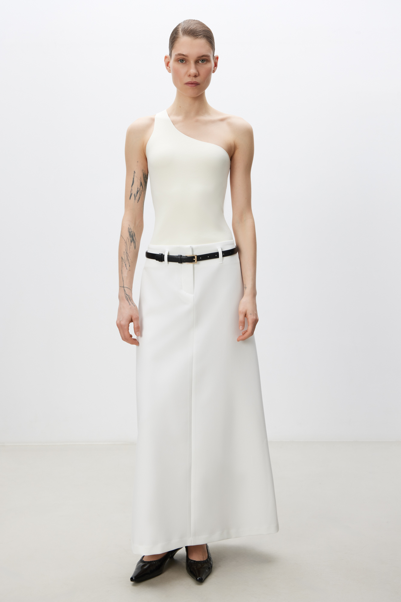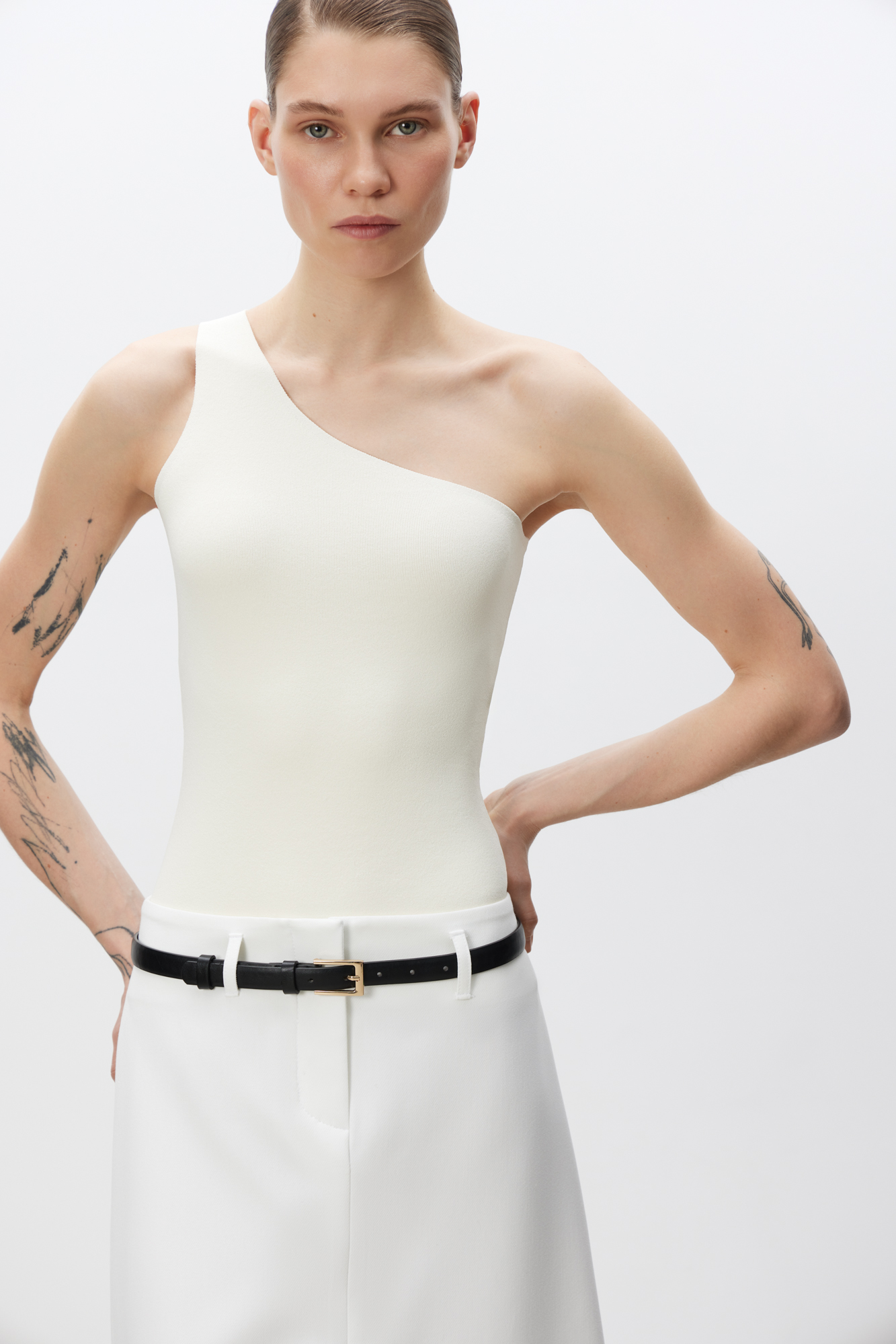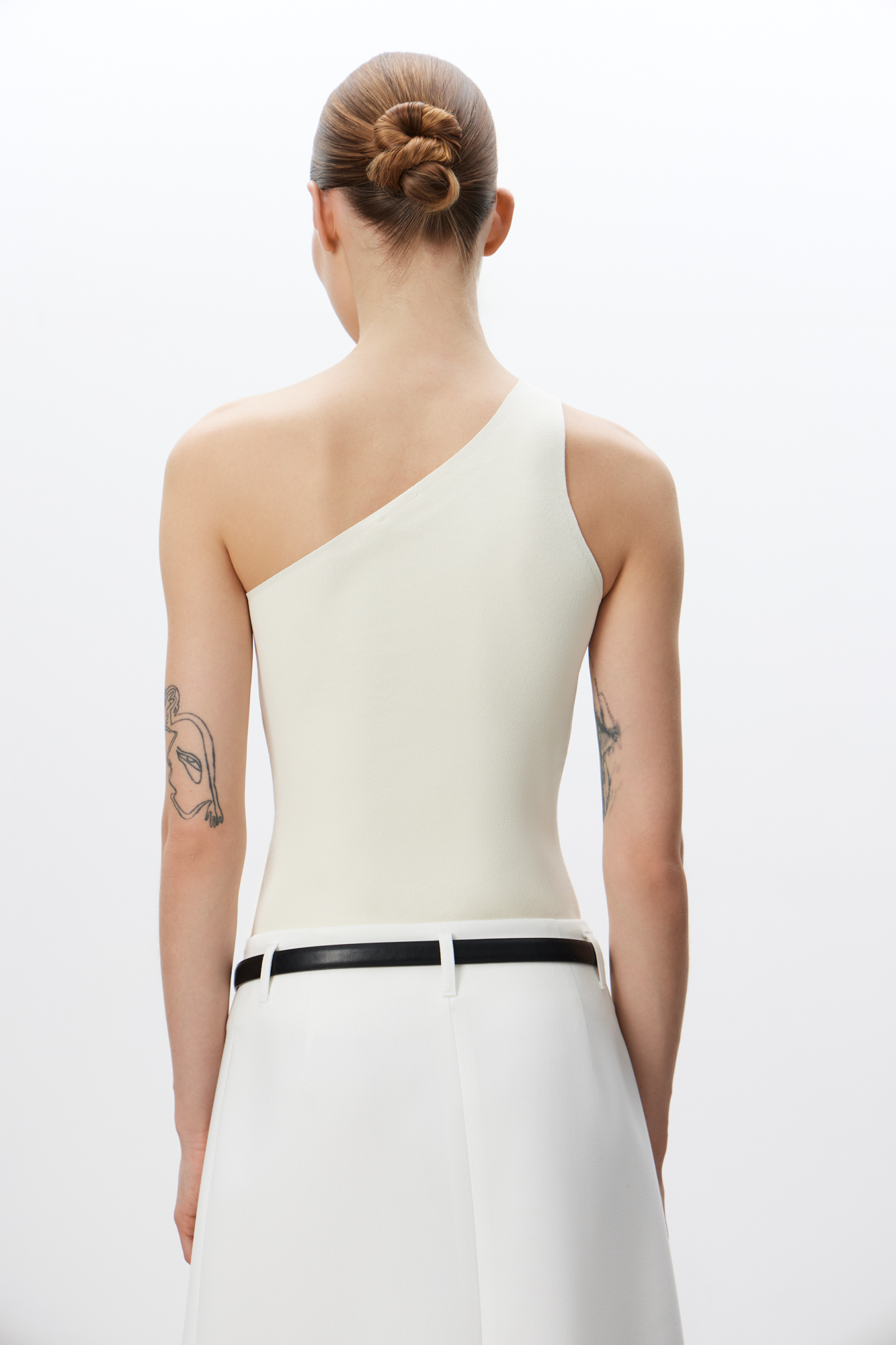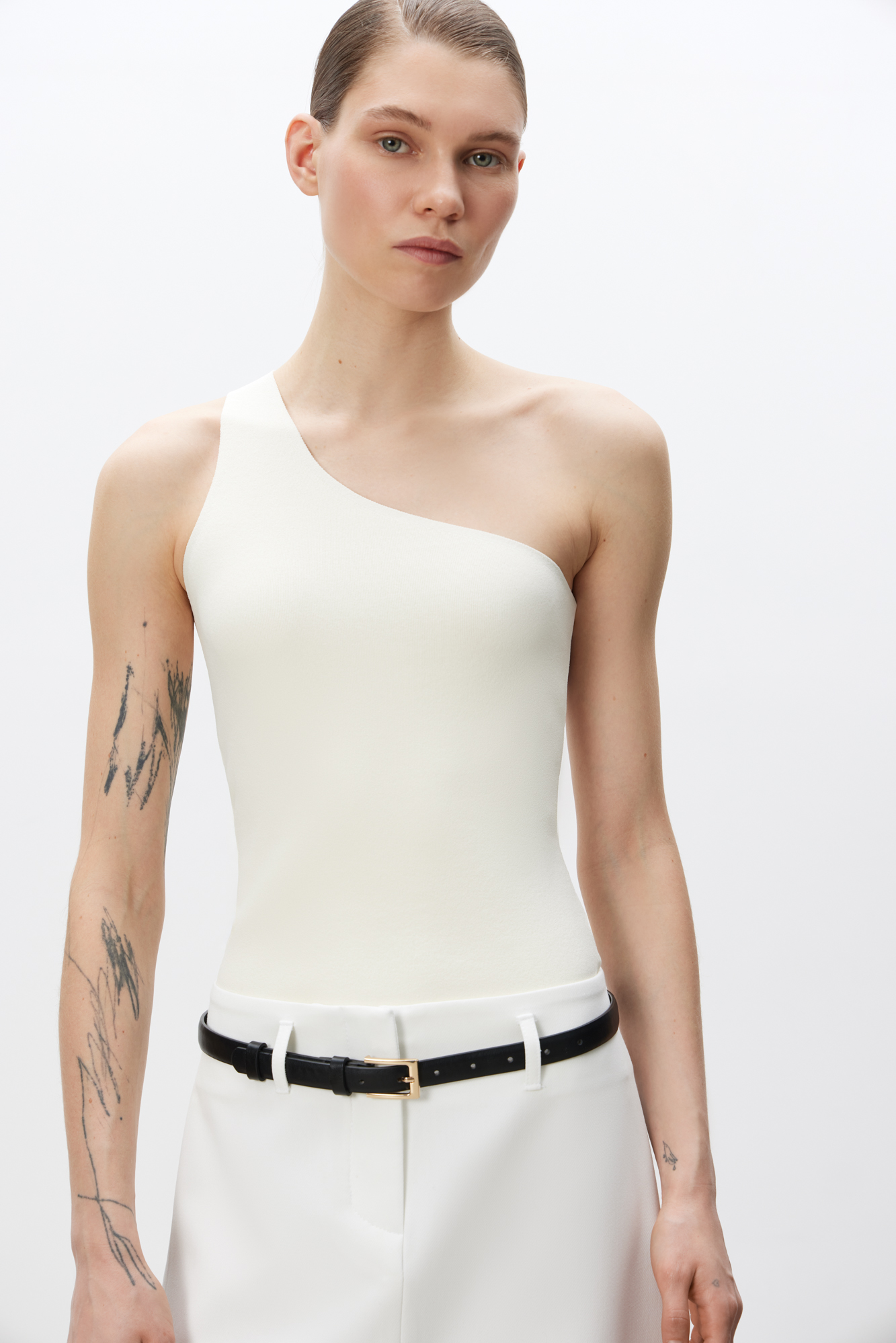 Трикотажный топ из вискозы. Модель облегающего силуэта, с лямкой на одно плечо.