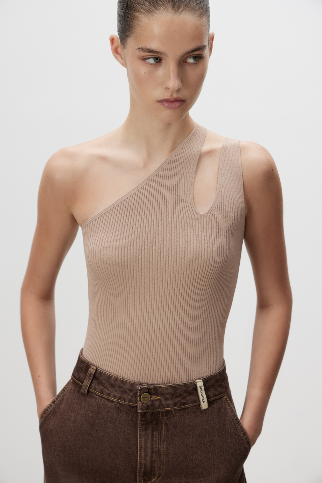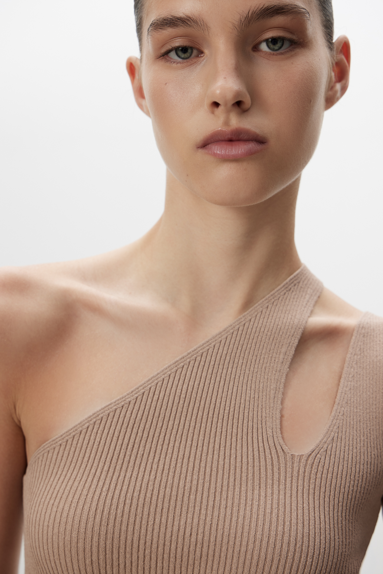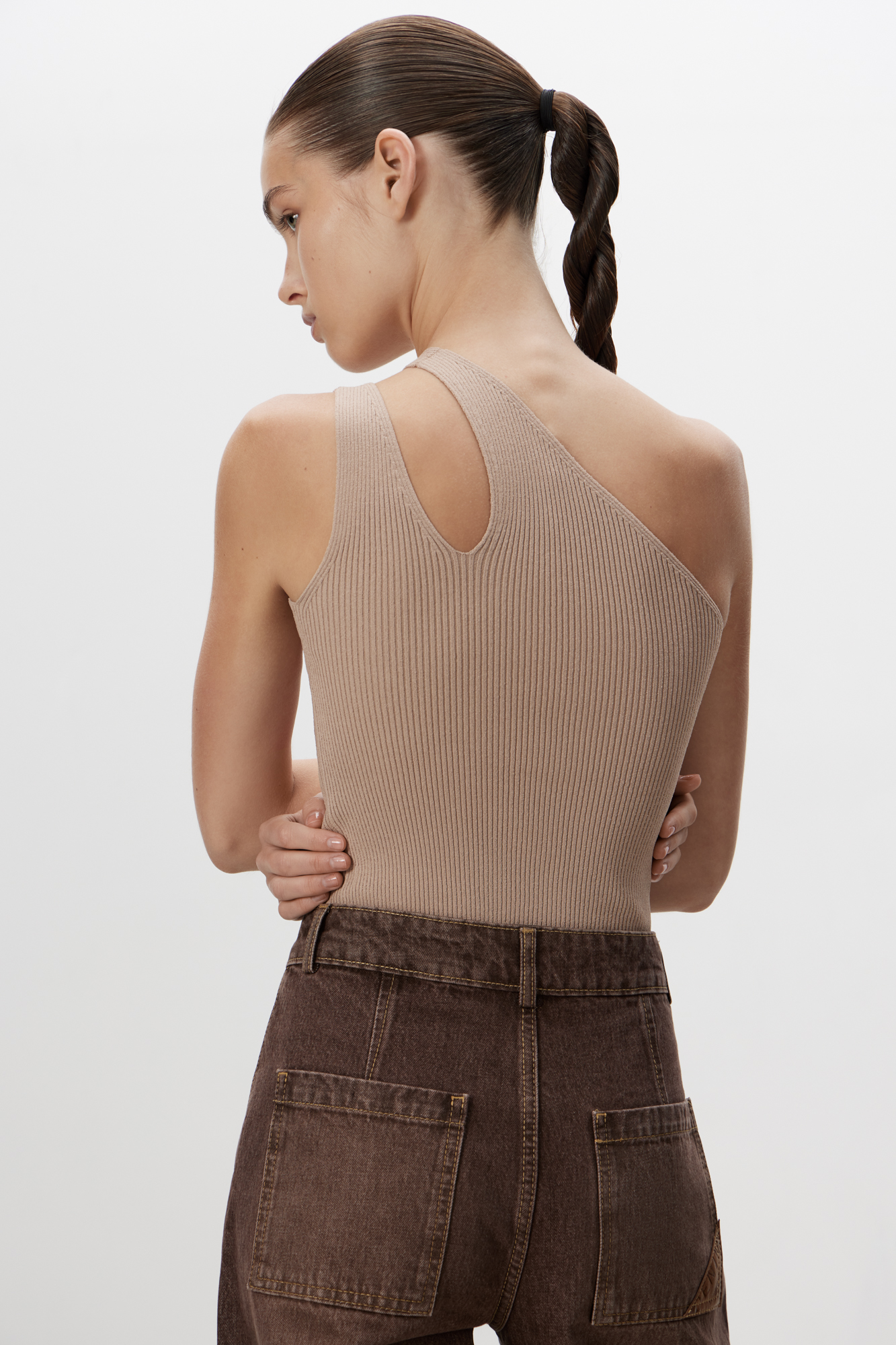 Трикотажный топ из вискозы в рубчик. Модель без рукавов, с двойной лямкой одно на плечо.