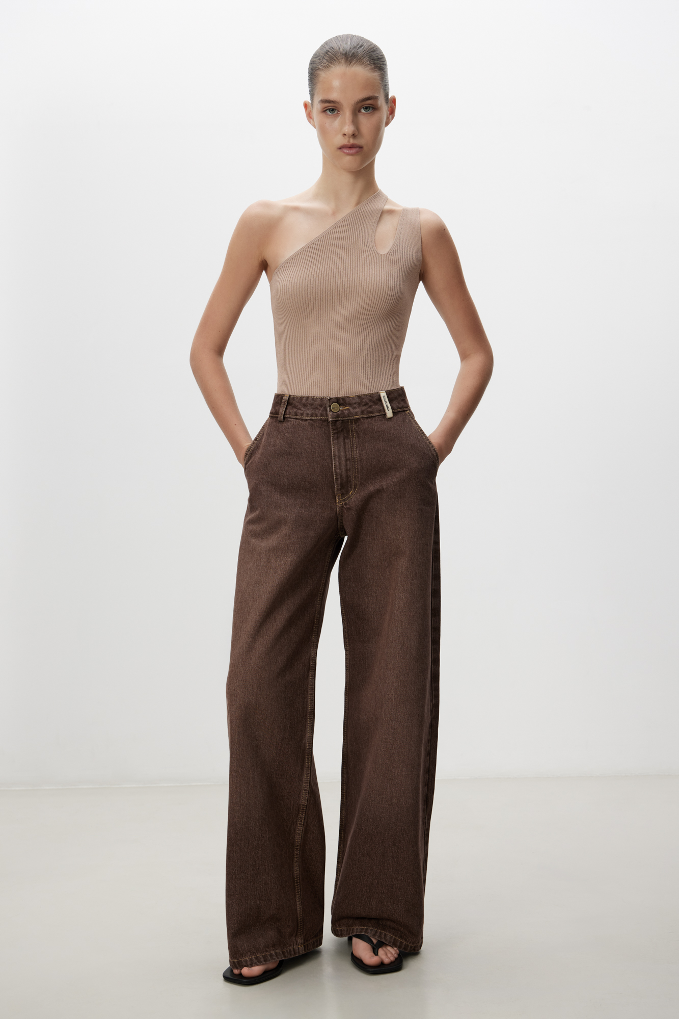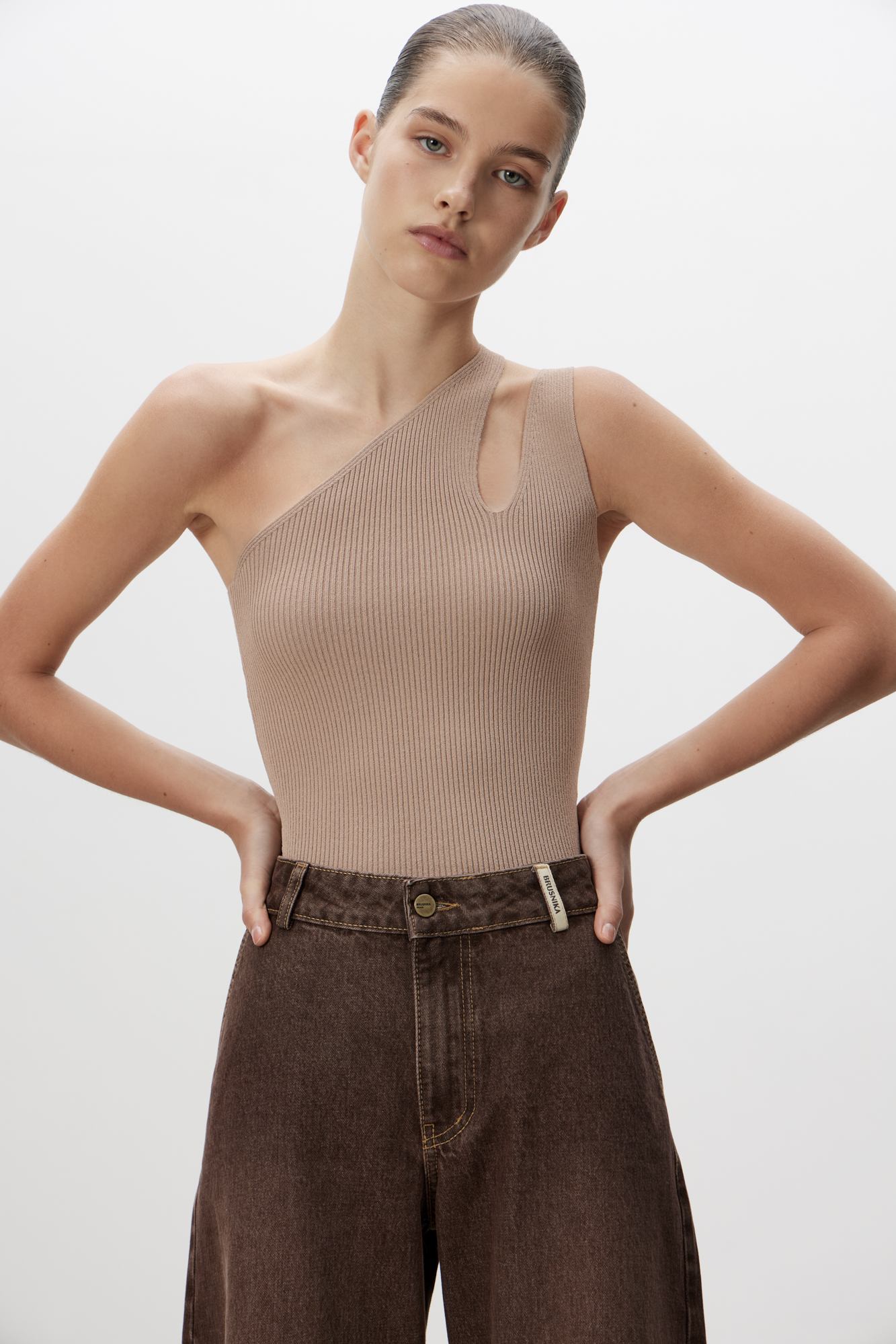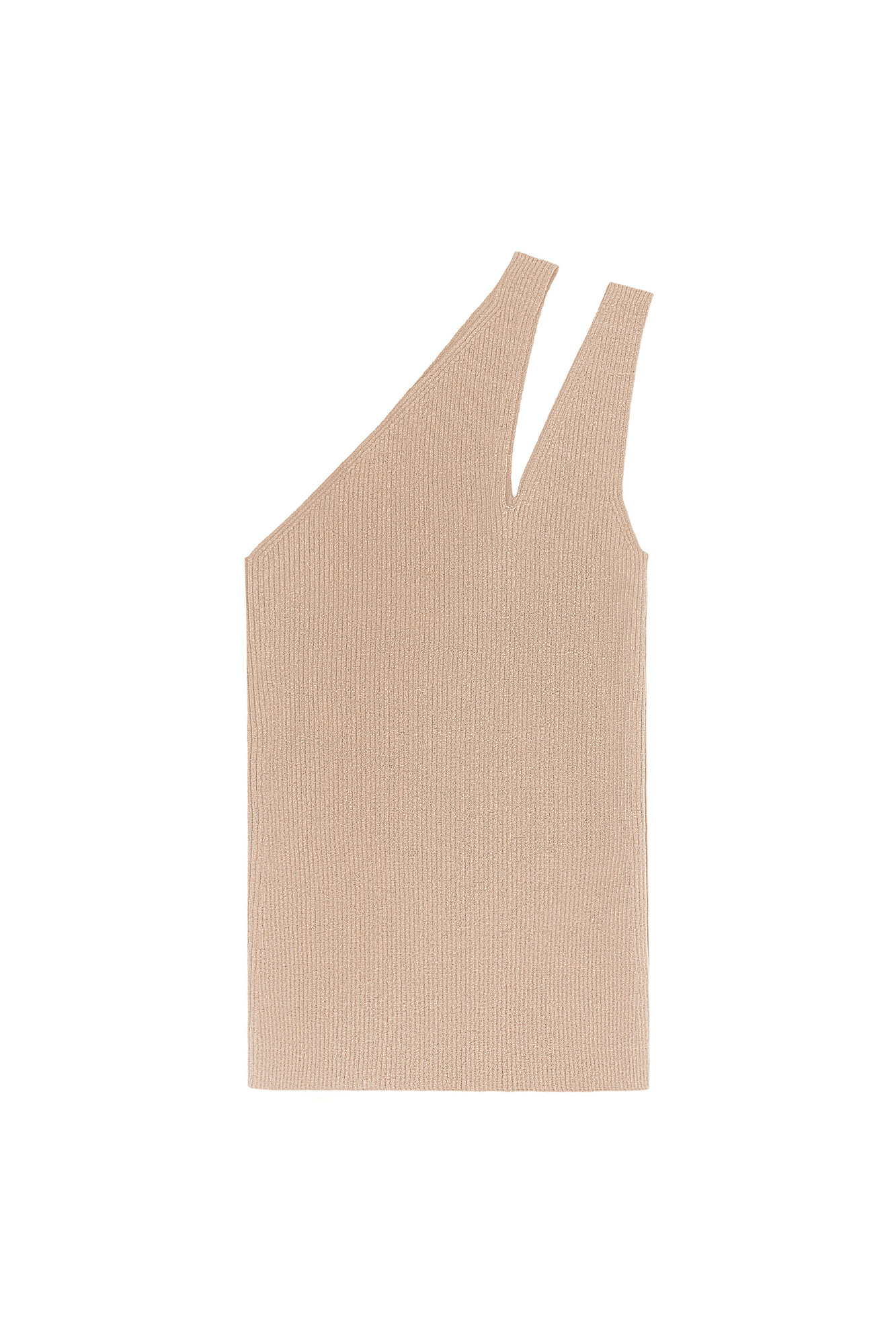 Трикотажный топ из вискозы в рубчик. Модель без рукавов, с двойной лямкой одно на плечо.