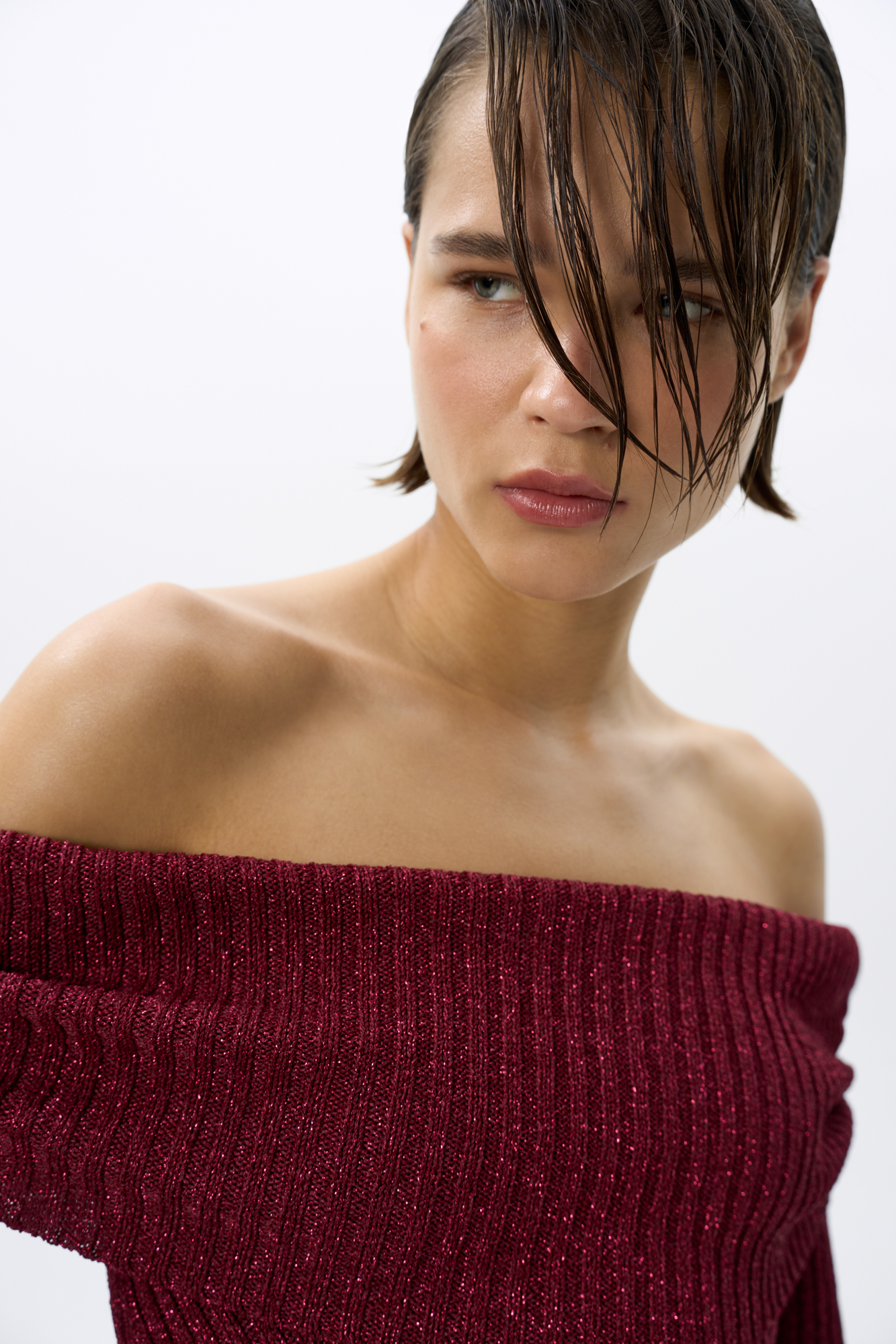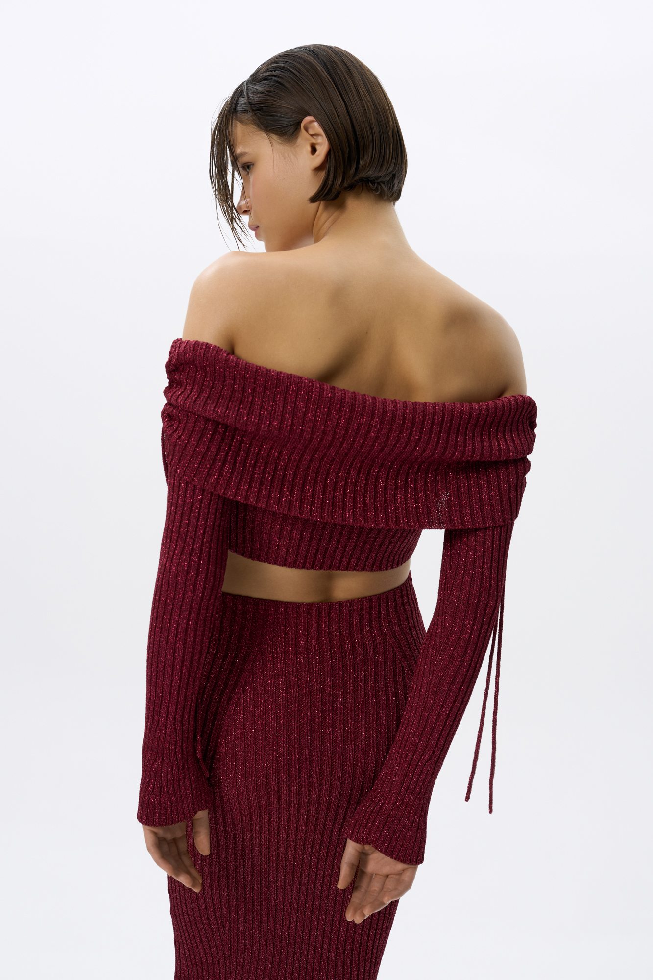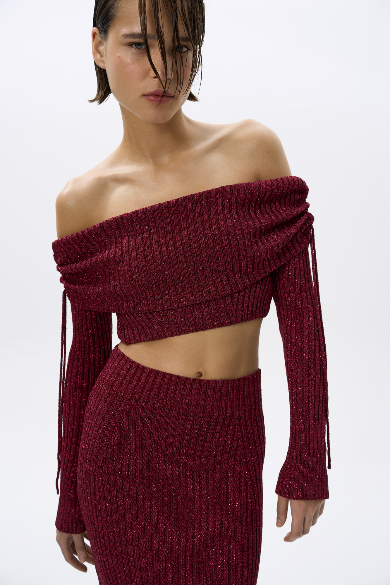 Трикотажный топ с люрексом. Модель укороченного силуэта с длинным рукавом и открытой линией плеч.
