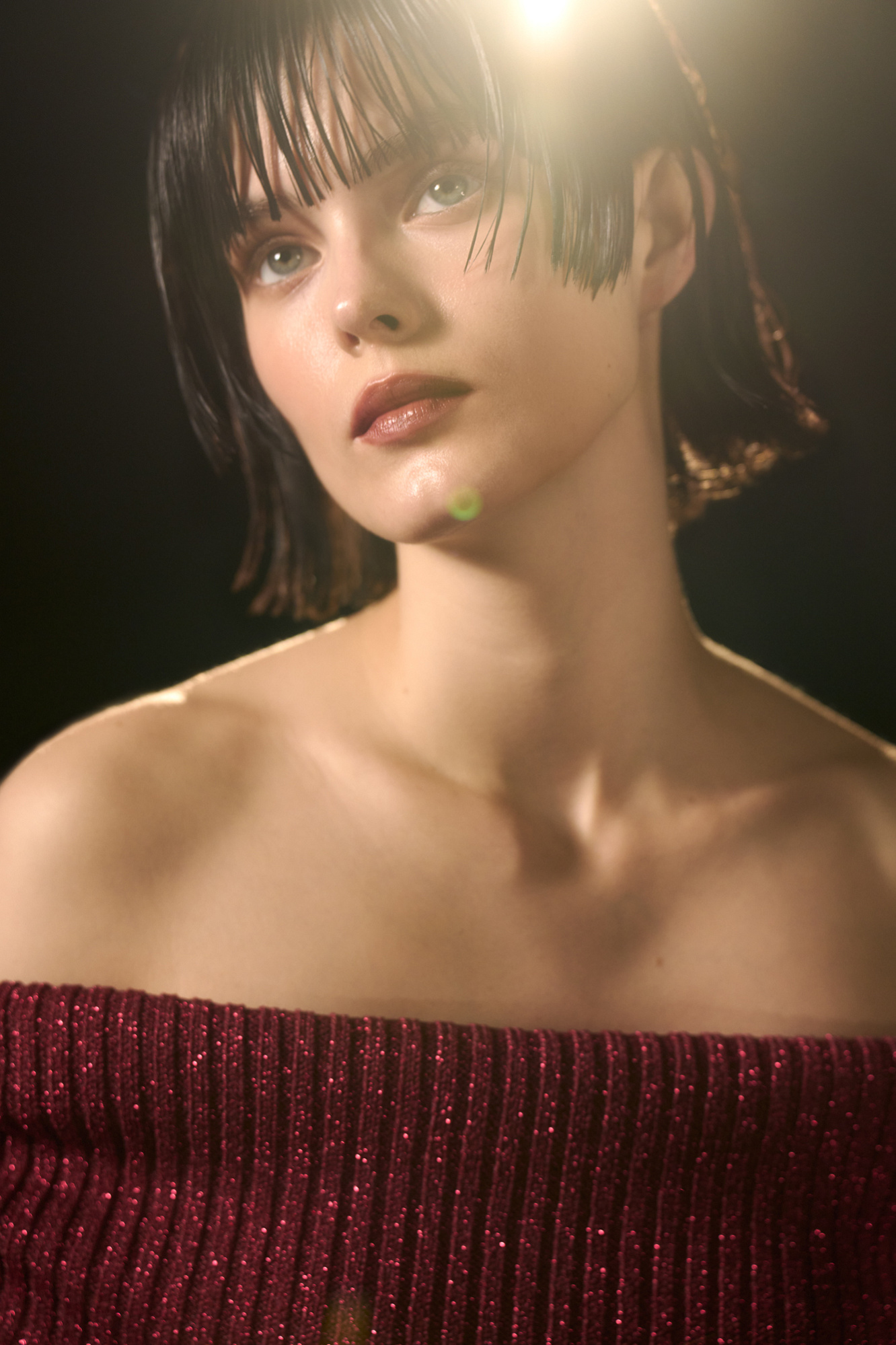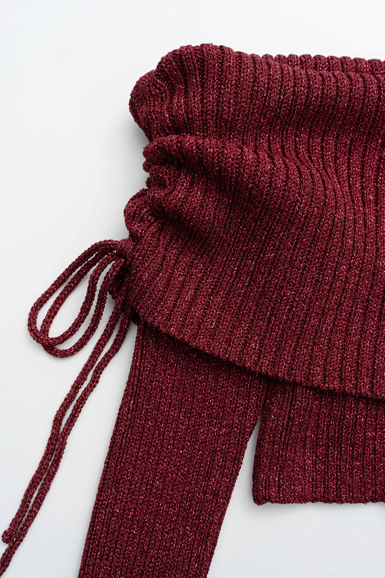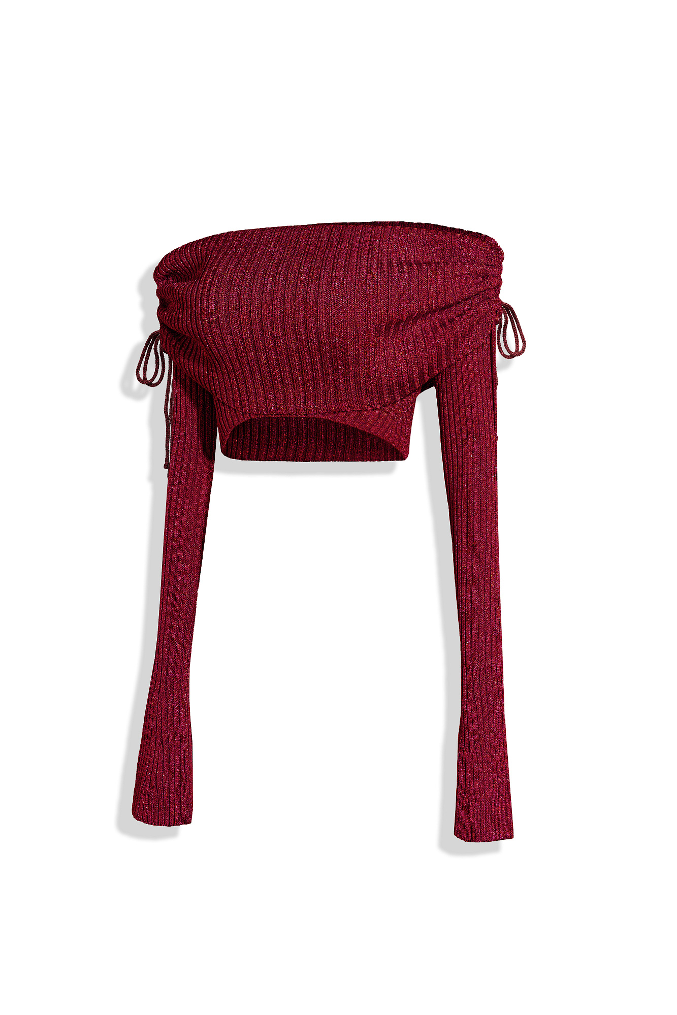 Трикотажный топ с люрексом. Модель укороченного силуэта с длинным рукавом и открытой линией плеч.
