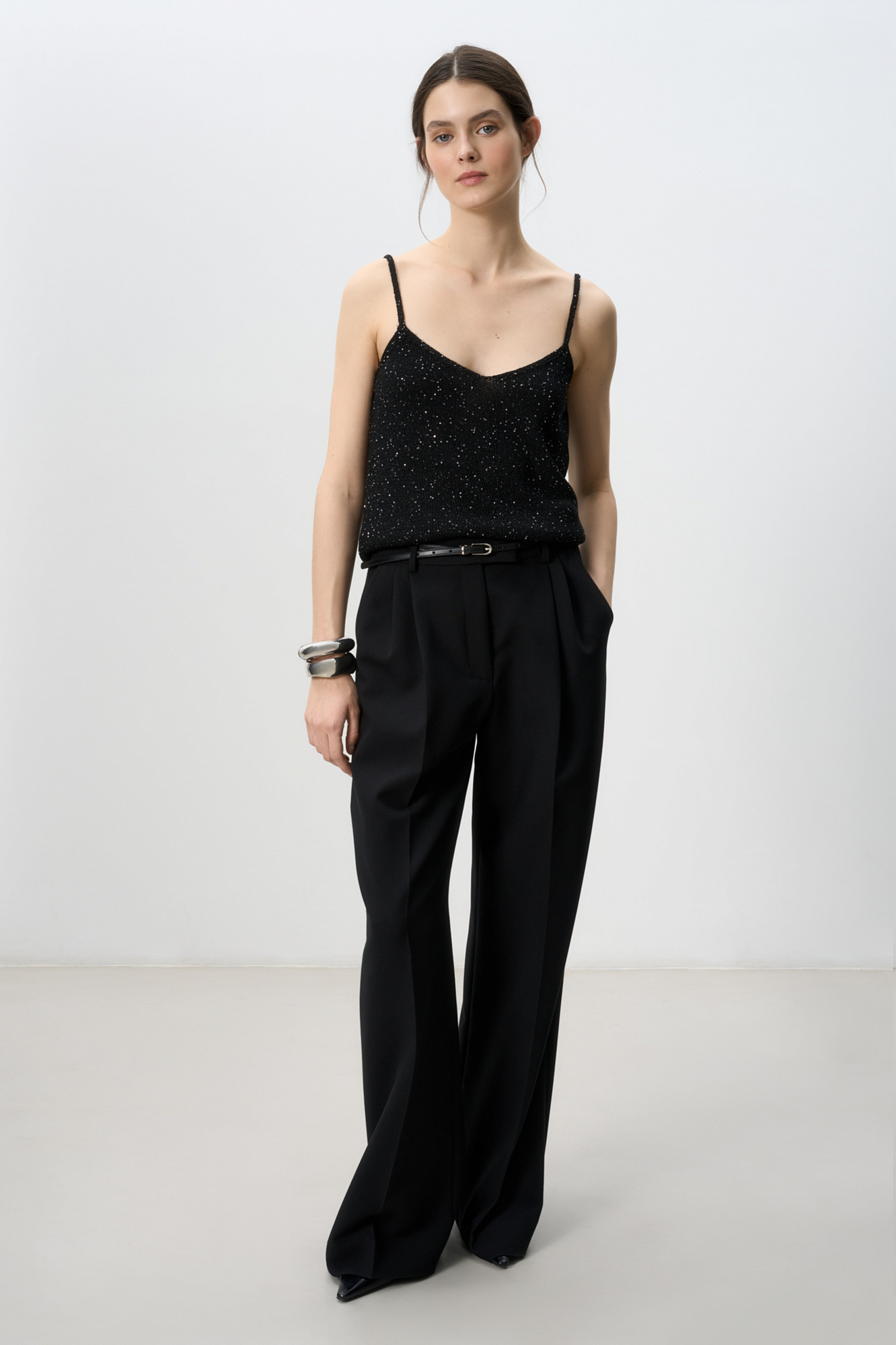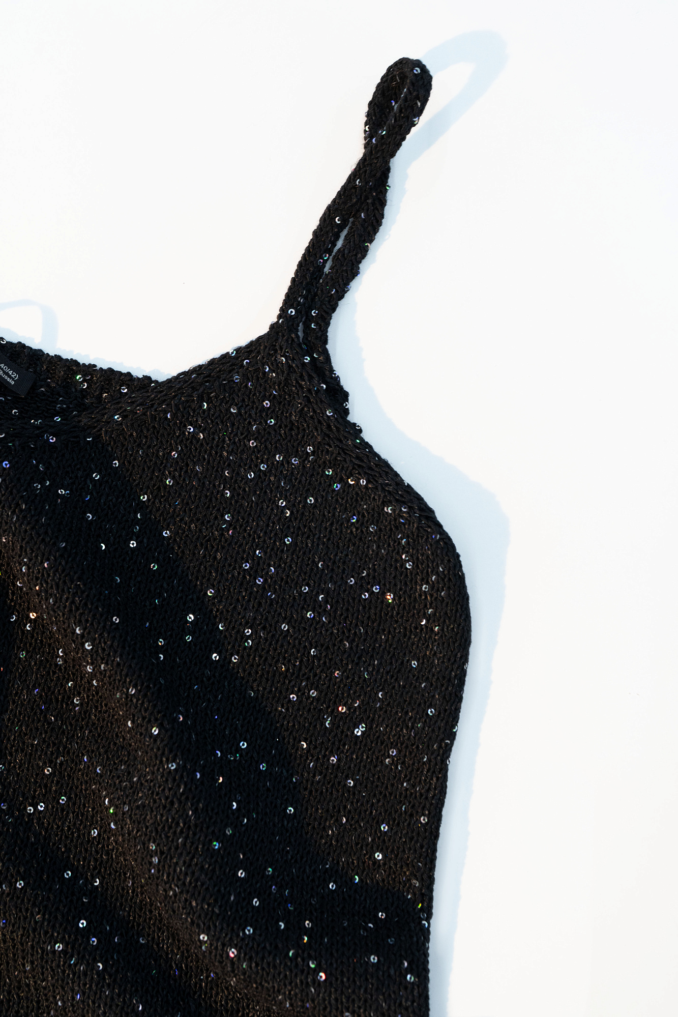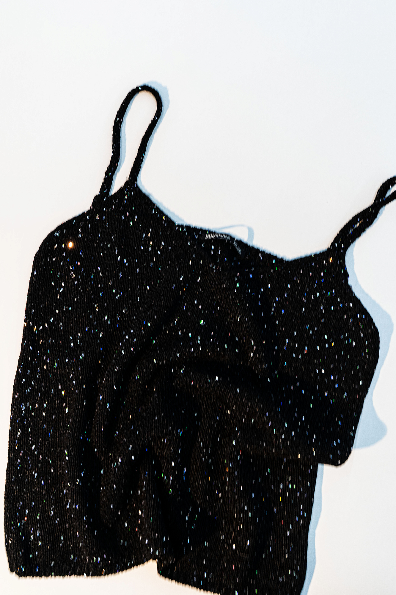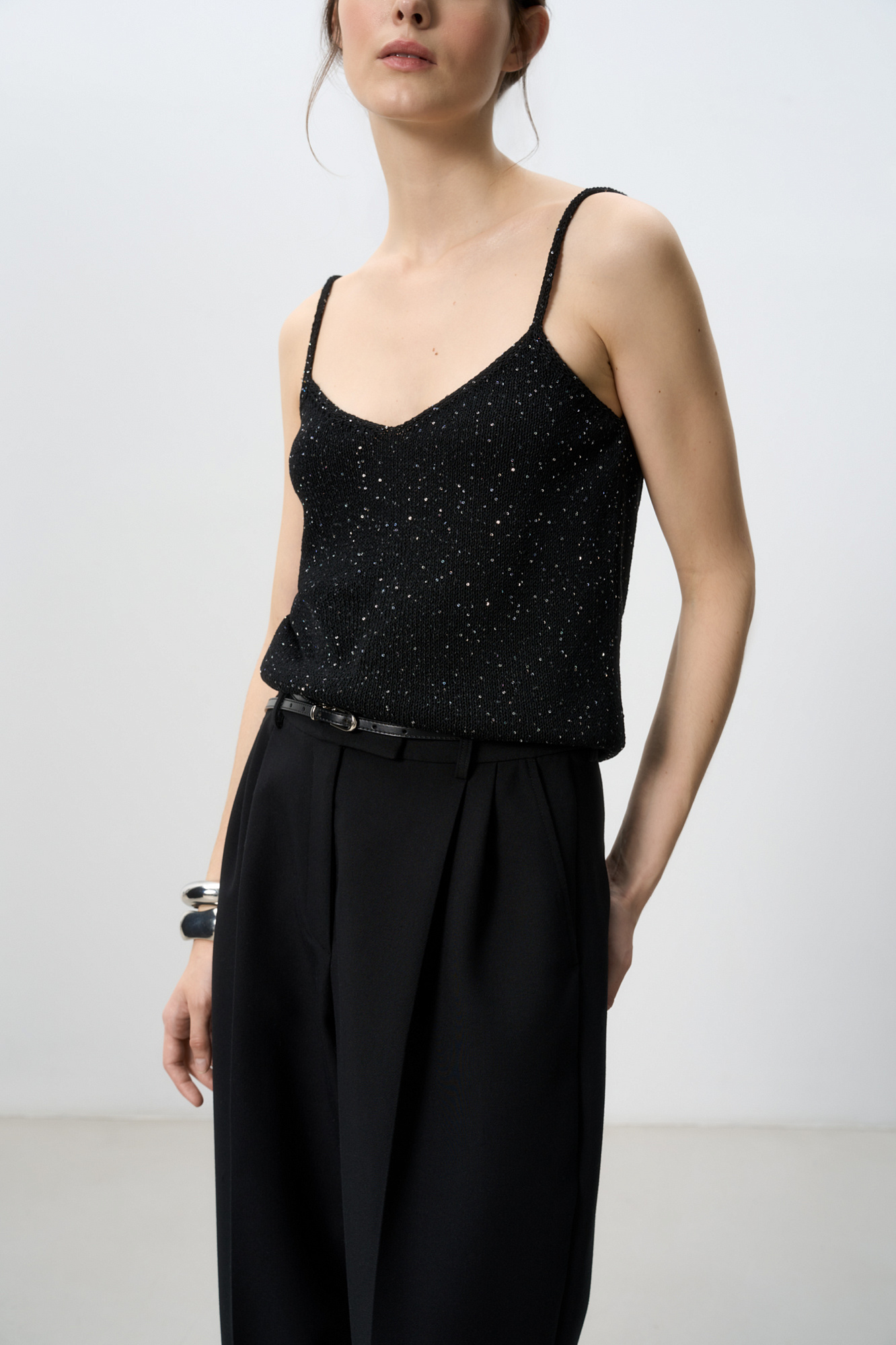 Трикотажный топ из поливискозы на тонких лямках с голографическими пайетками.