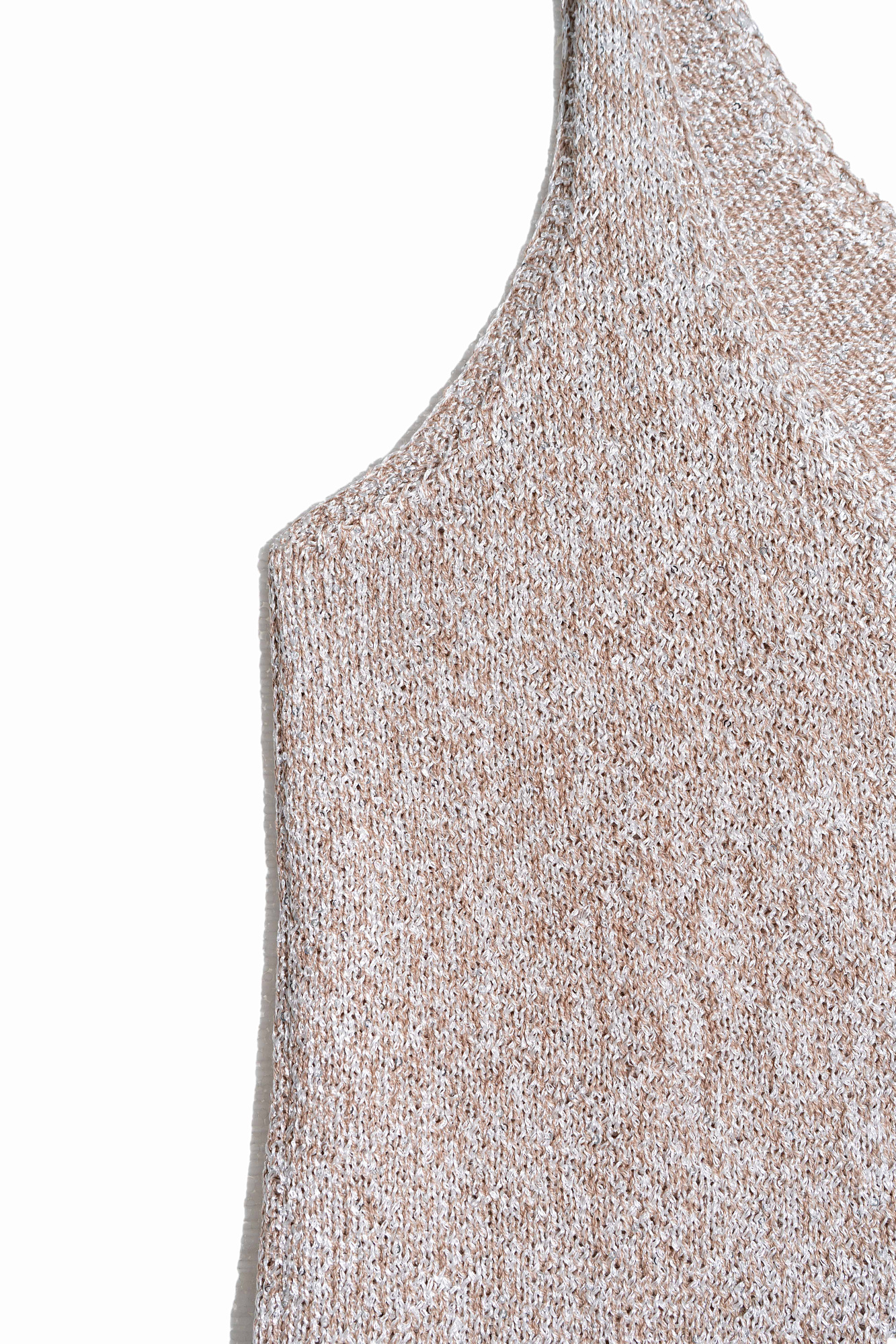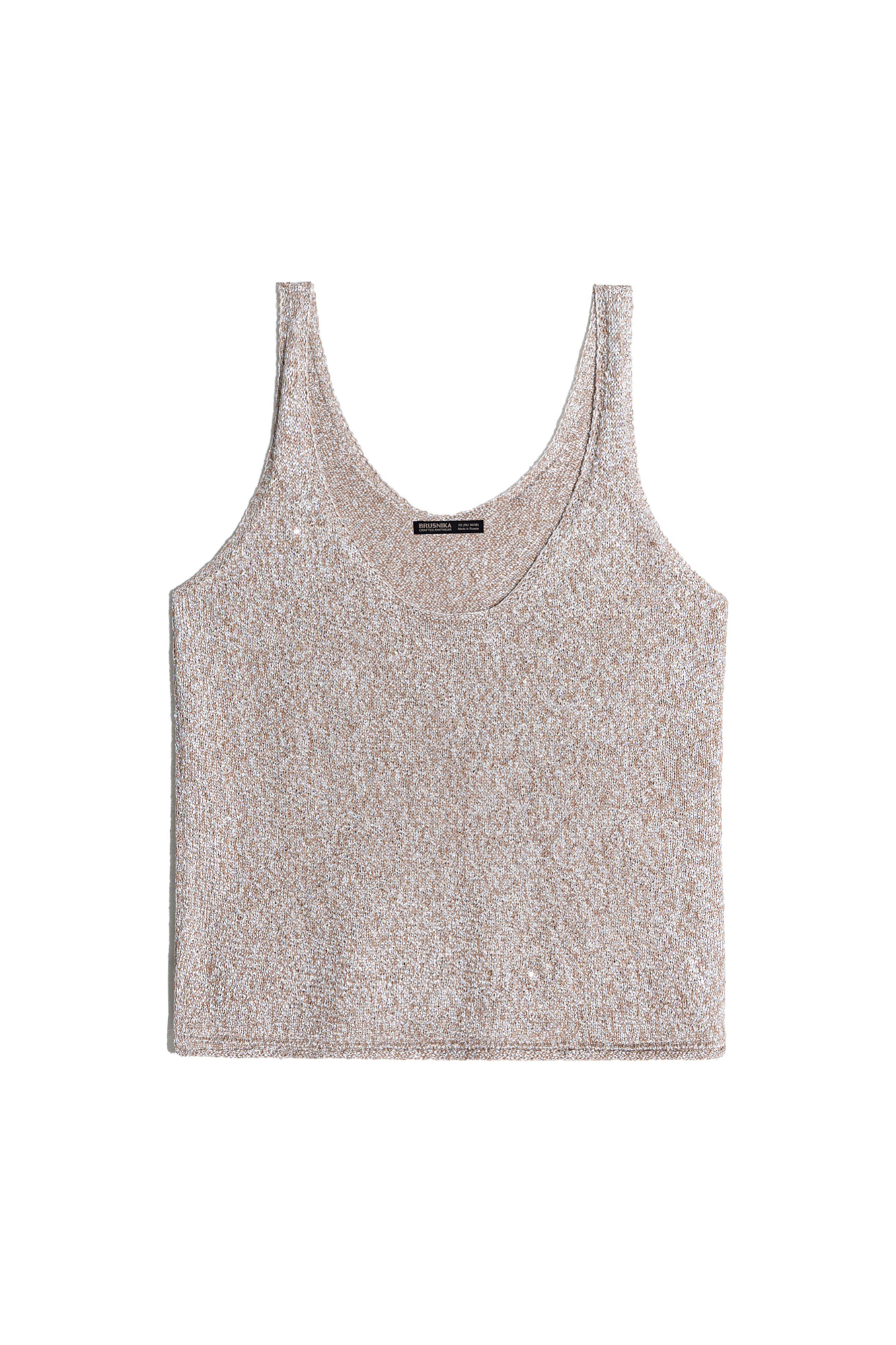 Трикотажный топ из хлопка с пайетками. Модель прямого кроя, на бретельках, с глубоким вырезом горловины.