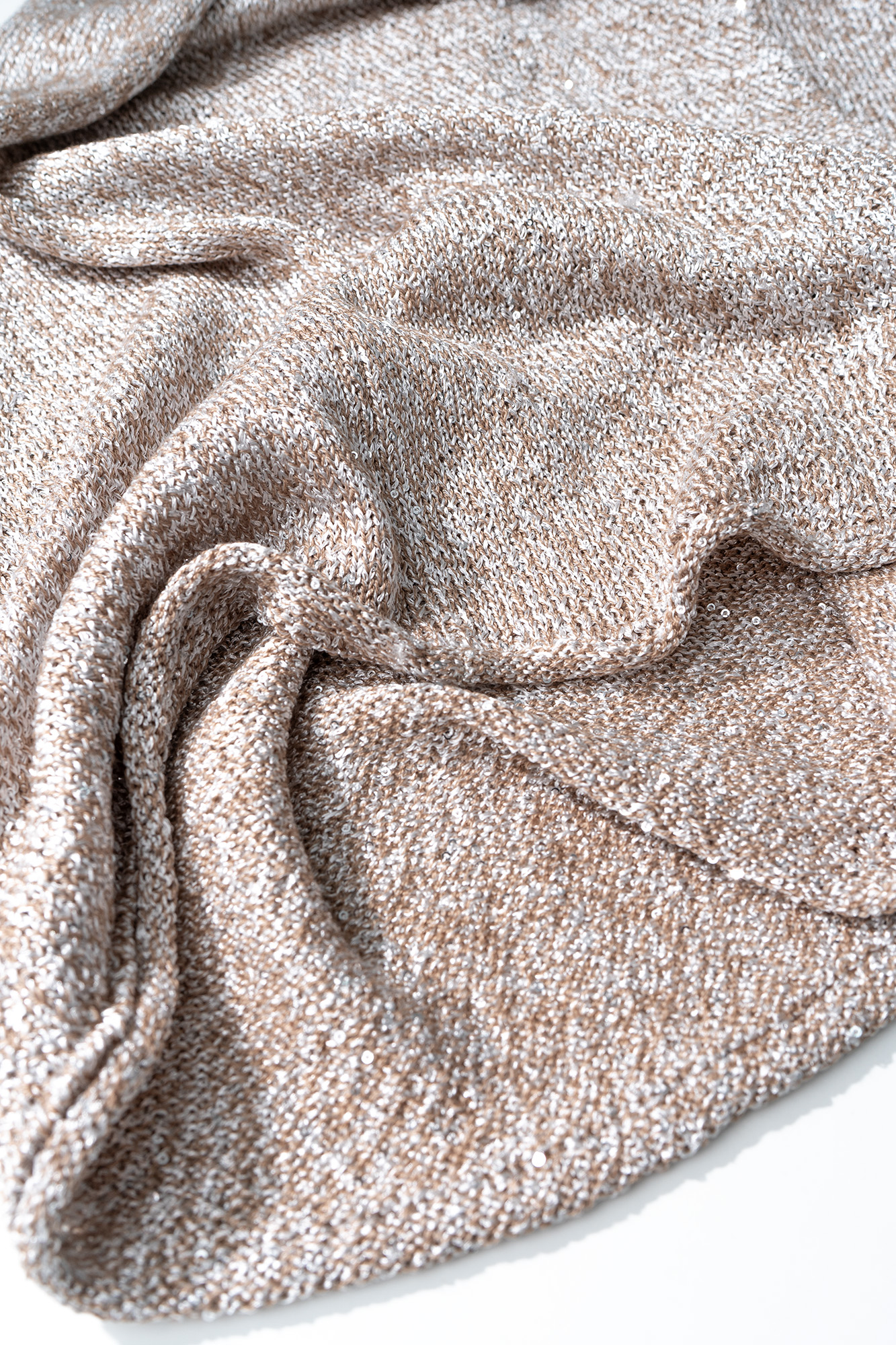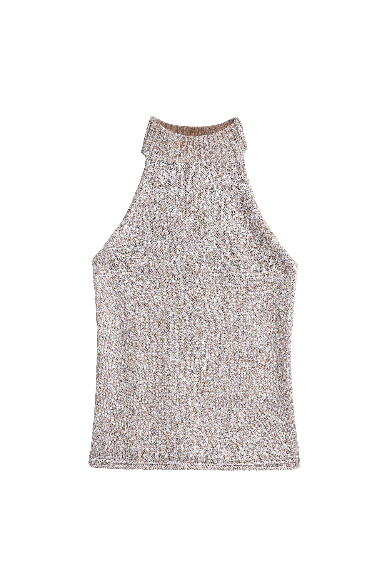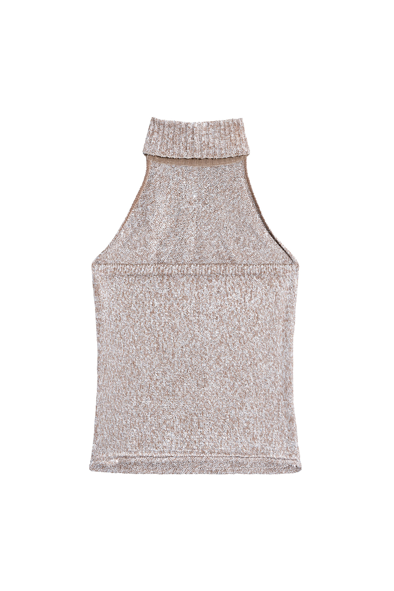 Трикотажный топ из хлопка с пайетками. Модель свободного кроя с американской проймой, высоким воротом и открытой спинкой.