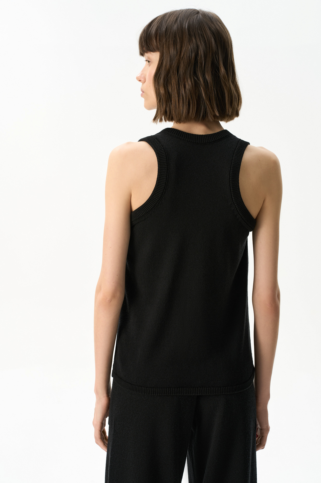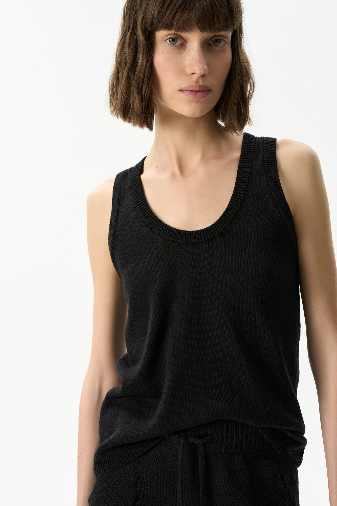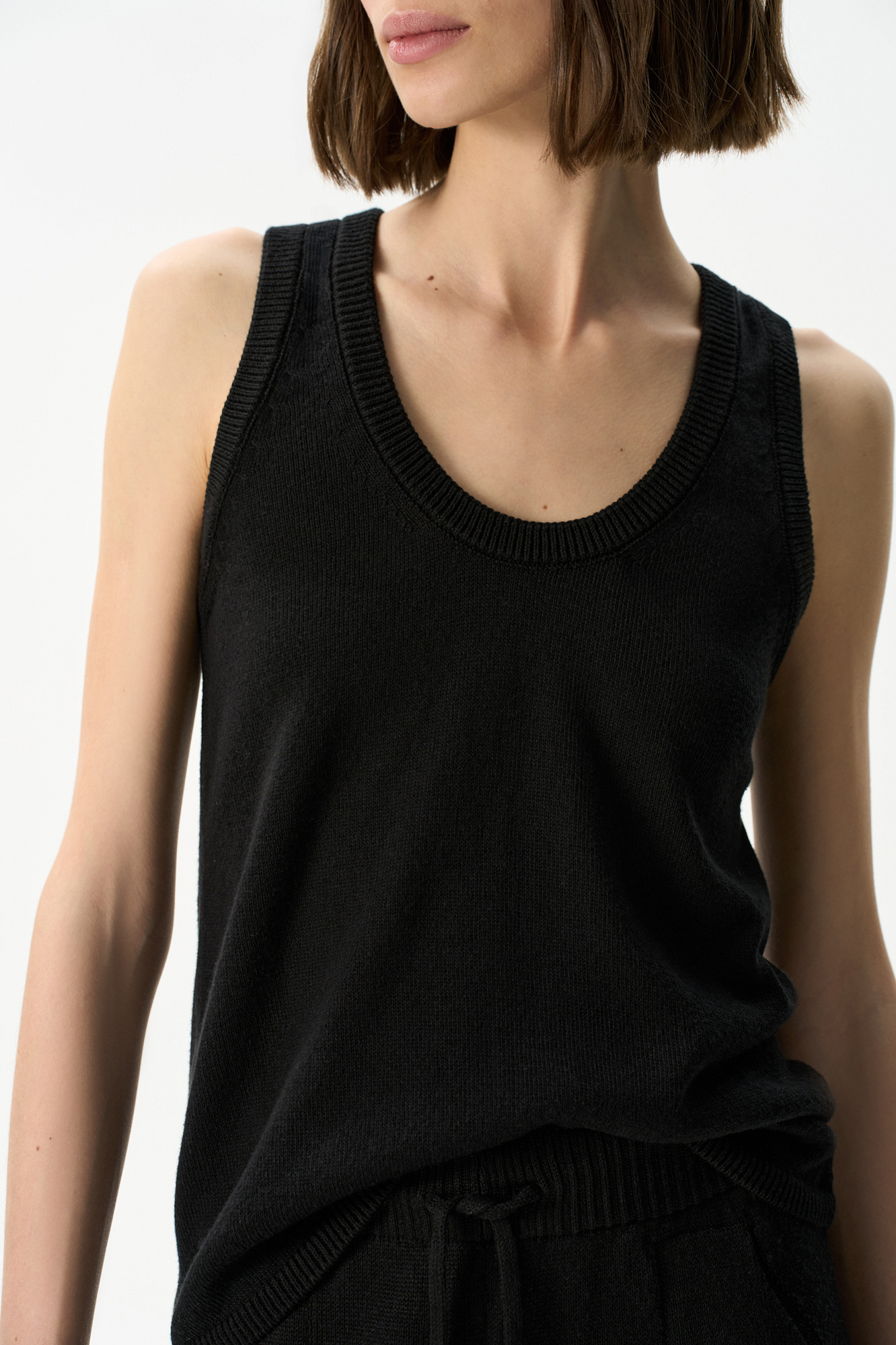 Трикотажный топ из хлопка с добавлением вискозы. Модель прияталенного силуэта, с U-образным вырезом горловины и глубокой проймой.