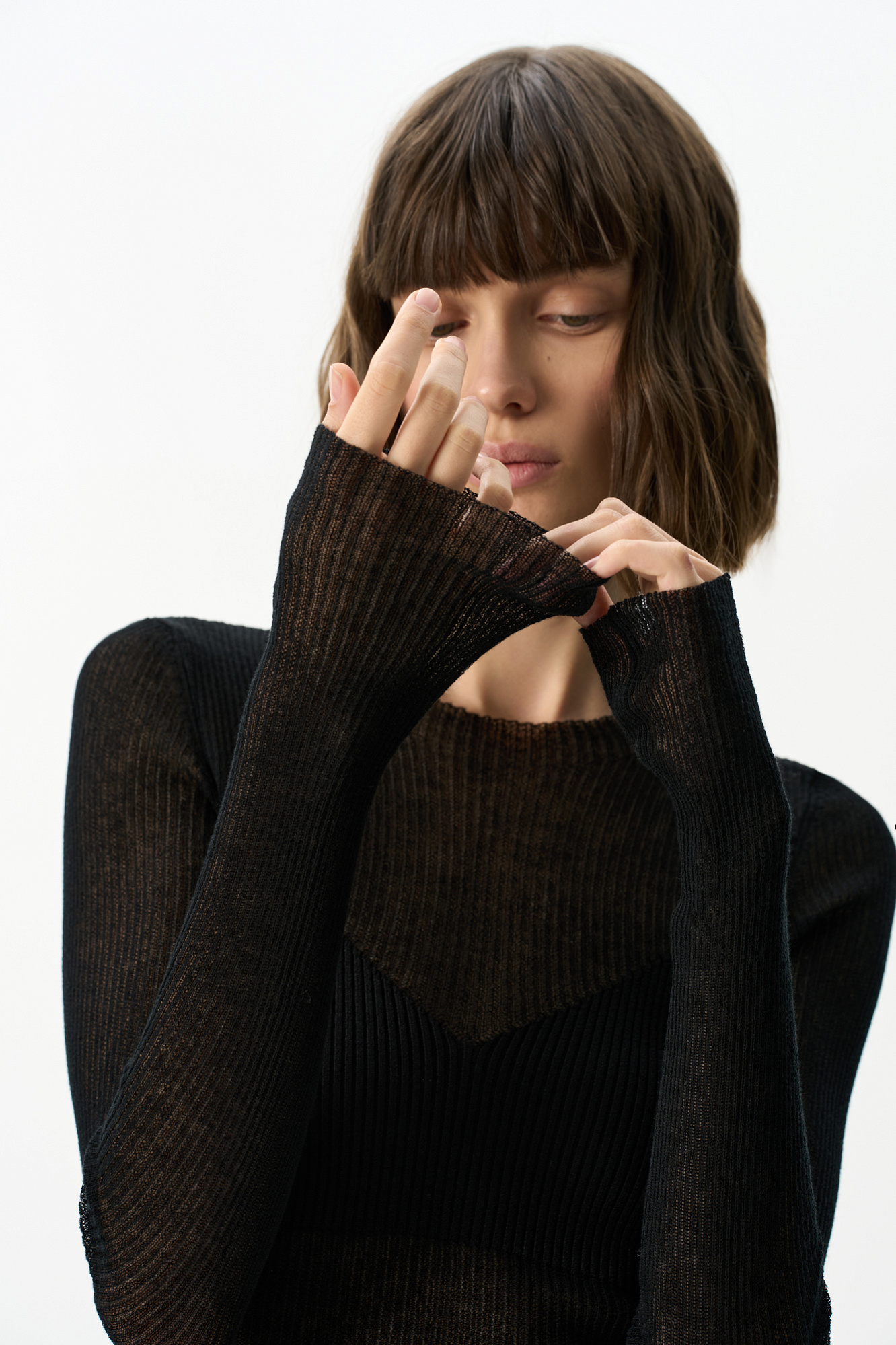 Трикотажный кроп-топ из тонкого хлопка с добавлением вискозы. Модель приталенного силуэта, с длинными рукавами и круглым вырезом горловины. Изделие выполнено в комбинированной вязке, сочетая полупрозрачную и более плотную текстуры, создавая акцент на лифе.