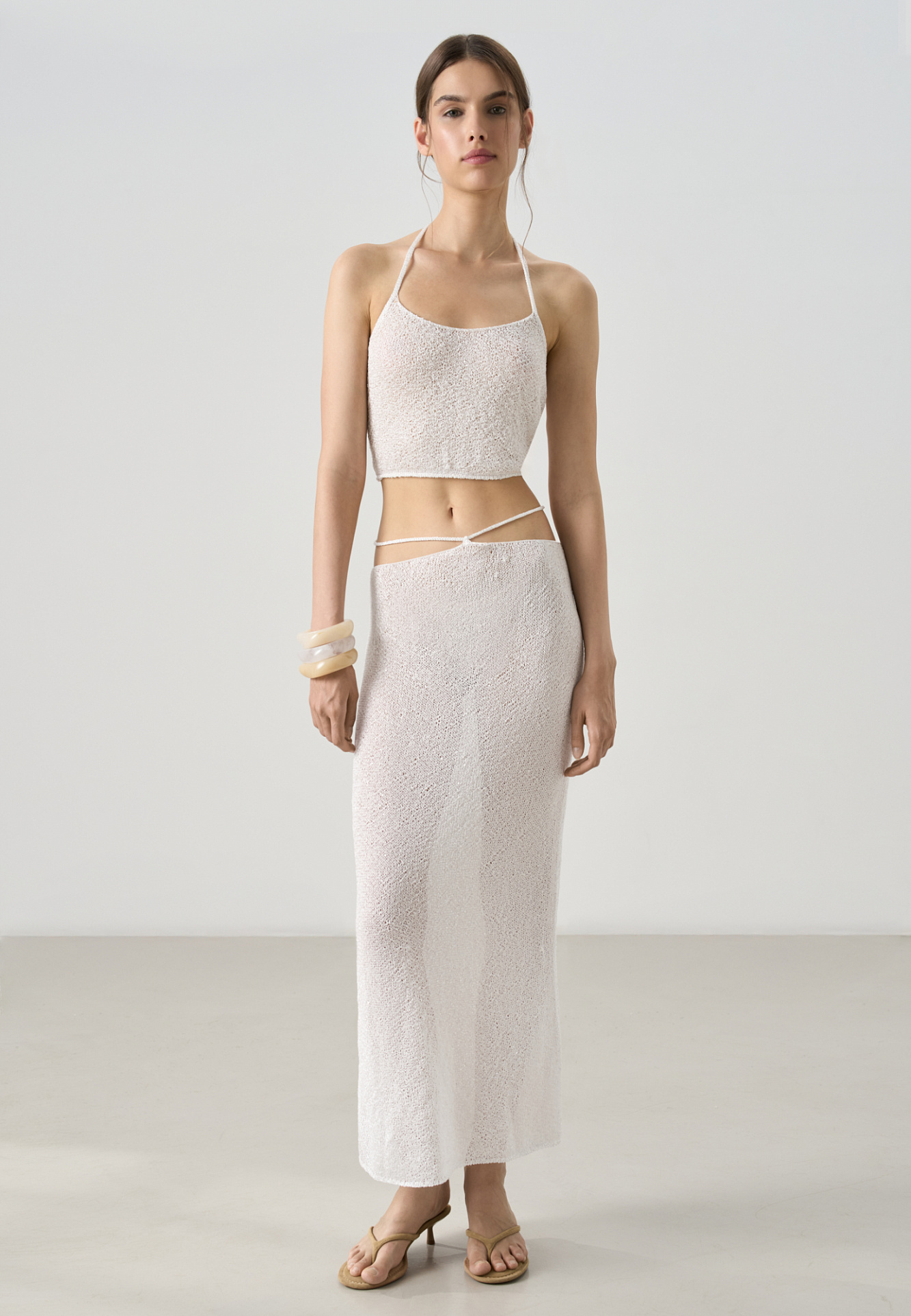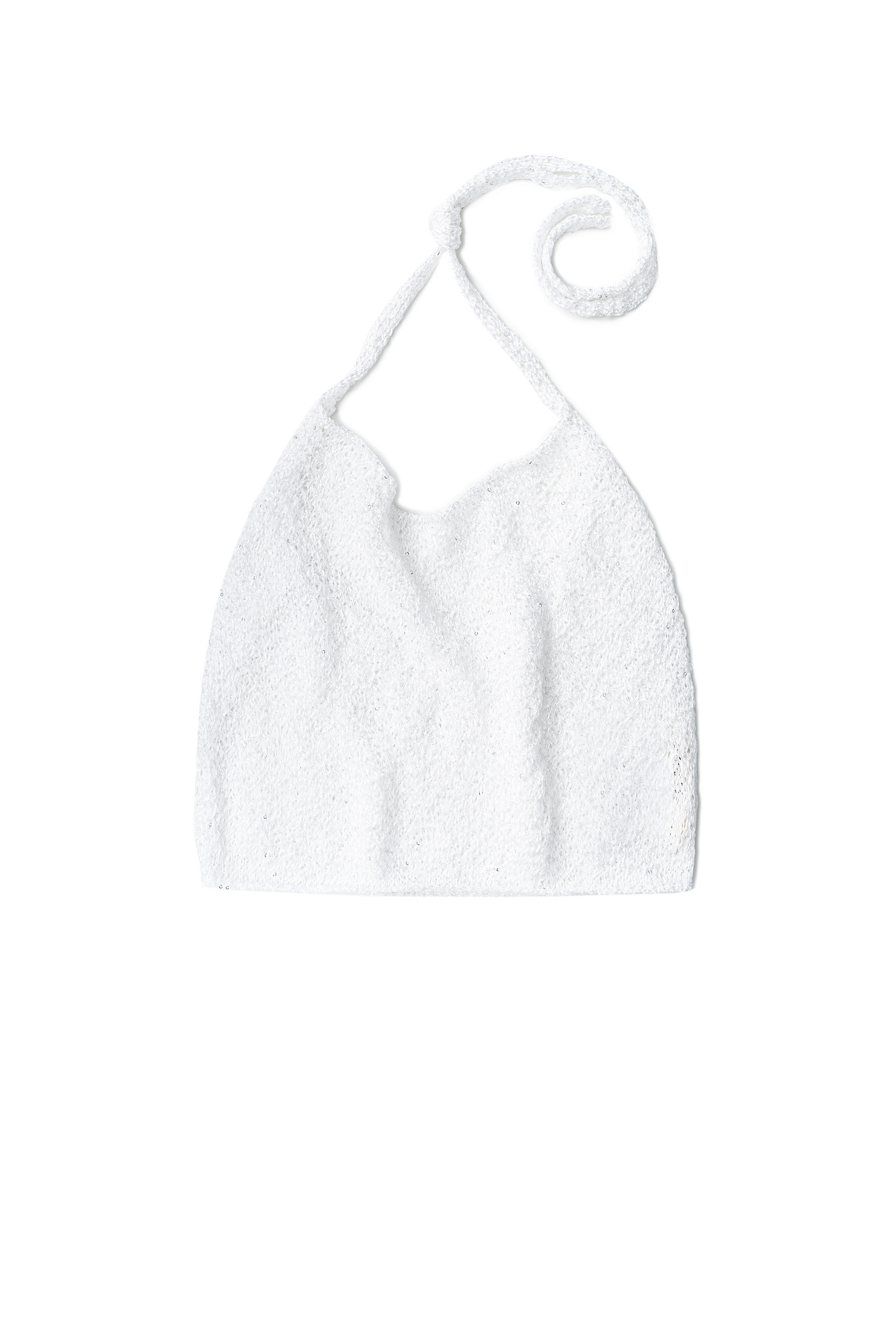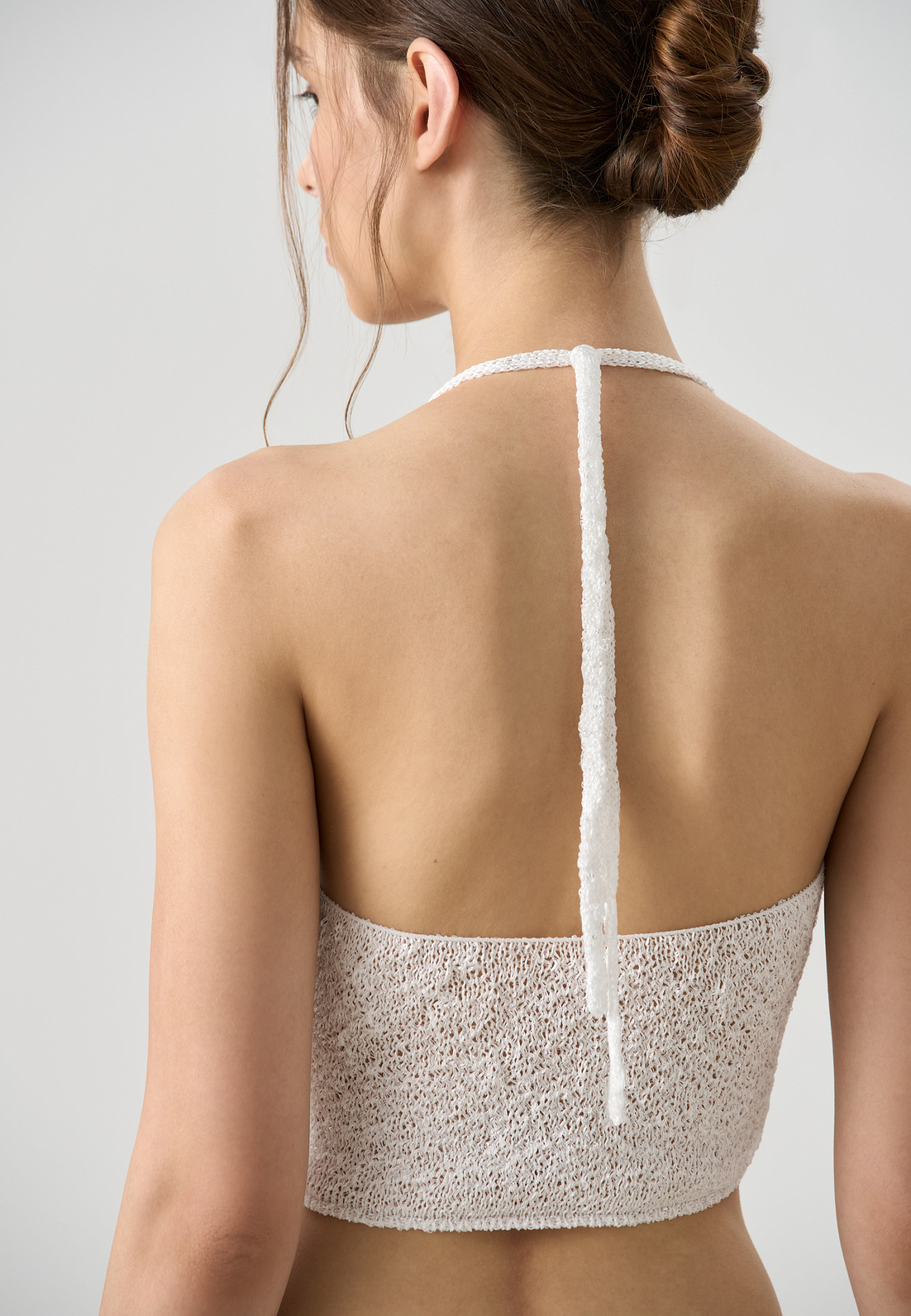 Трикотажный короткий топ из хлопка с добавлением вискозы. Модель прямого кроя с открытой спиной и двумя лямками-завязками на шее. Без подкладки.
