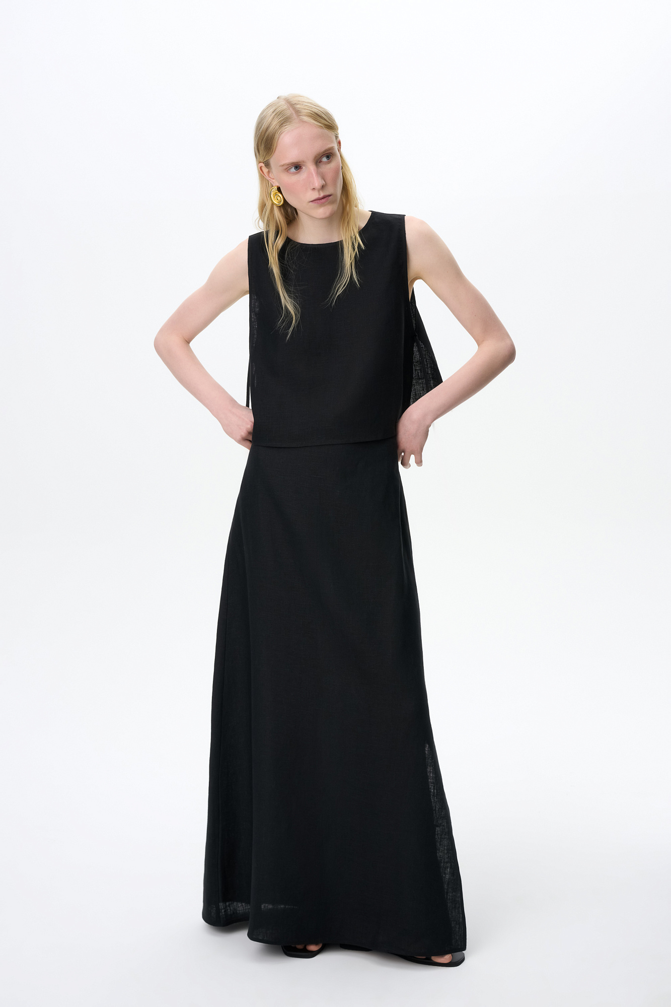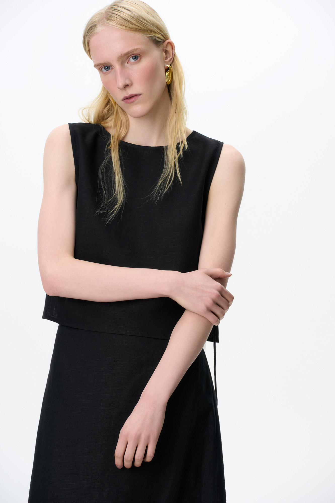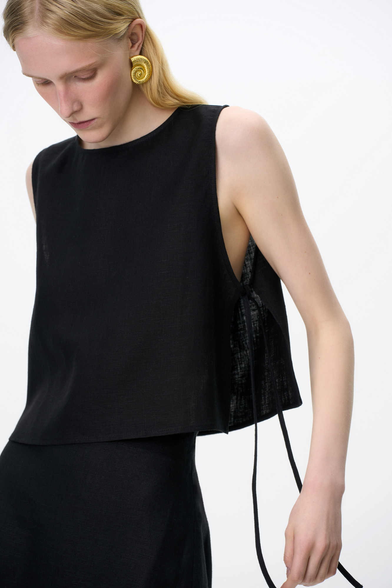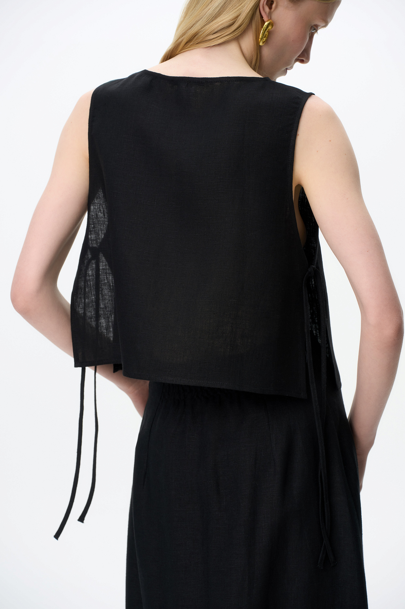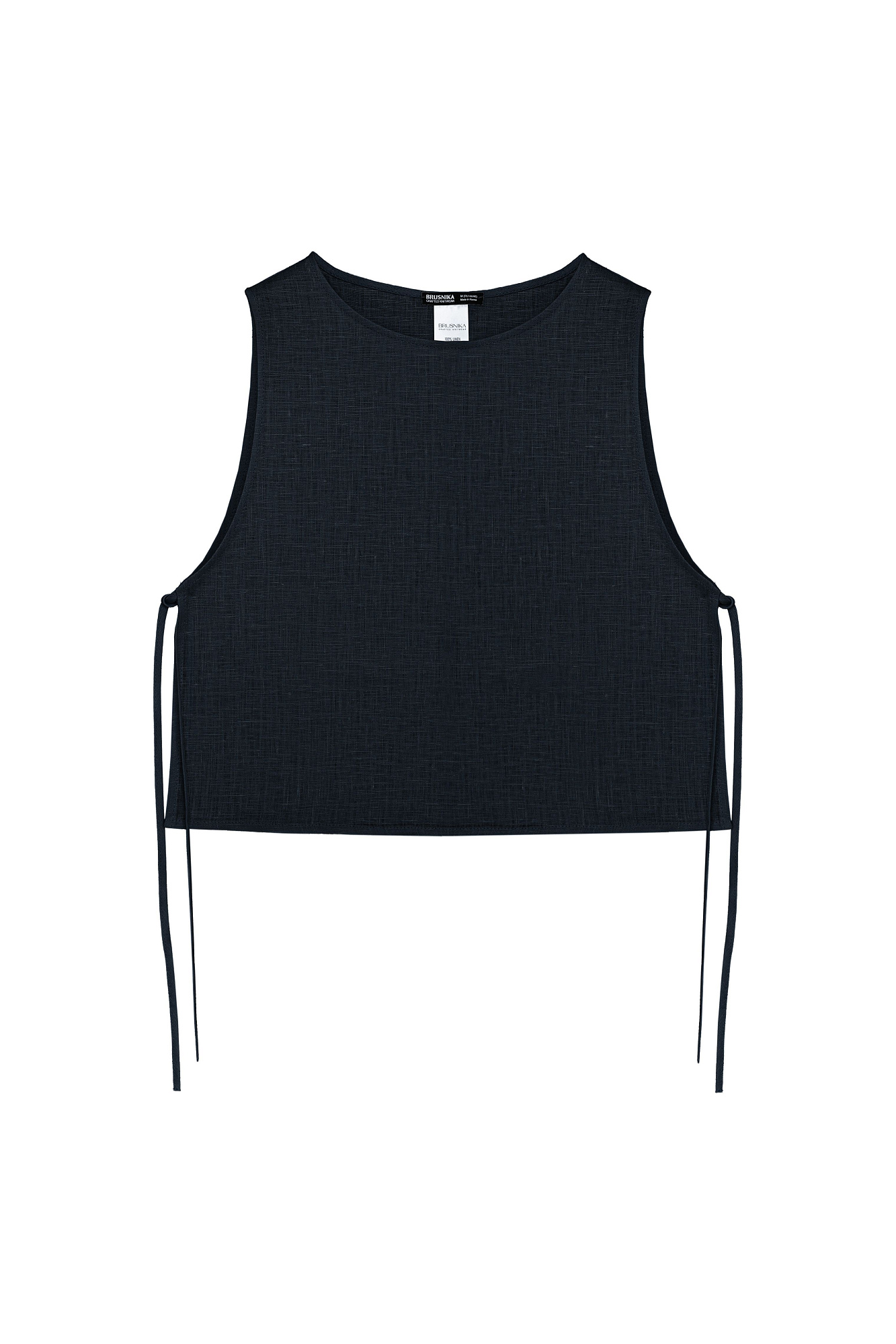 Укороченный топ из 100% льна. Модель свободного кроя, без рукавов, с круглым вырезом горловины. Изделие фиксируется завязками по бокам.