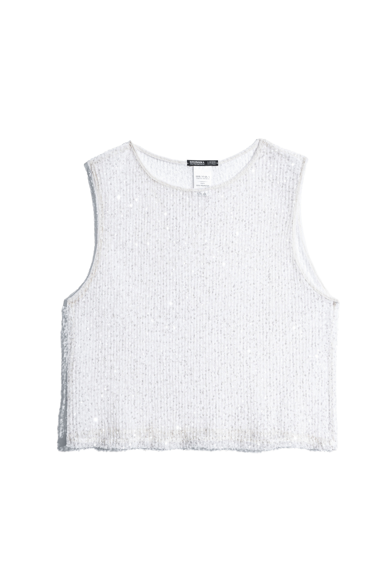 Прозрачный топ без рукавов, с круглым вырезом горловины. Модель декорирована пайетками.