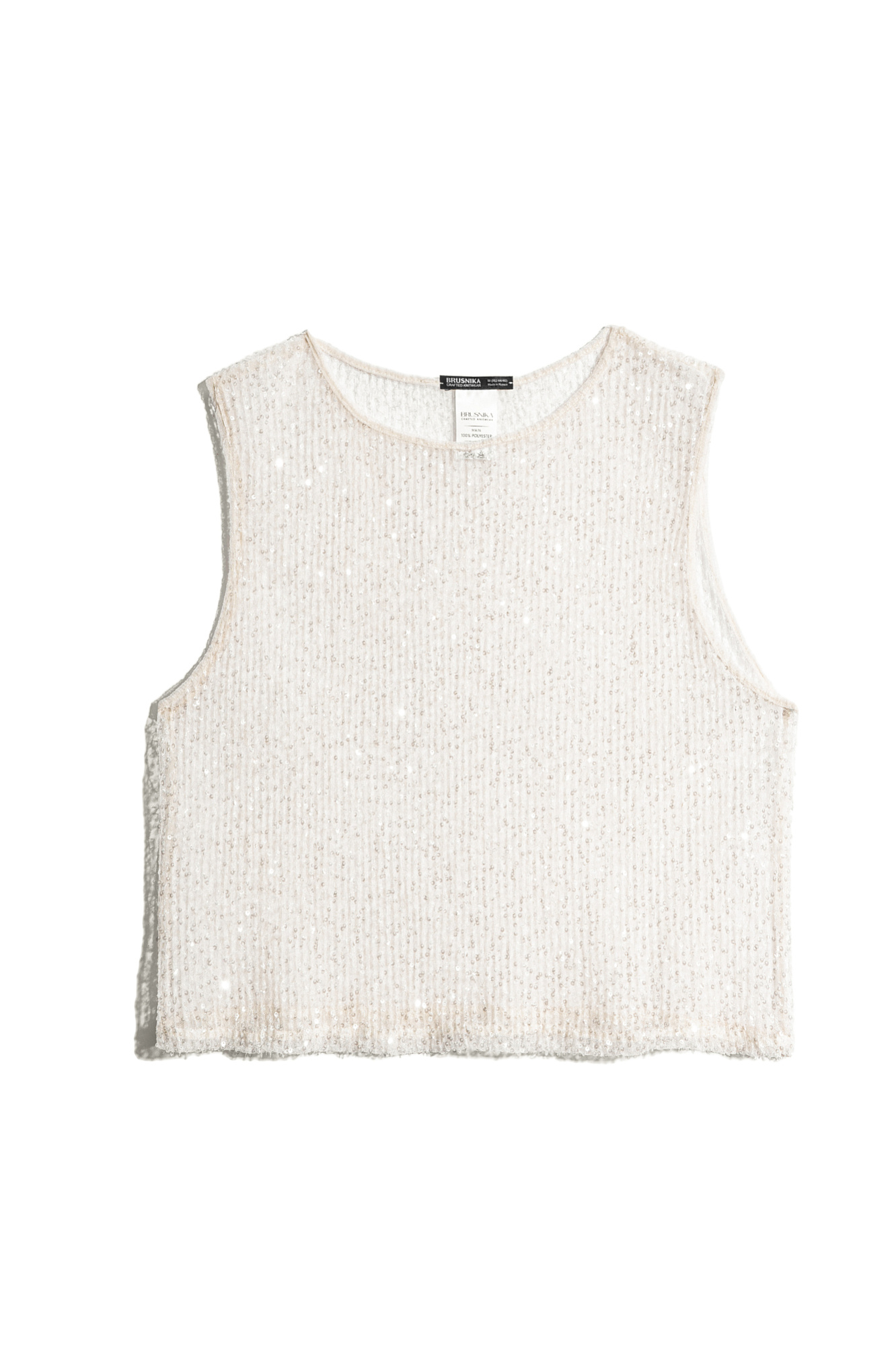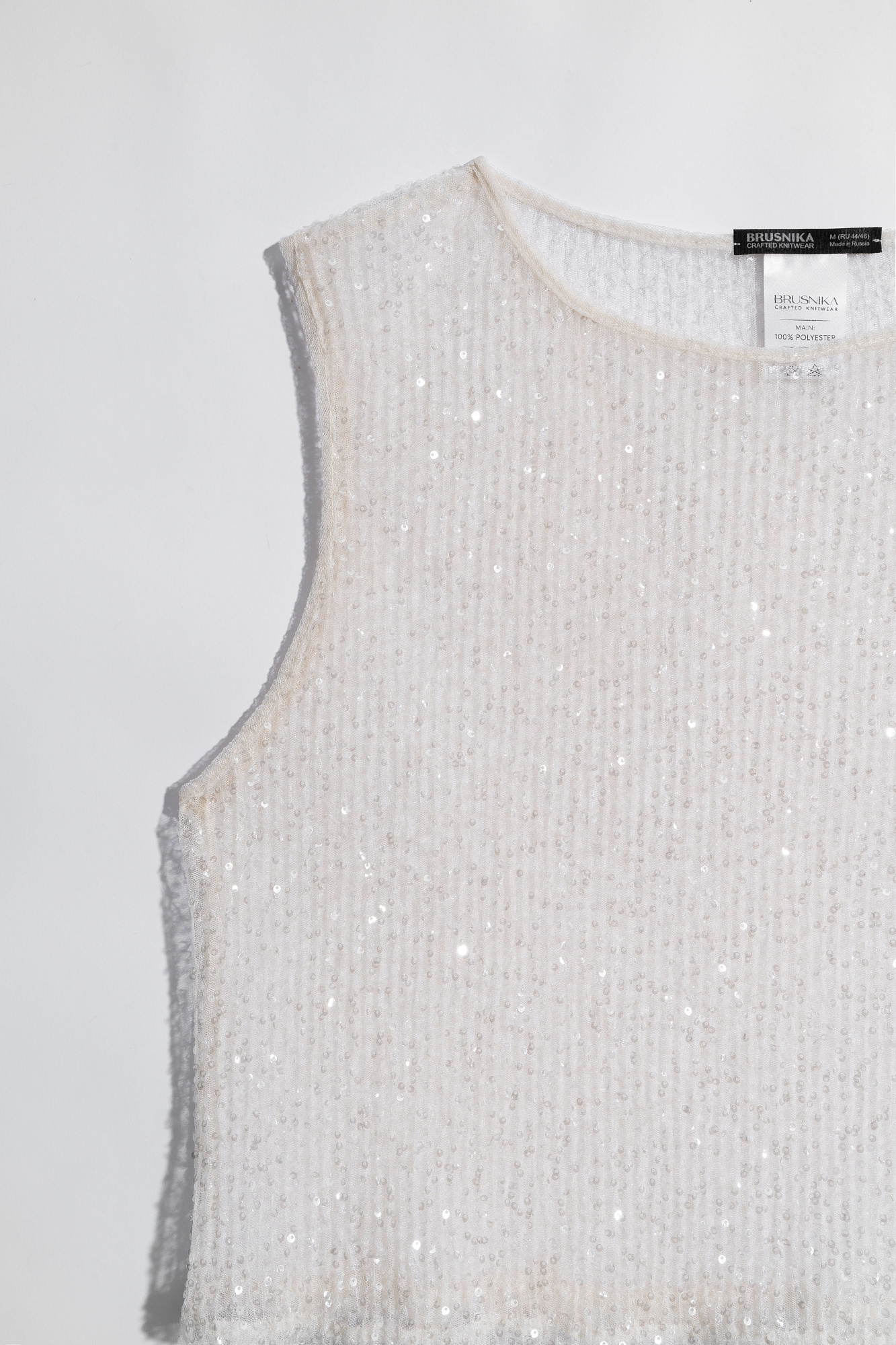 Прозрачный топ без рукавов, с круглым вырезом горловины. Модель декорирована пайетками.