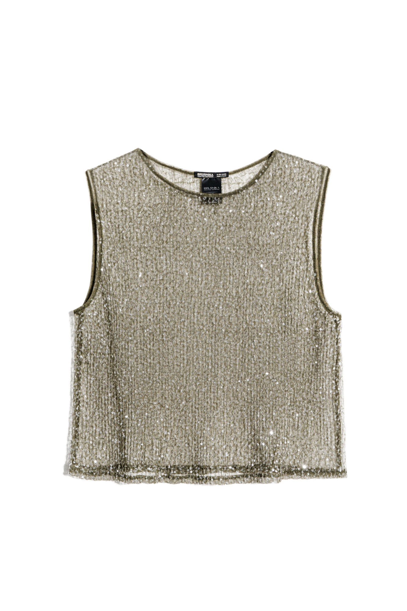Прозрачный топ без рукавов, с круглым вырезом горловины. Модель декорирована пайетками.