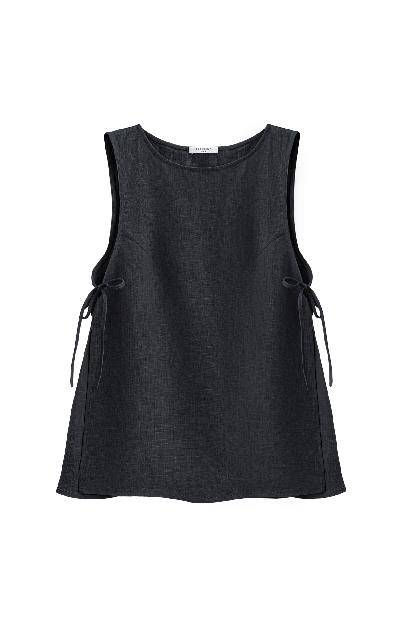 Топ из 100% льна. Модель свободного кроя, без рукавов, с круглым вырезом горловины. Изделие фиксируется завязками по бокам.