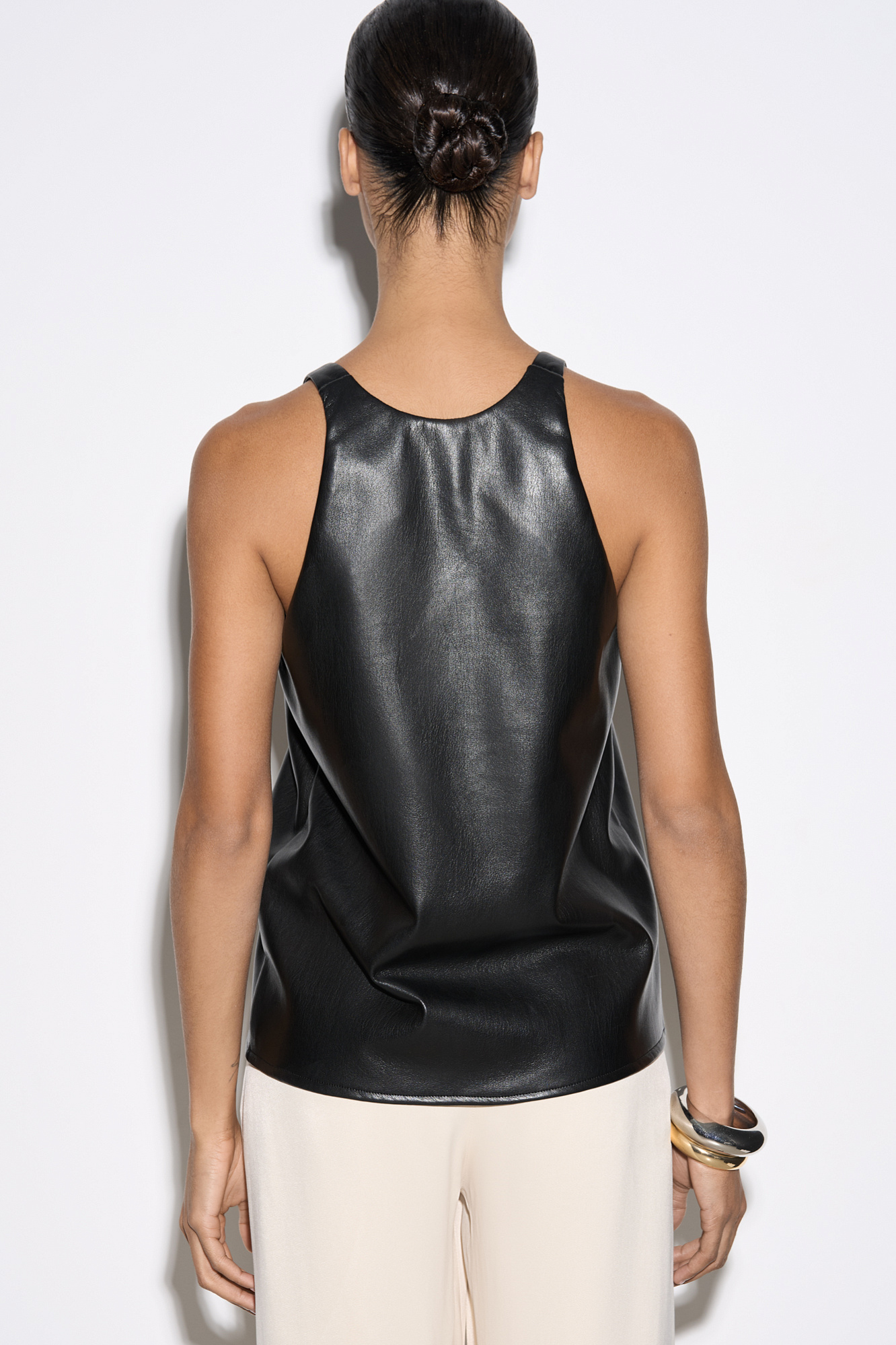 Топ из текстурной экокожи. Модель свободного силуэта на тонких бретельках и глубоким вырезом декольте.