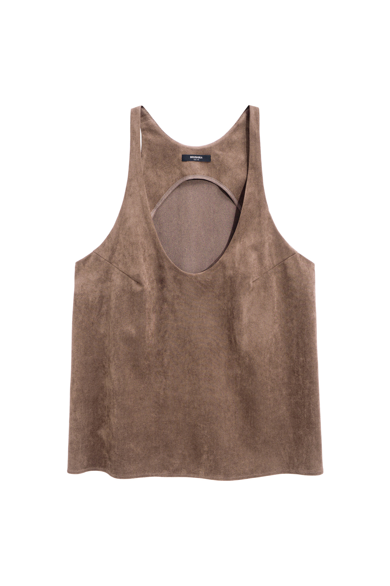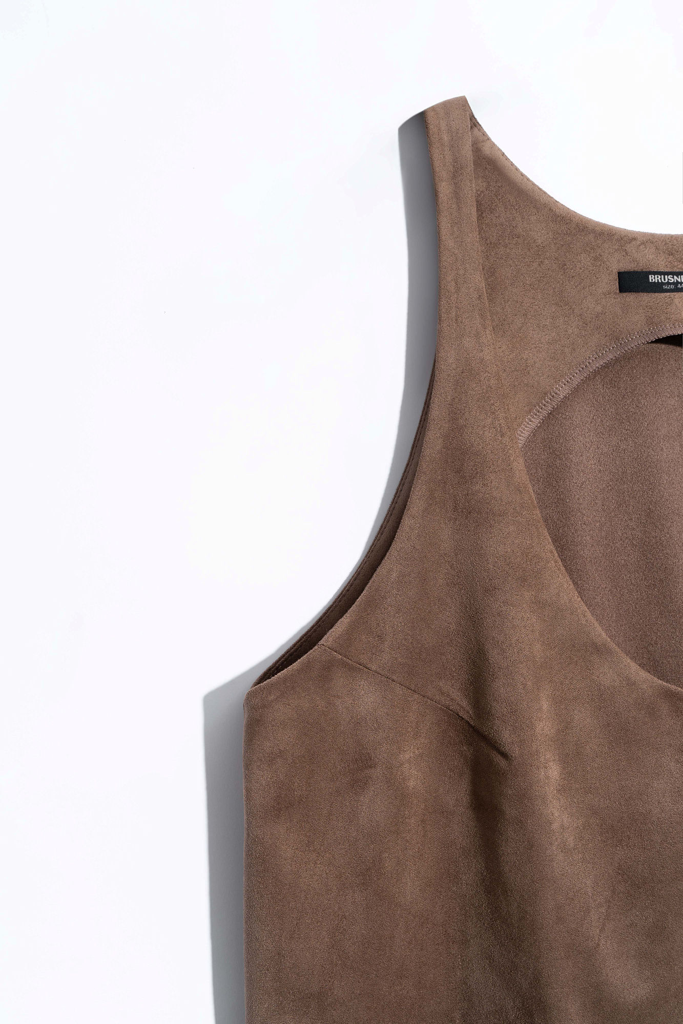 Топ из ткани с имитацией внешнего вида и свойств натуральной замши. Модель свободного силуэта на тонких бретельках и глубоким вырезом декольте.