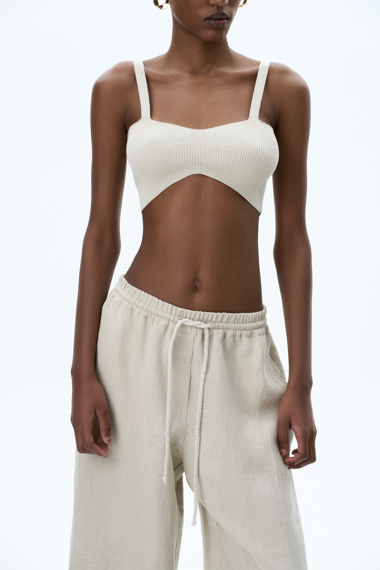 Трикотажный кроп-топ из вискозы. Модель на тонких бретелях. Изделие выполнено в рубчик.