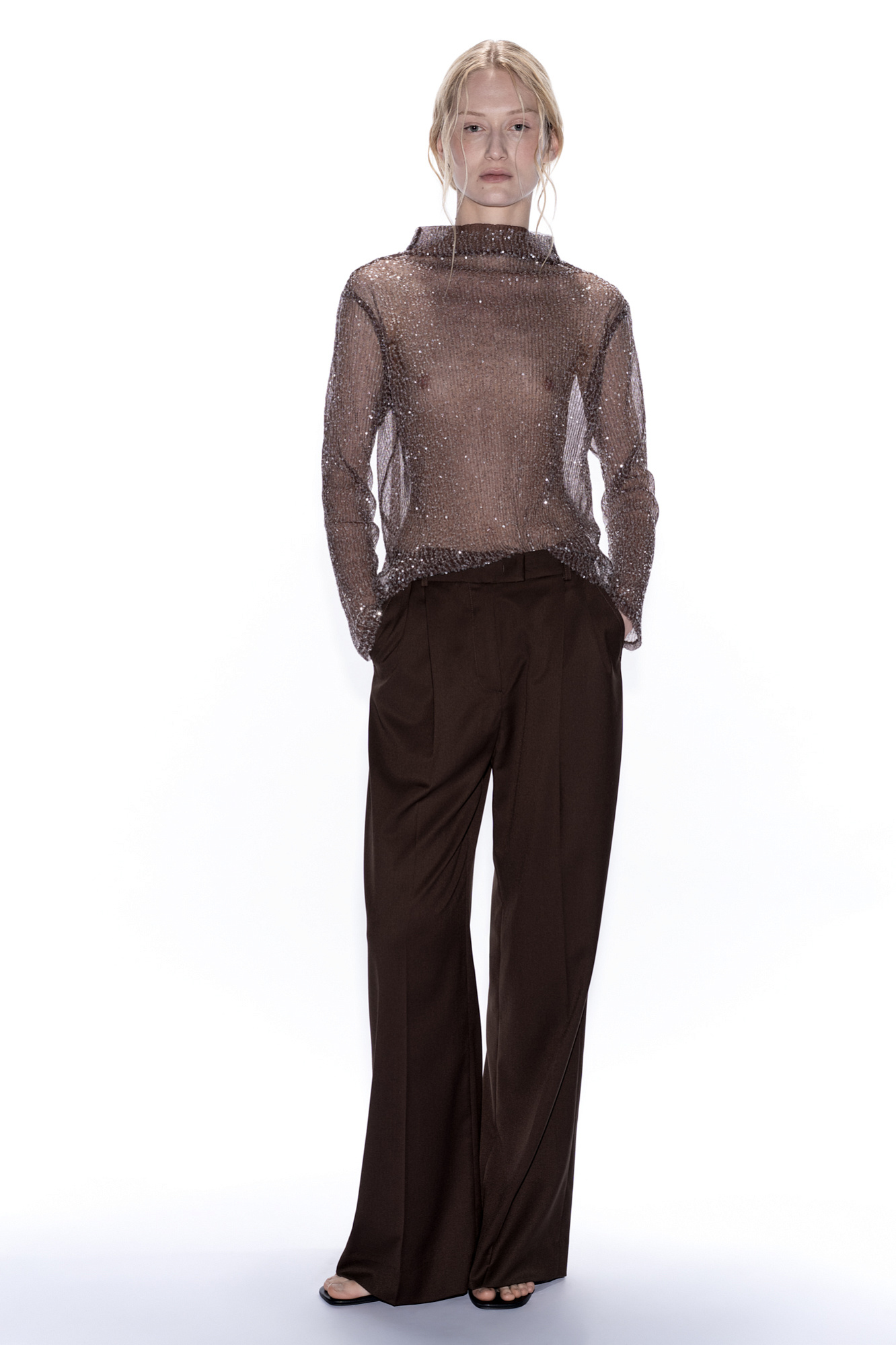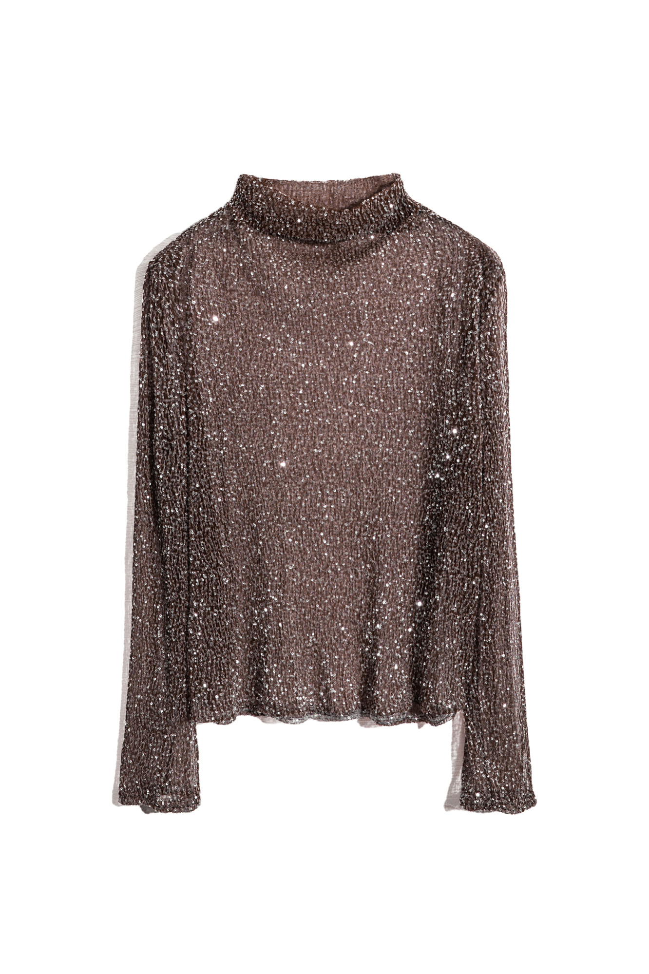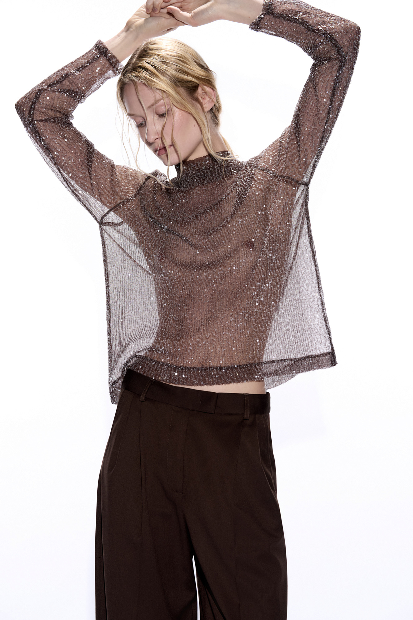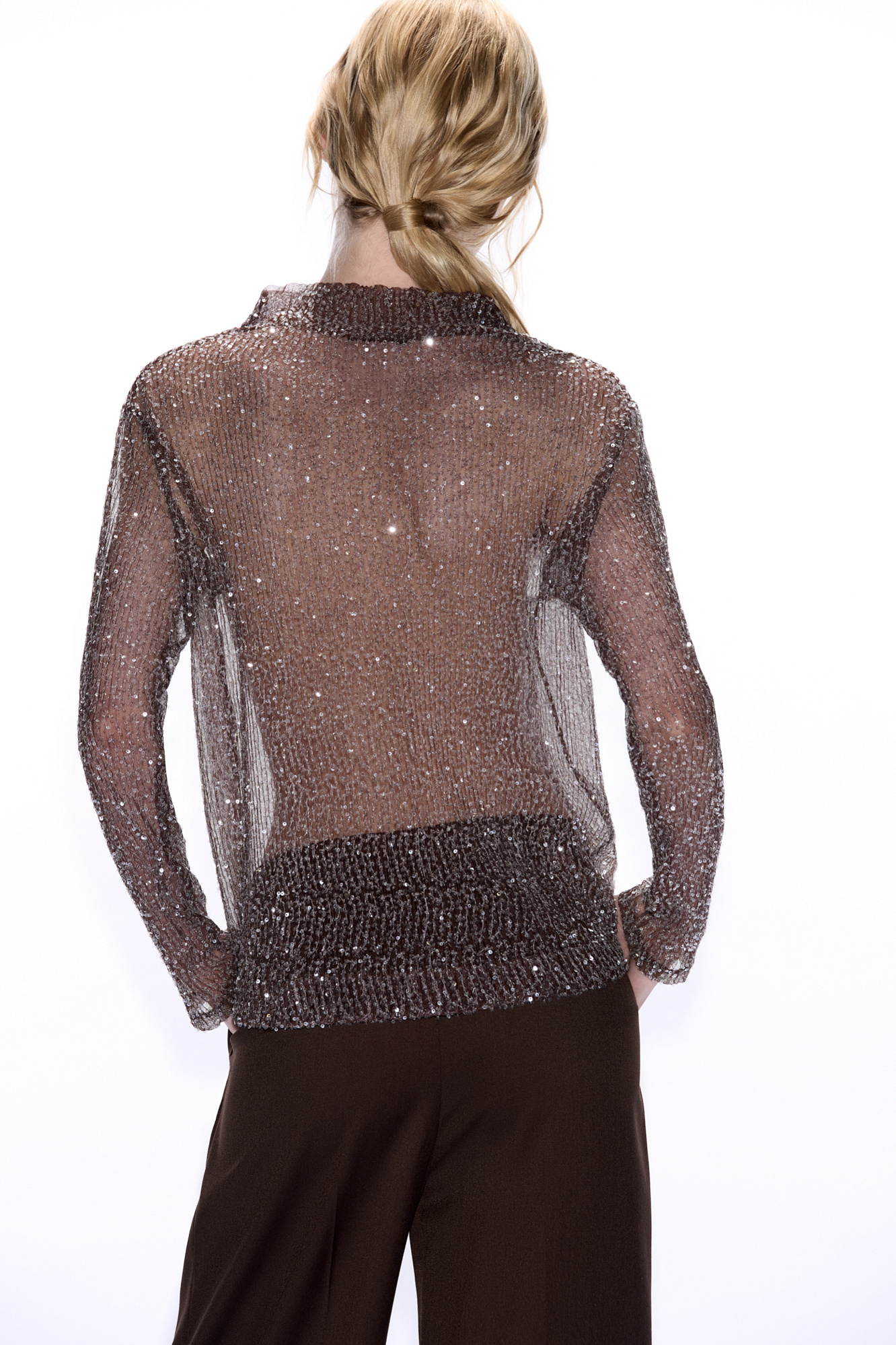 Прозрачный топ с длинными рукавами и воротником-стойкой. Модель декорирована пайетками.