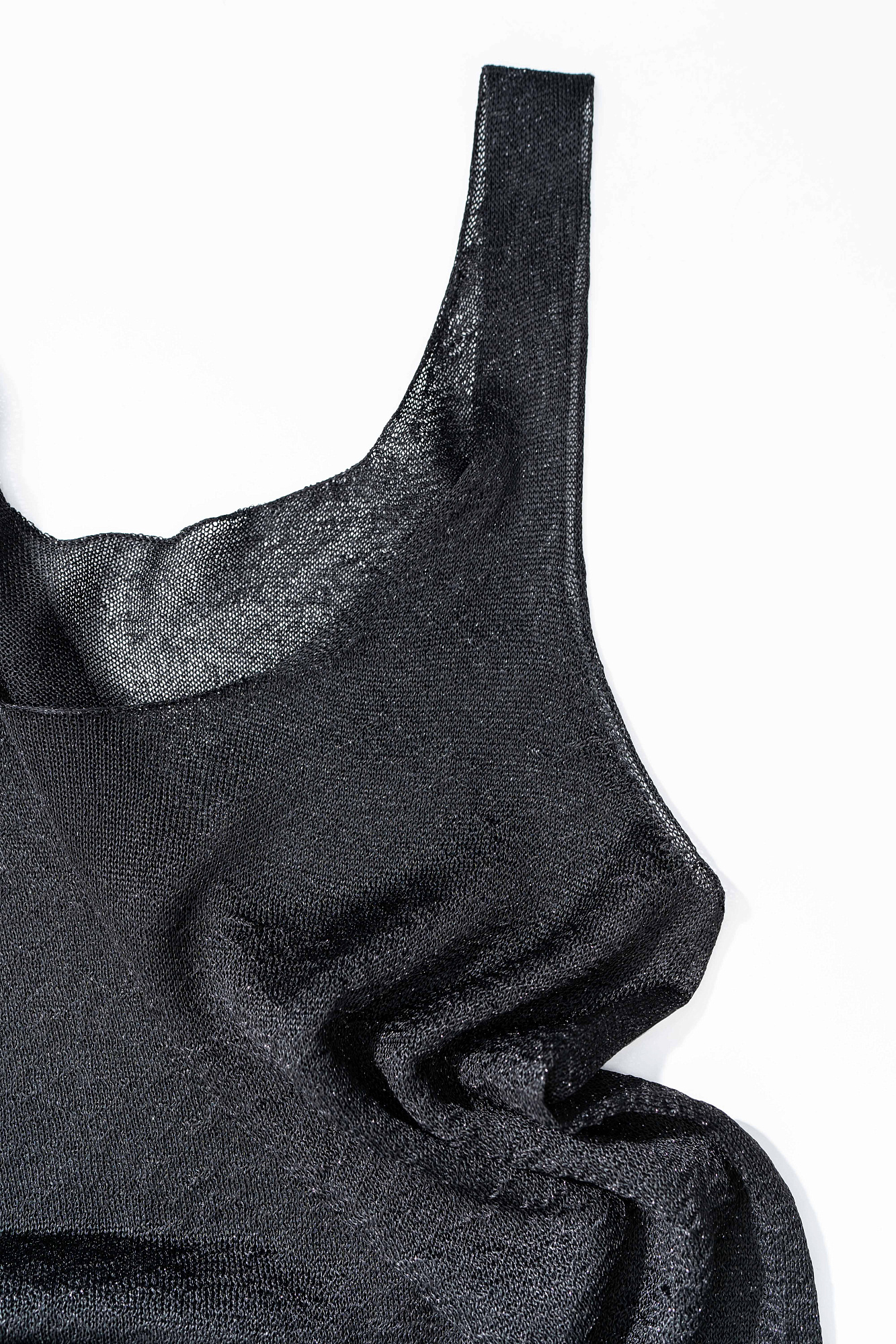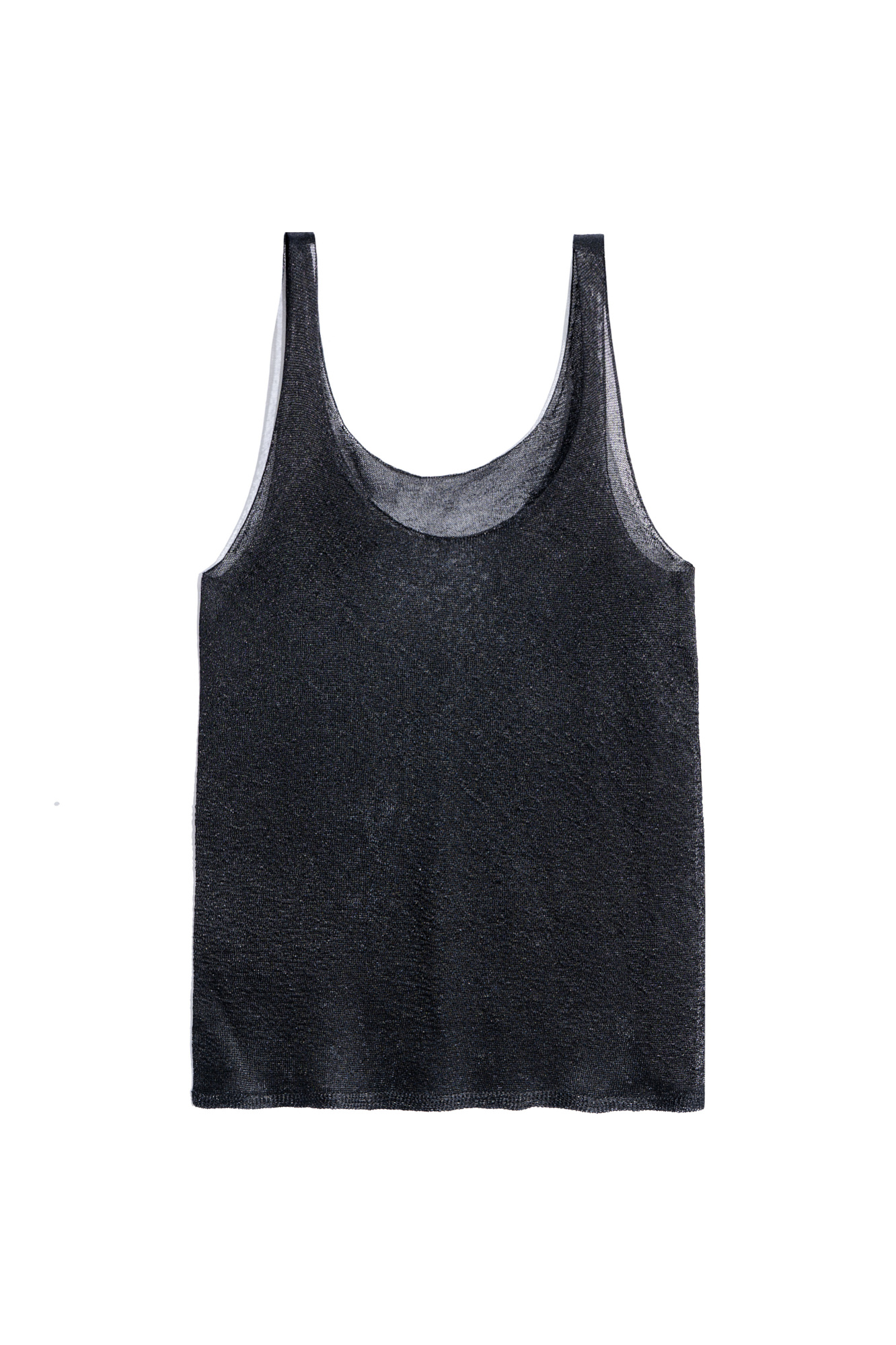 Полупрозрачная цельновязаная майка из вискозы с добавлением люрекса. Модель свободного силуэта на тонких бретельках и глубоким вырезом декольте.