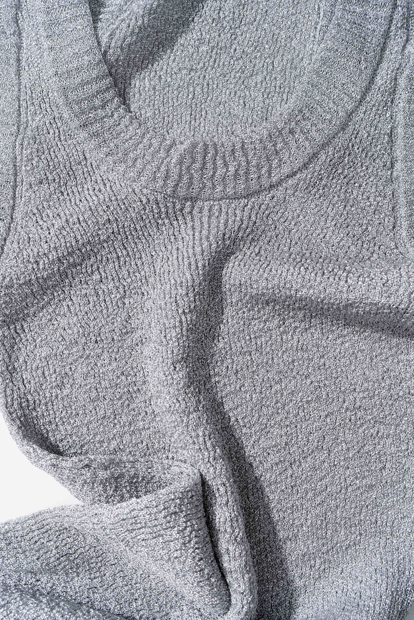 Трикотажный топ из вискозы с люрексом. Модель с U-образным вырезом горловины и широкими бретелями.