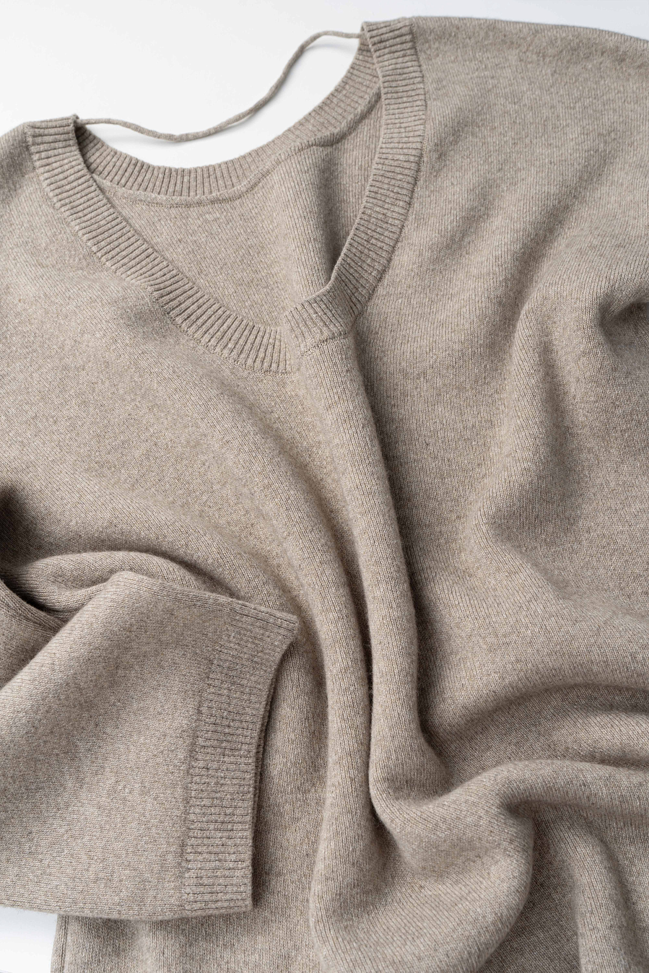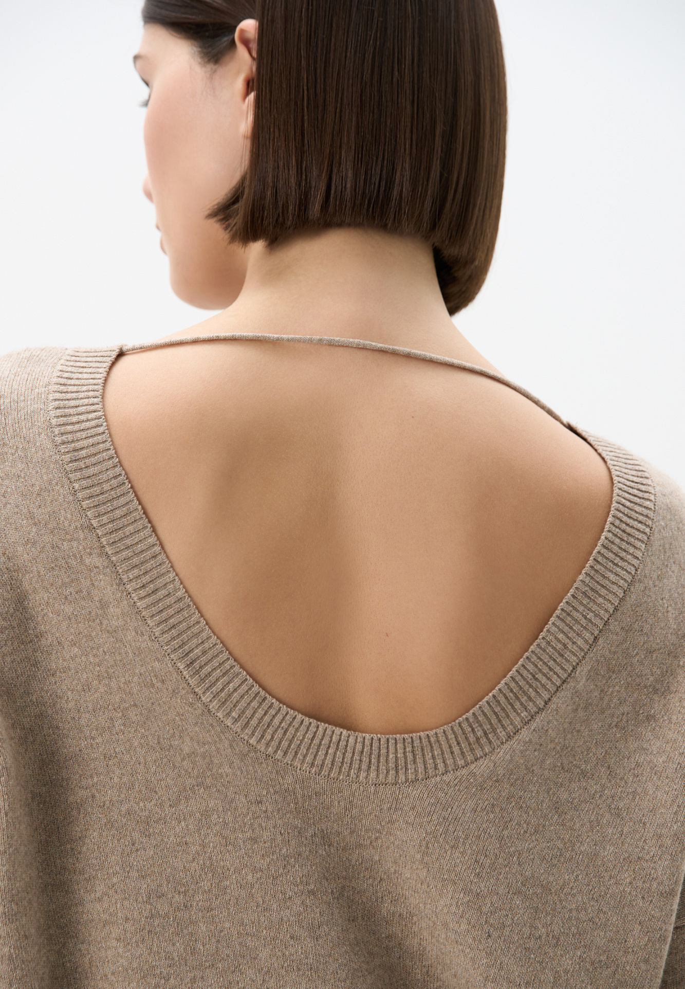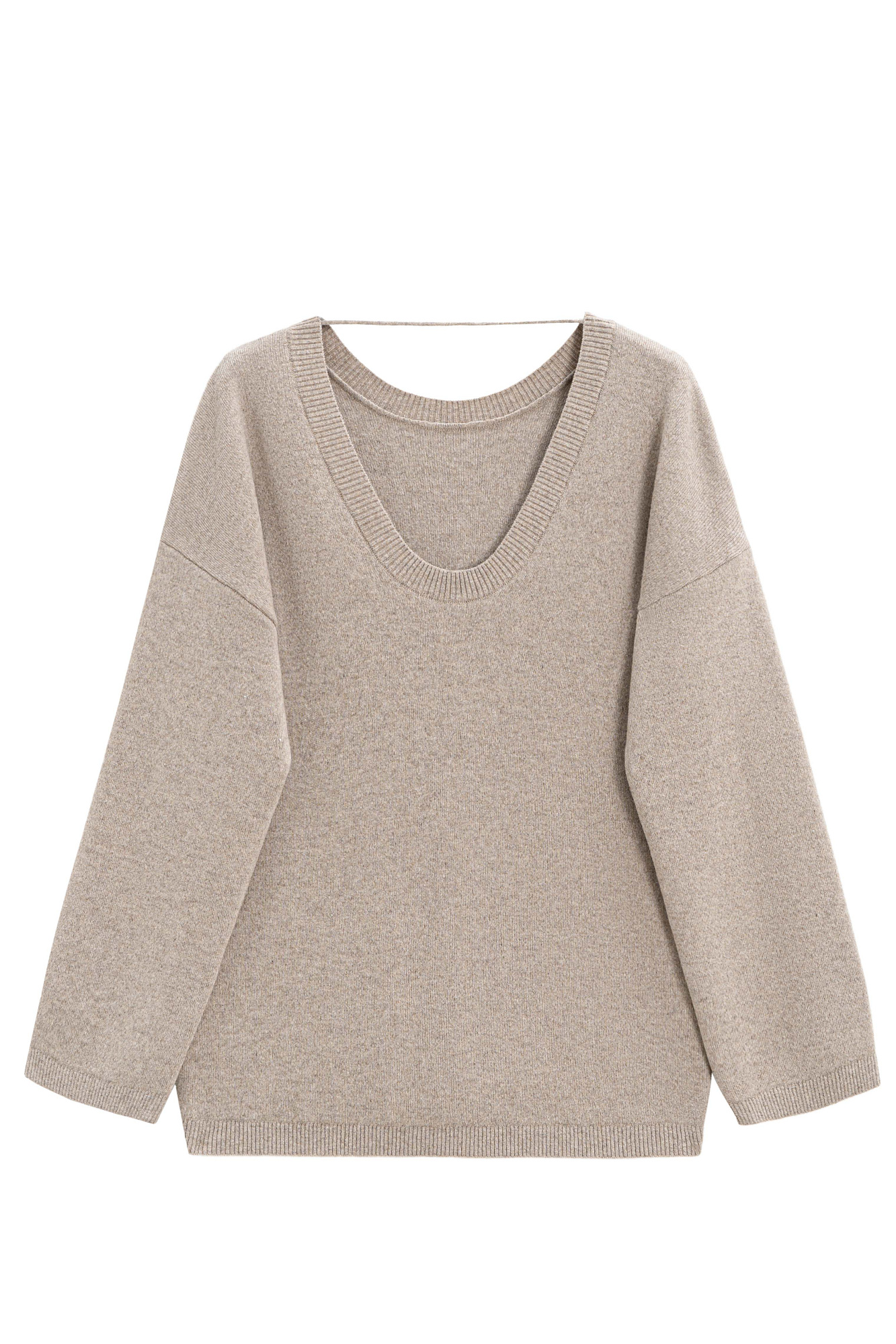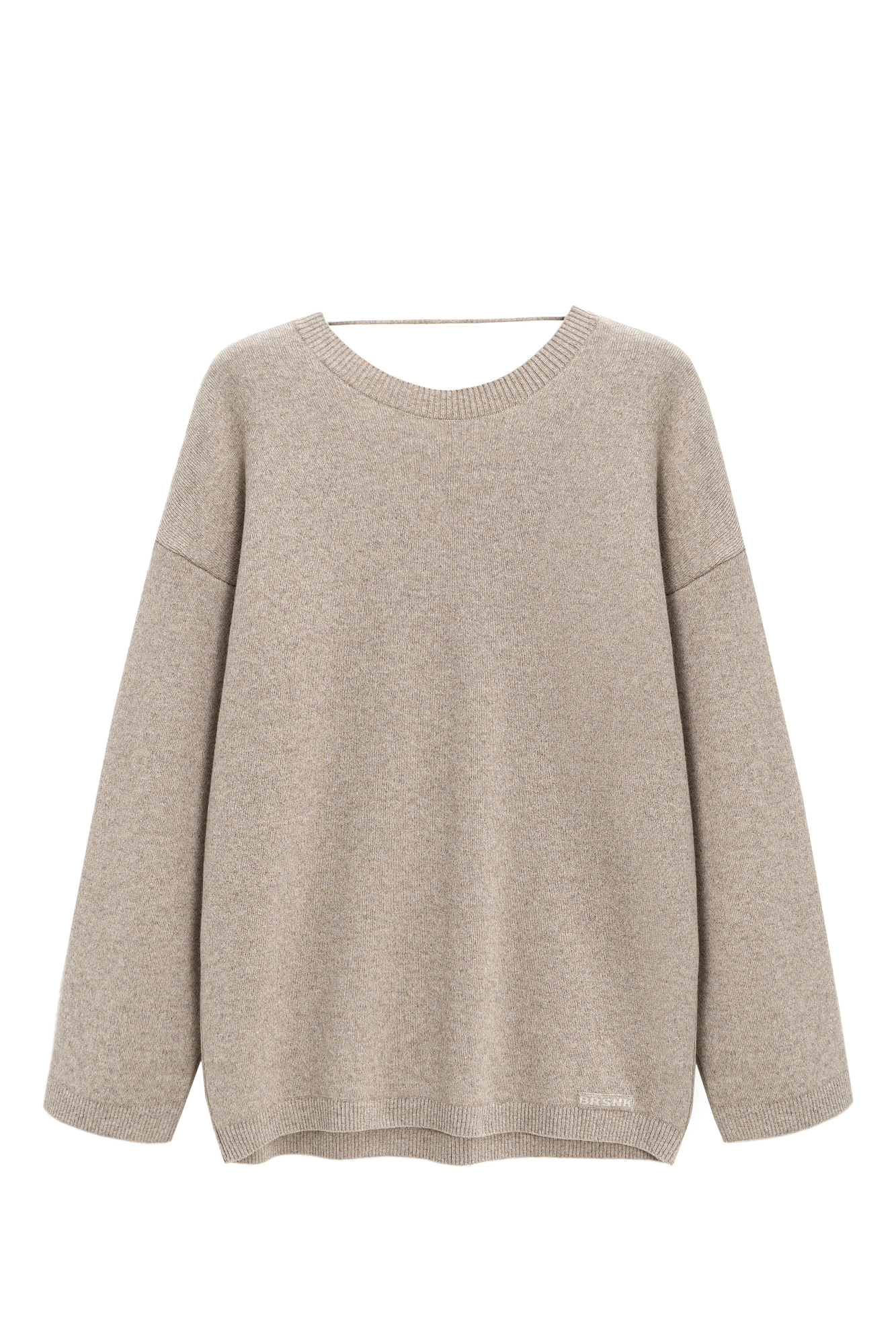 Трикотажный джемпер из кашемира и шерсти. Модель свободного силуэта с длинными рукавами и глубоким вырезом с перемычкой на спине. Края изделия выполнены в рубчик.