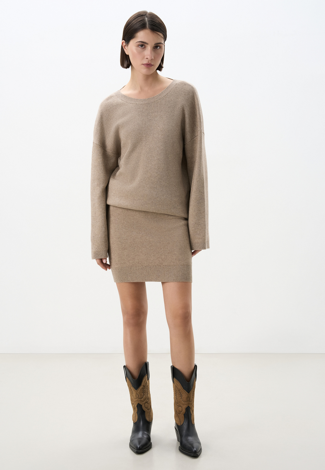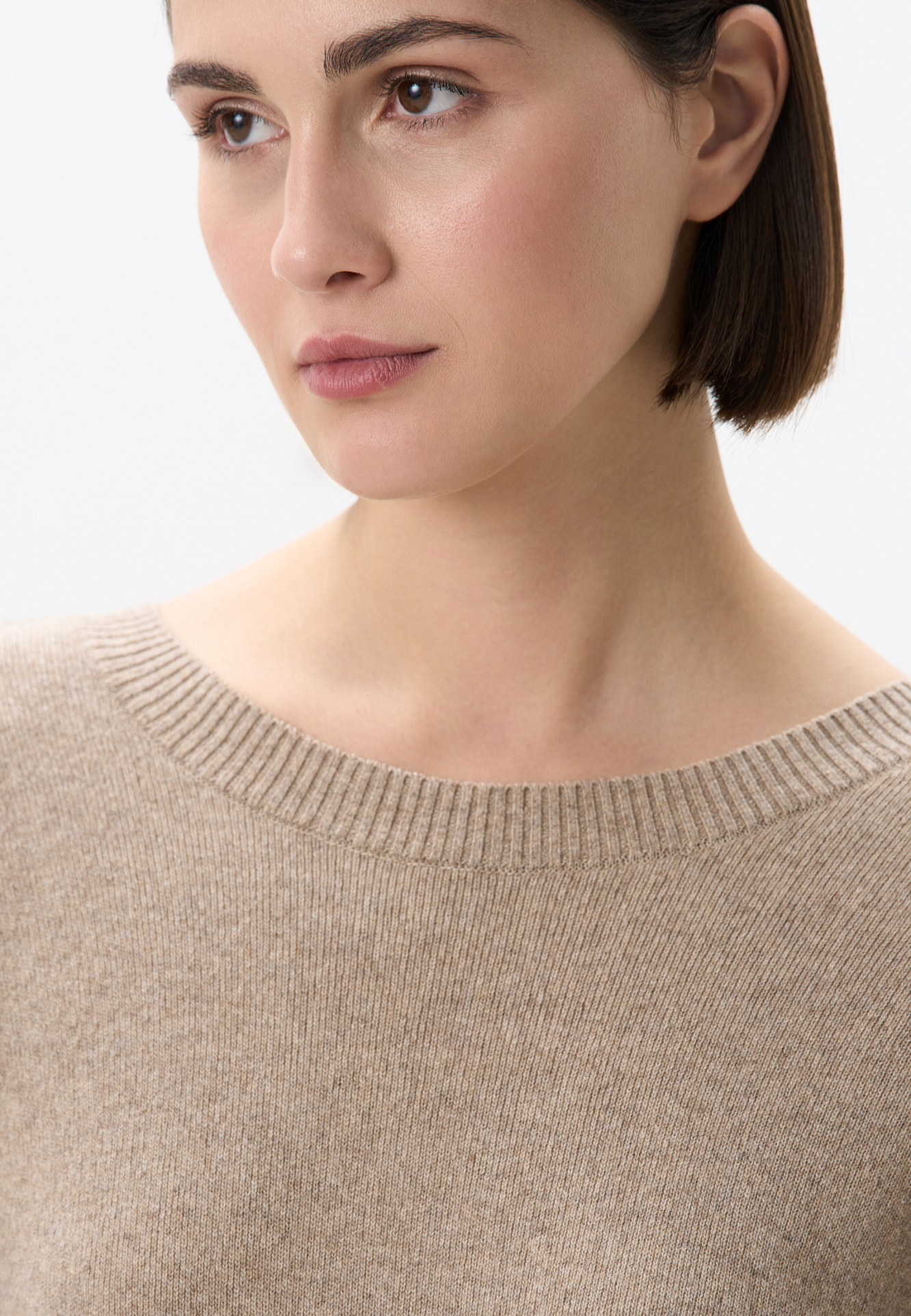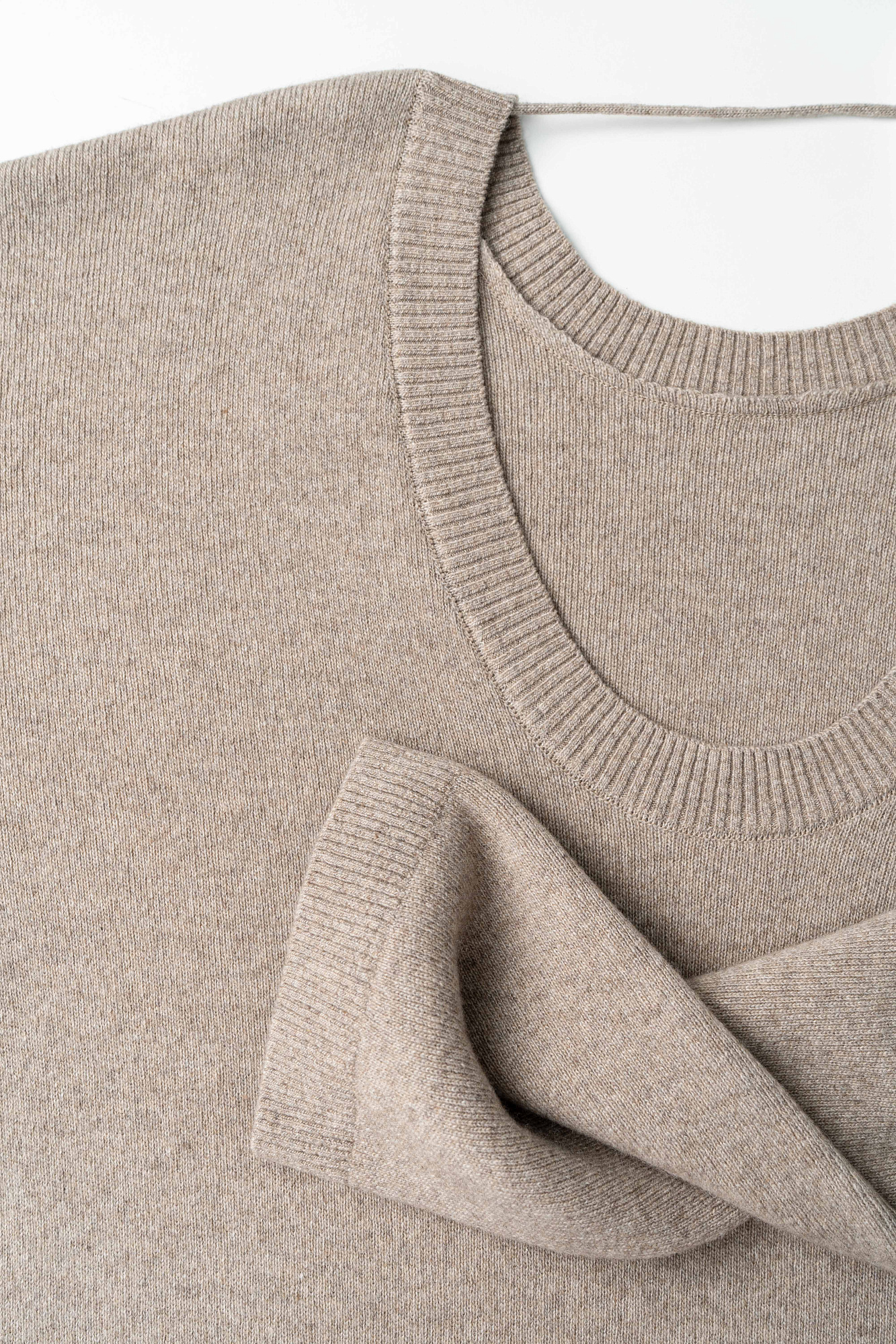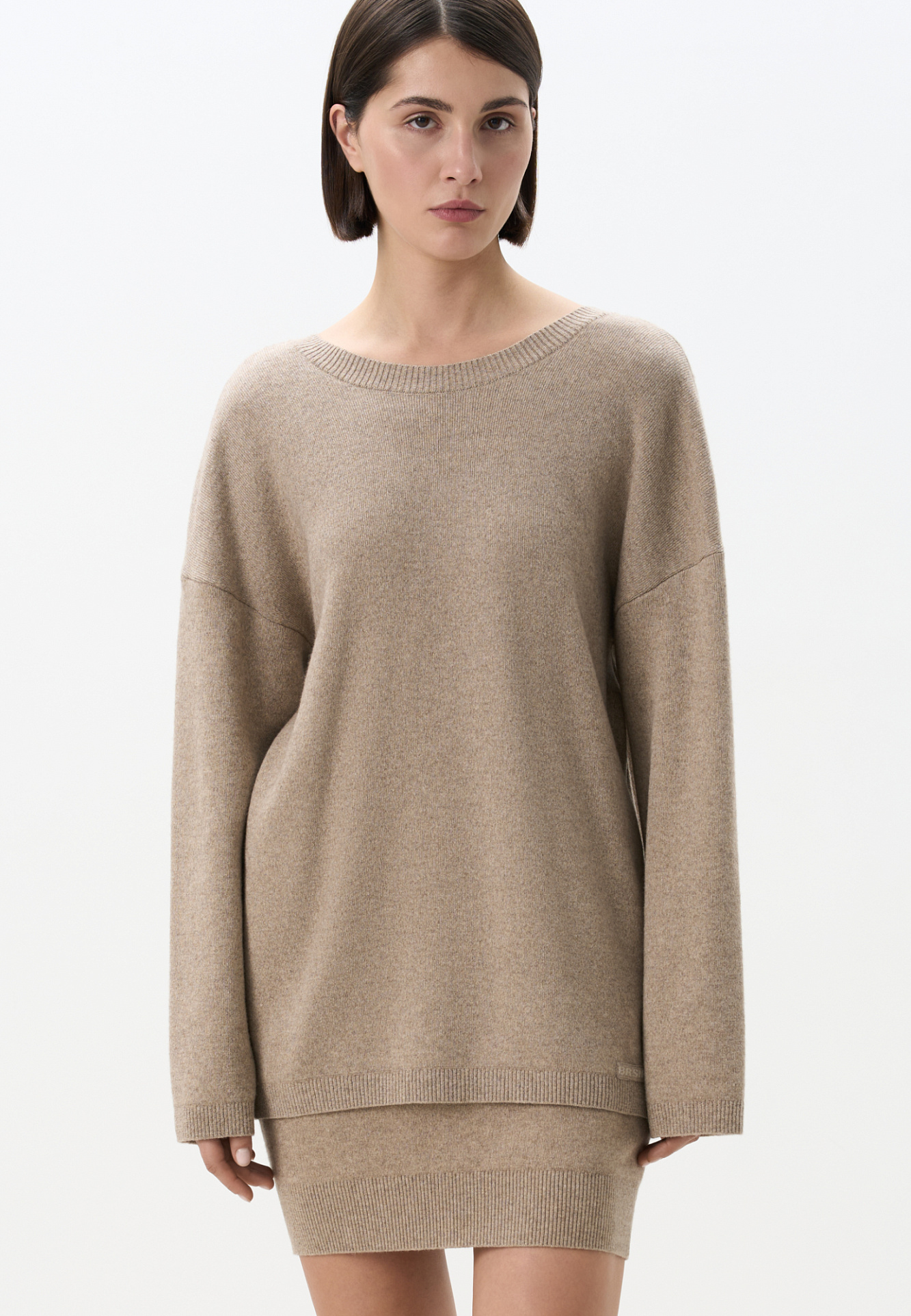 Трикотажный джемпер из кашемира и шерсти. Модель свободного силуэта с длинными рукавами и глубоким вырезом с перемычкой на спине. Края изделия выполнены в рубчик.
