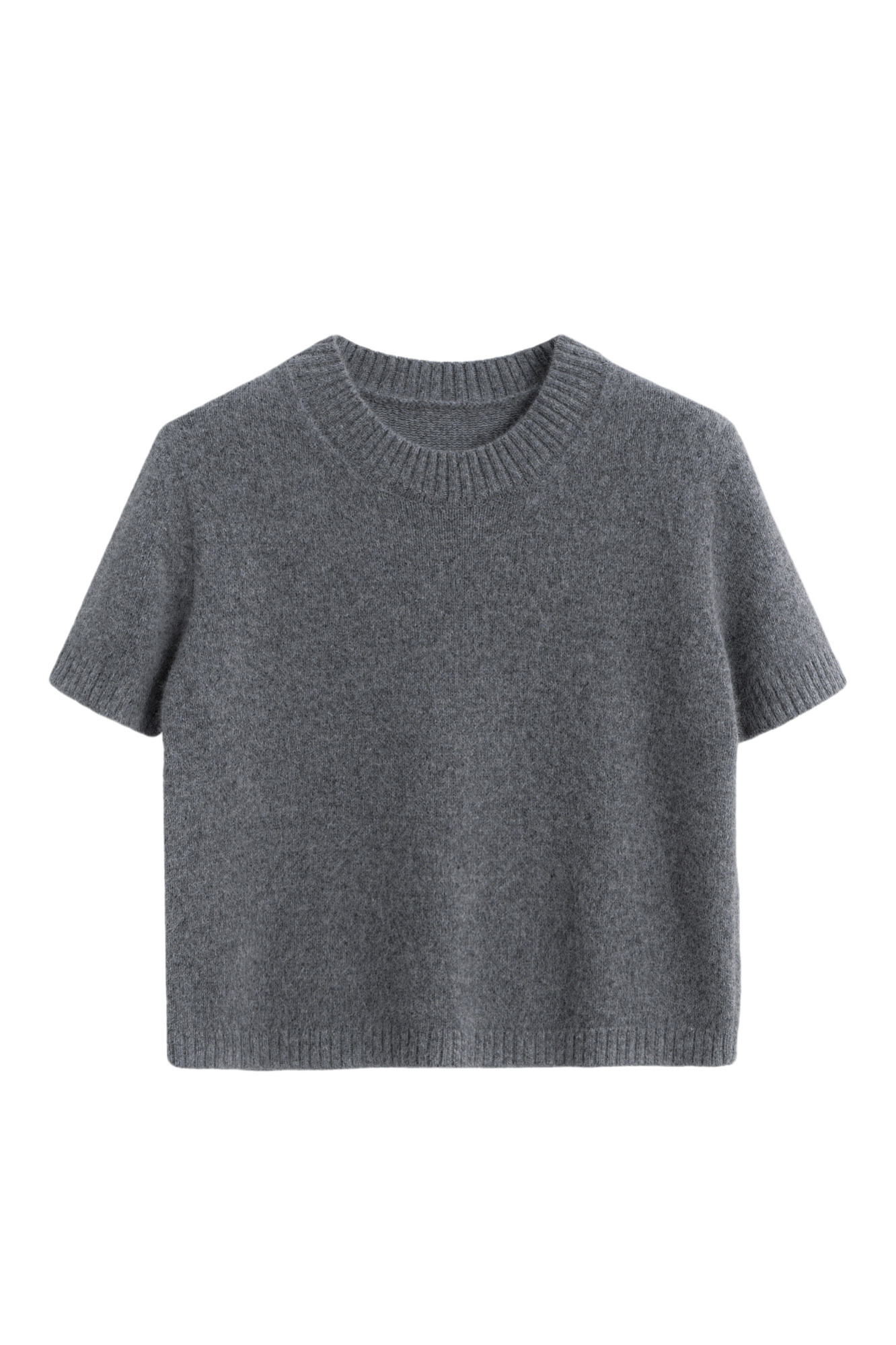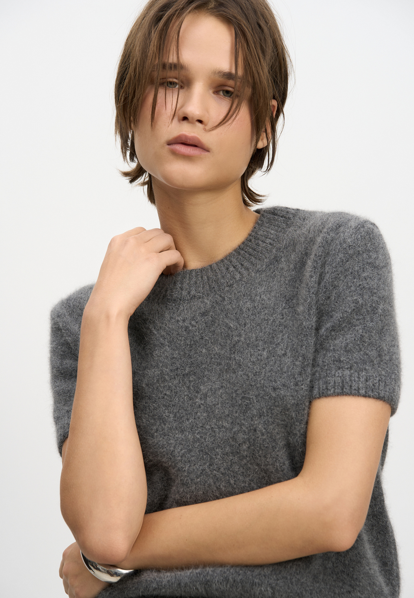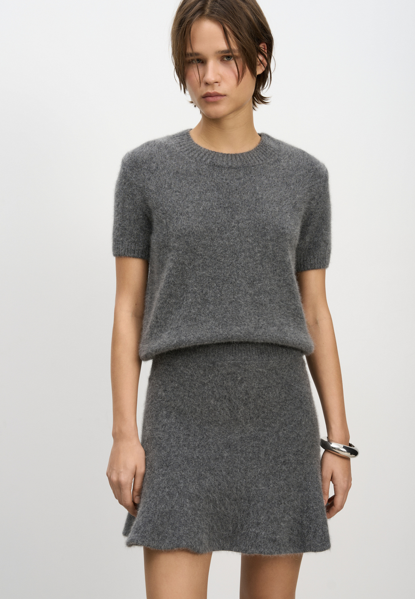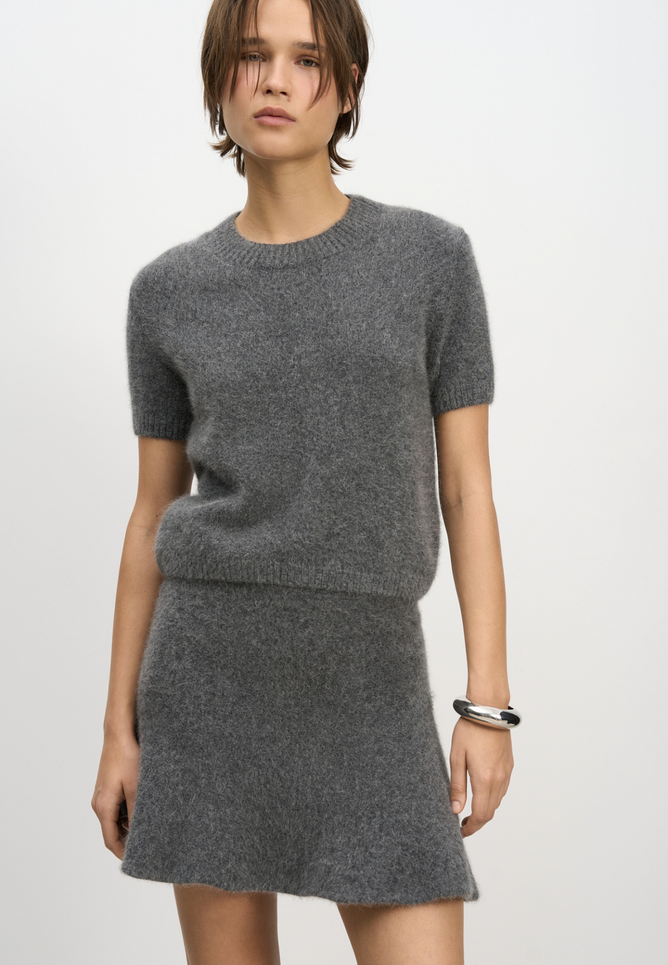 Трикотажная футболка из пуха лисы. Модель свободного силуэта, с коротким рукавом и круглым вырезом горловины. Края изделия выполнены в рубчик. Дополнить образ можно юбкой.